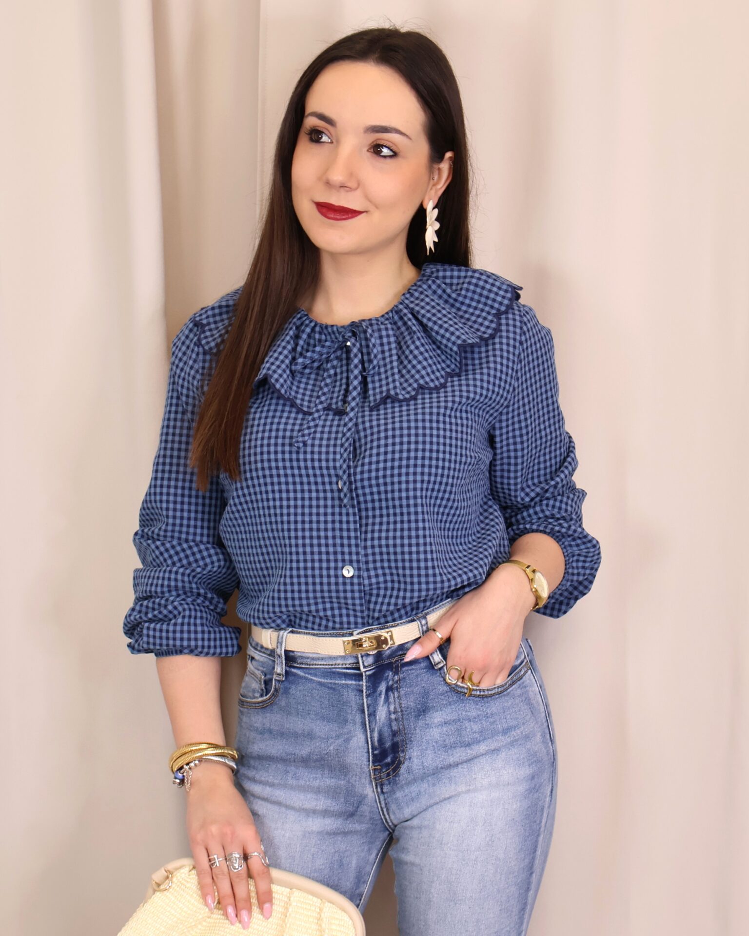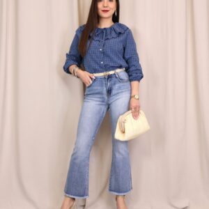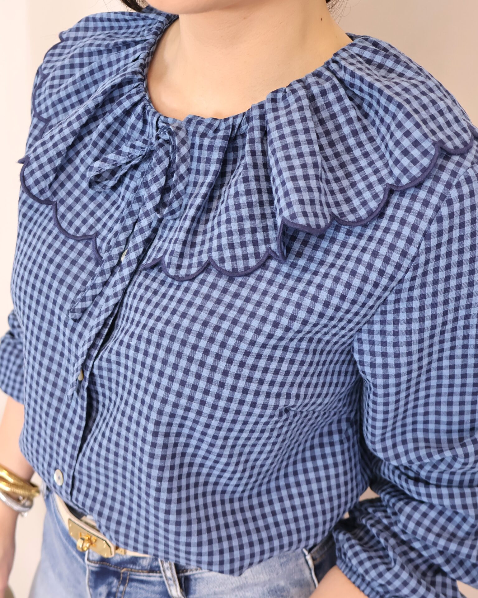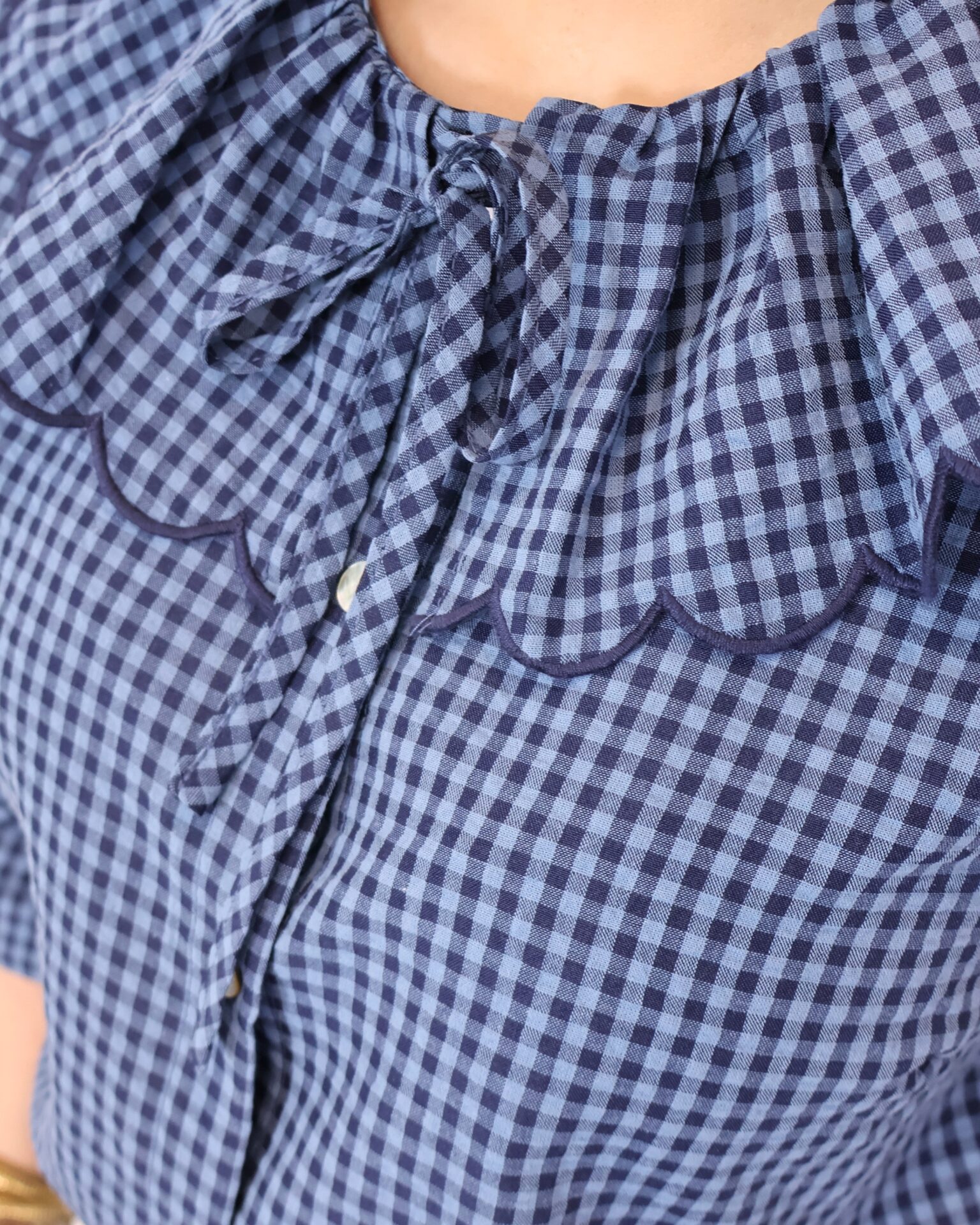 Camisa de estilo romántico en tejido ligero con estampado de cuadros vichy en tonos azules. Destaca por su amplio cuello con volante ondulado en todo el contorno (delantero y trasero) y lazada fina en el cuello, además de cierre frontal con botones. De manga larga con puños con goma y acabado ligeramente fruncido, es una prenda femenina y versátil ideal para looks de diario con un toque especial.