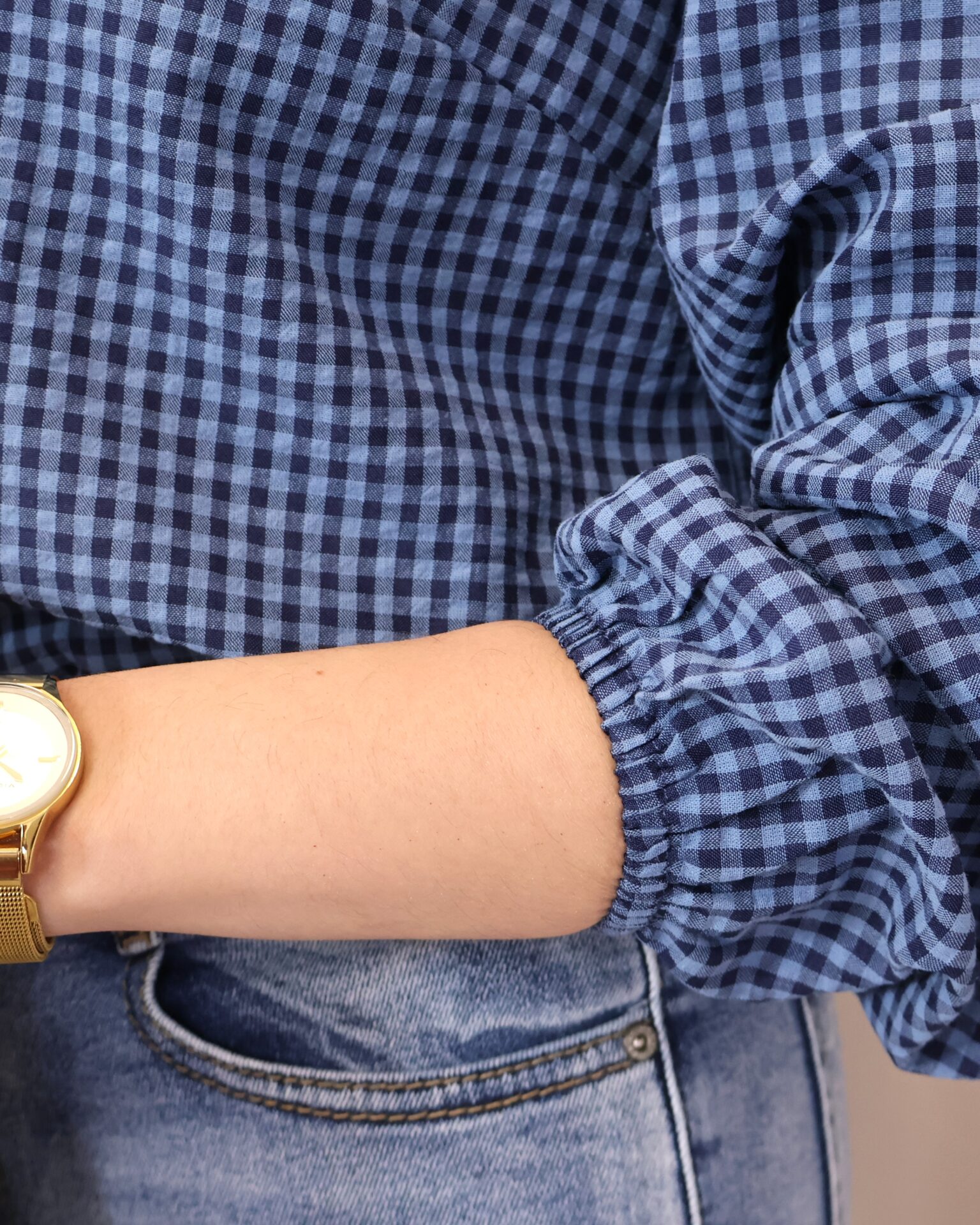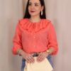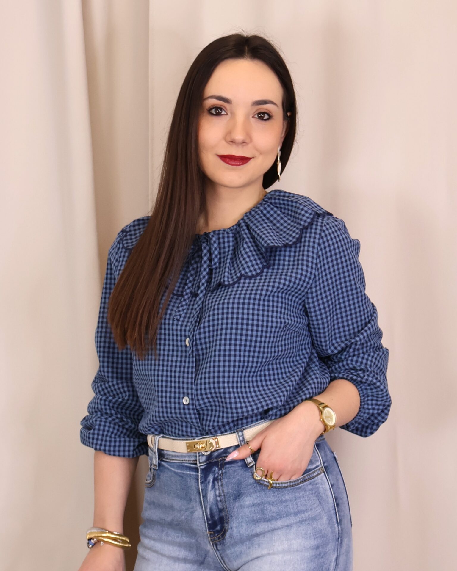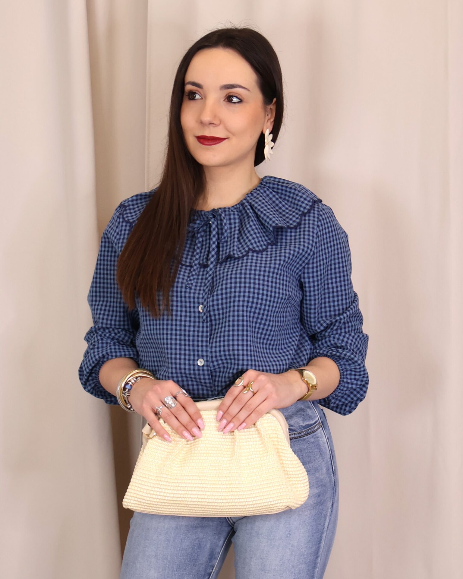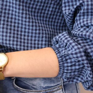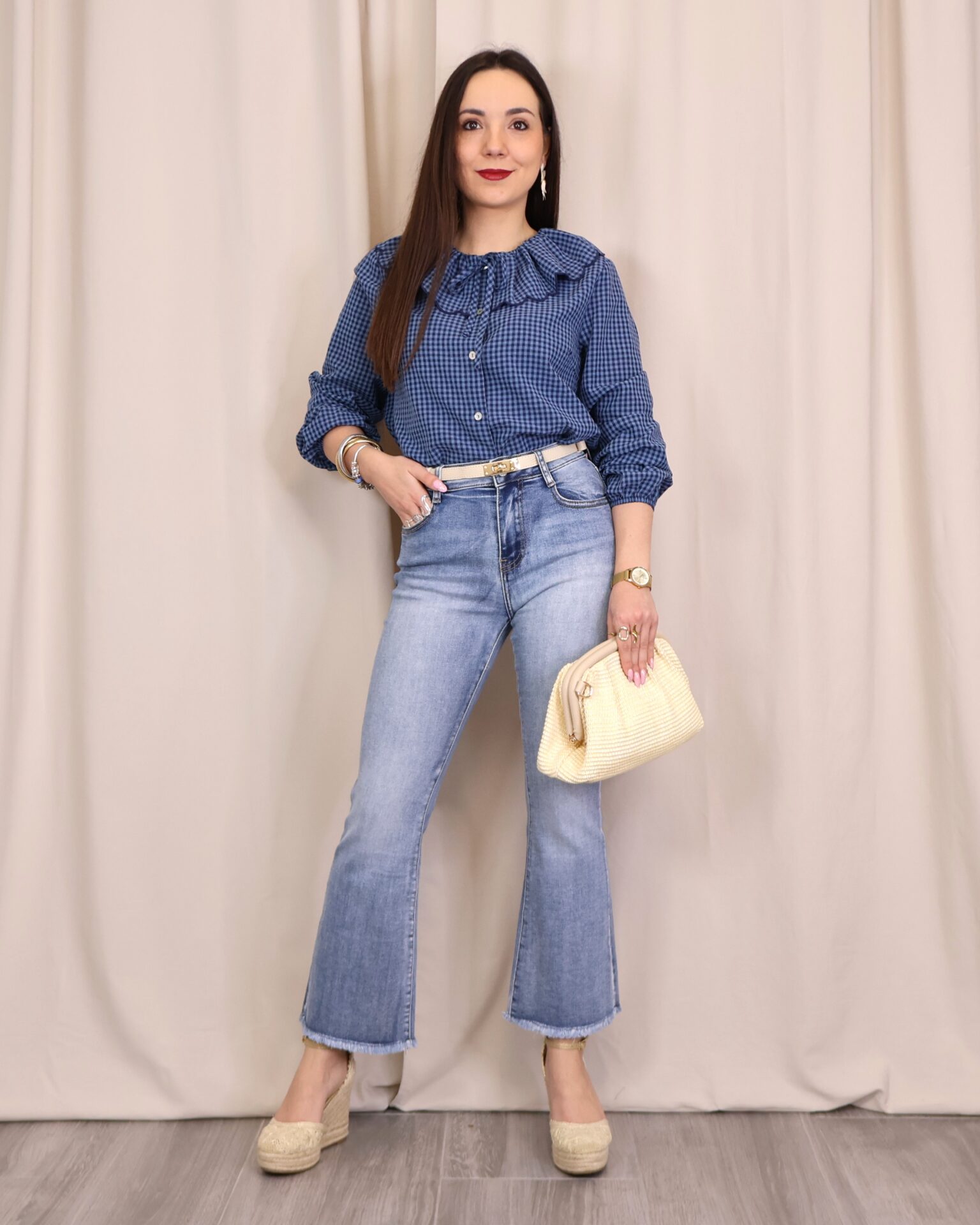 Camisa de estilo romántico en tejido ligero con estampado de cuadros vichy en tonos azules. Destaca por su amplio cuello con volante ondulado en todo el contorno (delantero y trasero) y lazada fina en el cuello, además de cierre frontal con botones. De manga larga con puños con goma y acabado ligeramente fruncido, es una prenda femenina y versátil ideal para looks de diario con un toque especial.