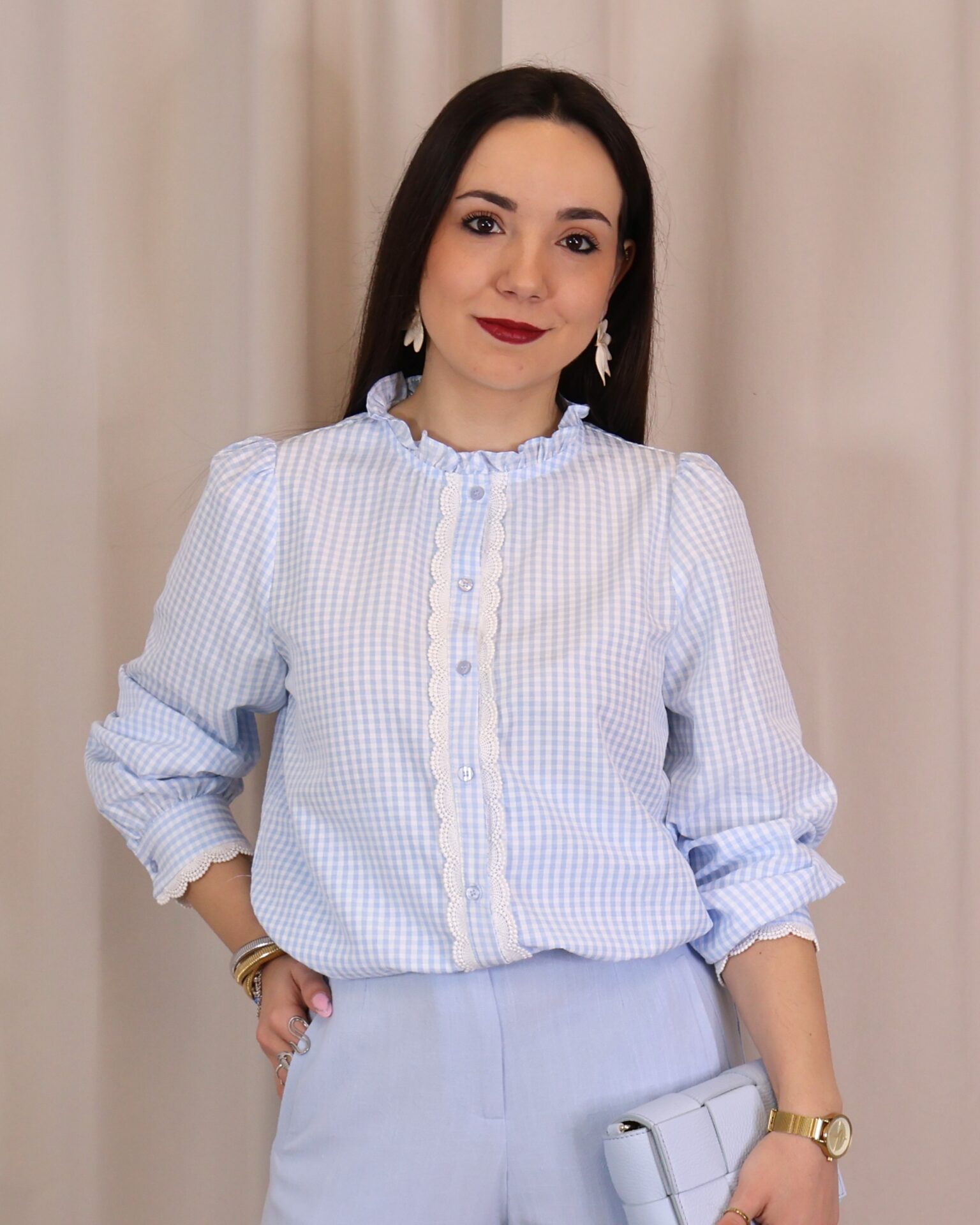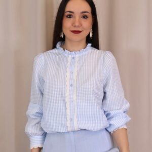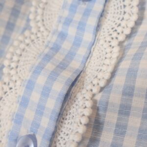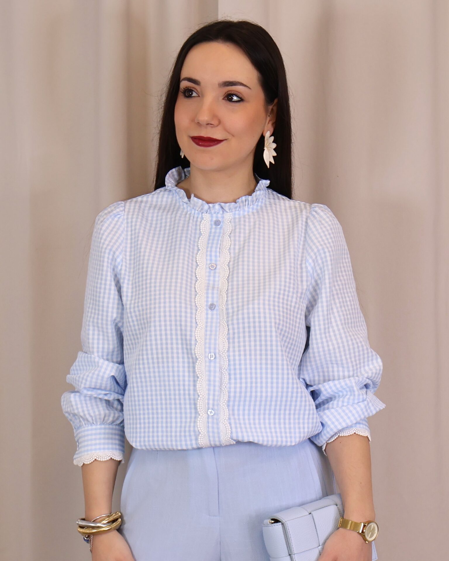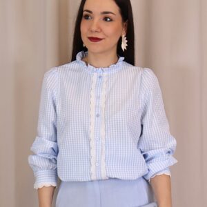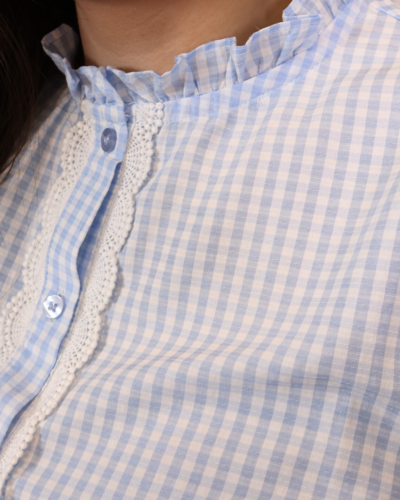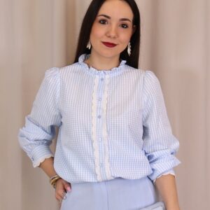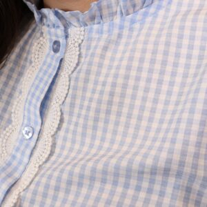 Camisa de estampado vichy en blanco y azul celeste, con cuello acabado en delicada puntilla. Cuenta con cierre abotonado de arriba a abajo, decorado con puntilla a lo largo de todo el recorrido de los botones, aportando un toque romántico y detallista. Los puños también están rematados con puntilla, completando un diseño femenino y elegante.