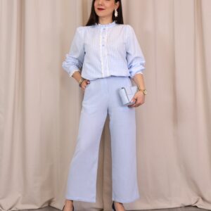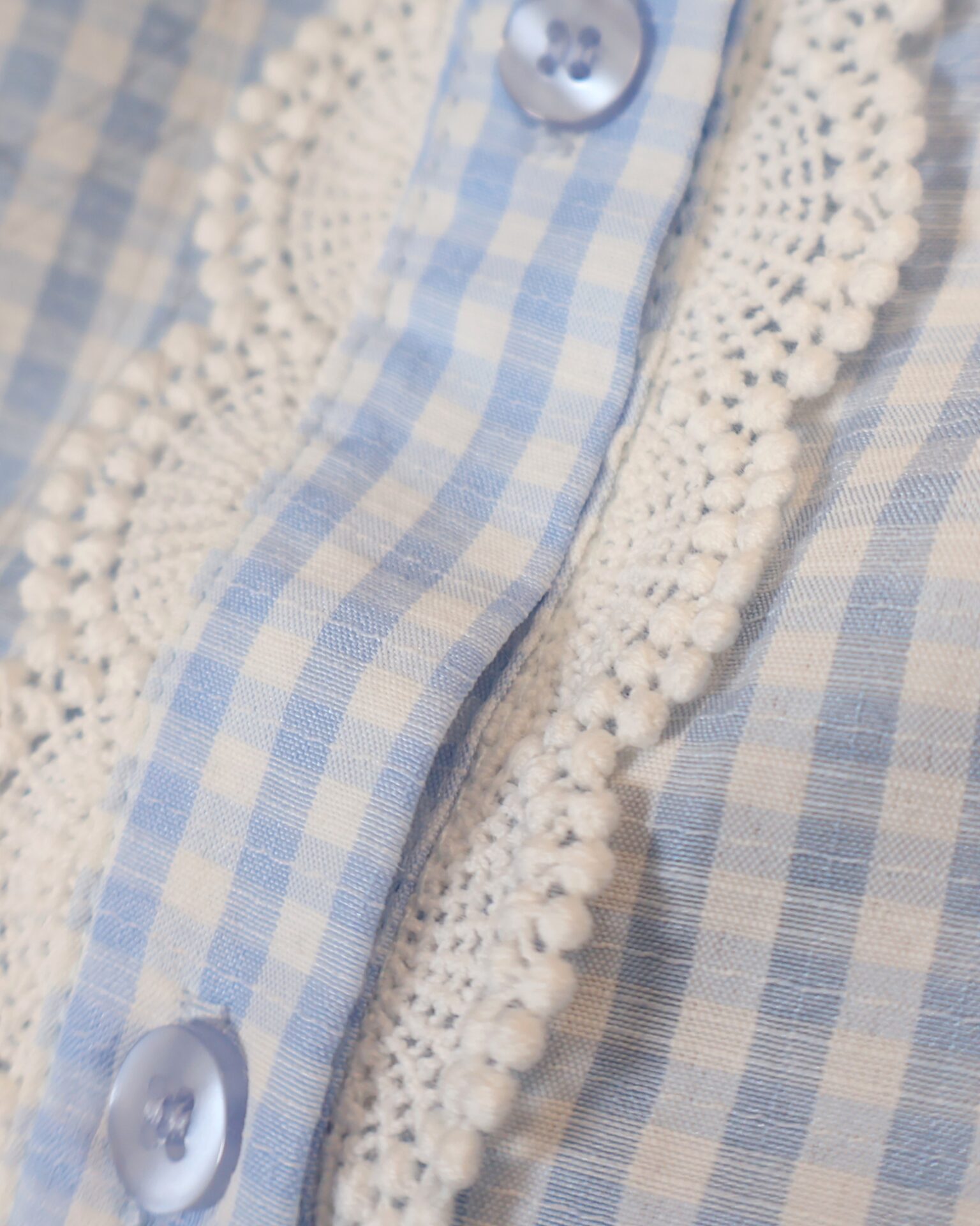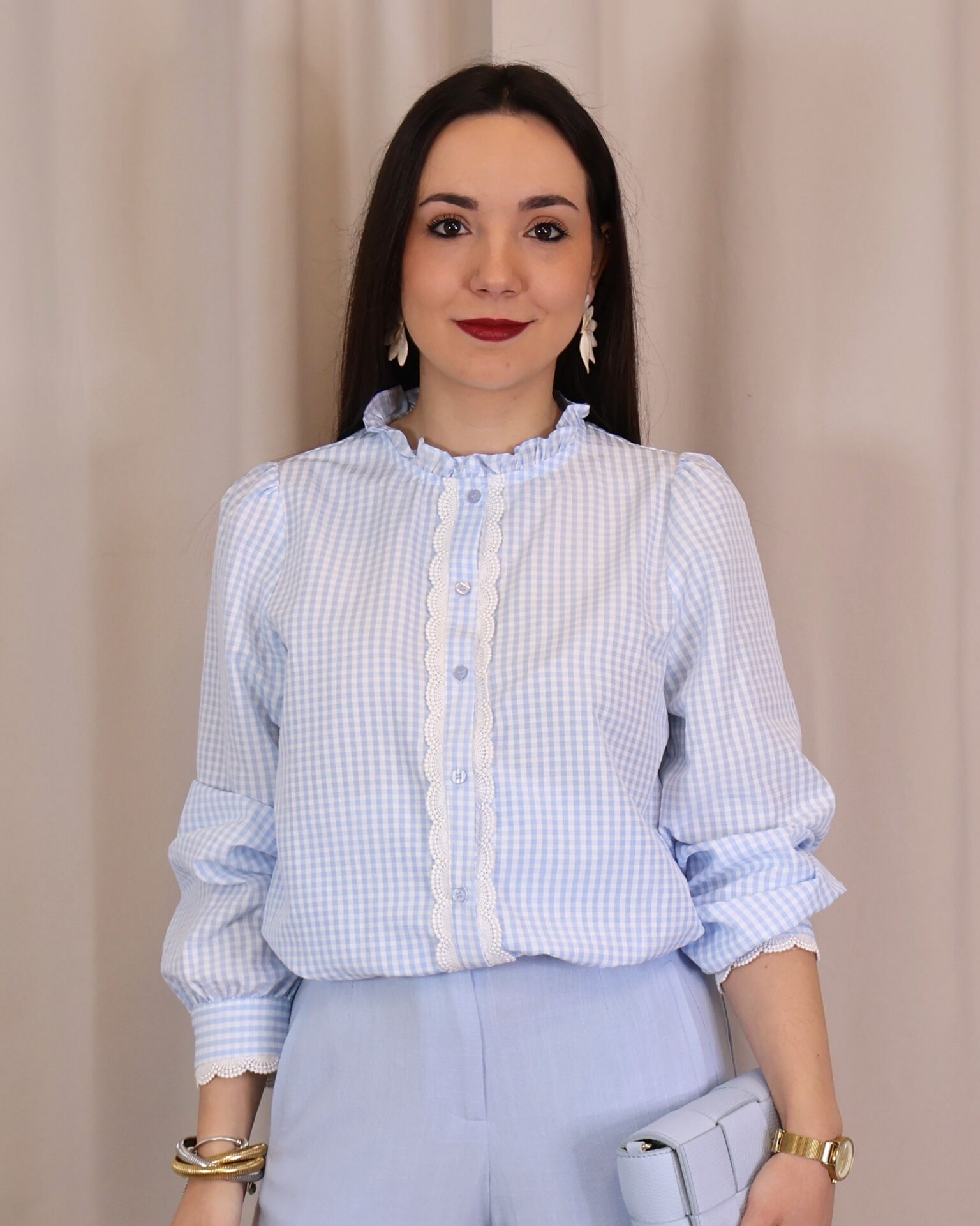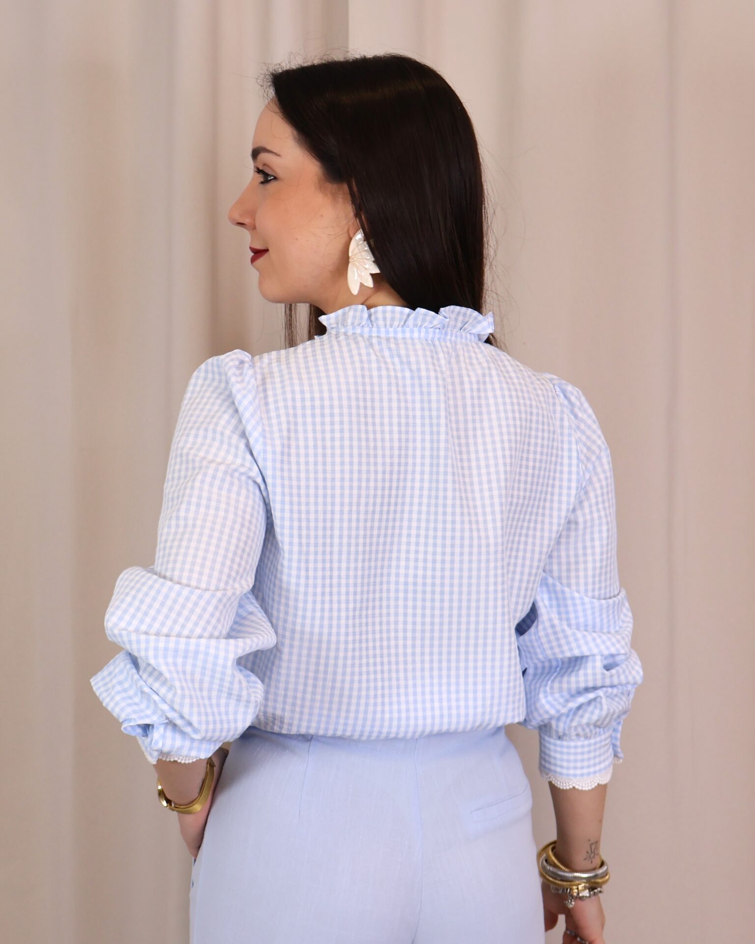 Camisa de estampado vichy en blanco y azul celeste, con cuello acabado en delicada puntilla. Cuenta con cierre abotonado de arriba a abajo, decorado con puntilla a lo largo de todo el recorrido de los botones, aportando un toque romántico y detallista. Los puños también están rematados con puntilla, completando un diseño femenino y elegante.