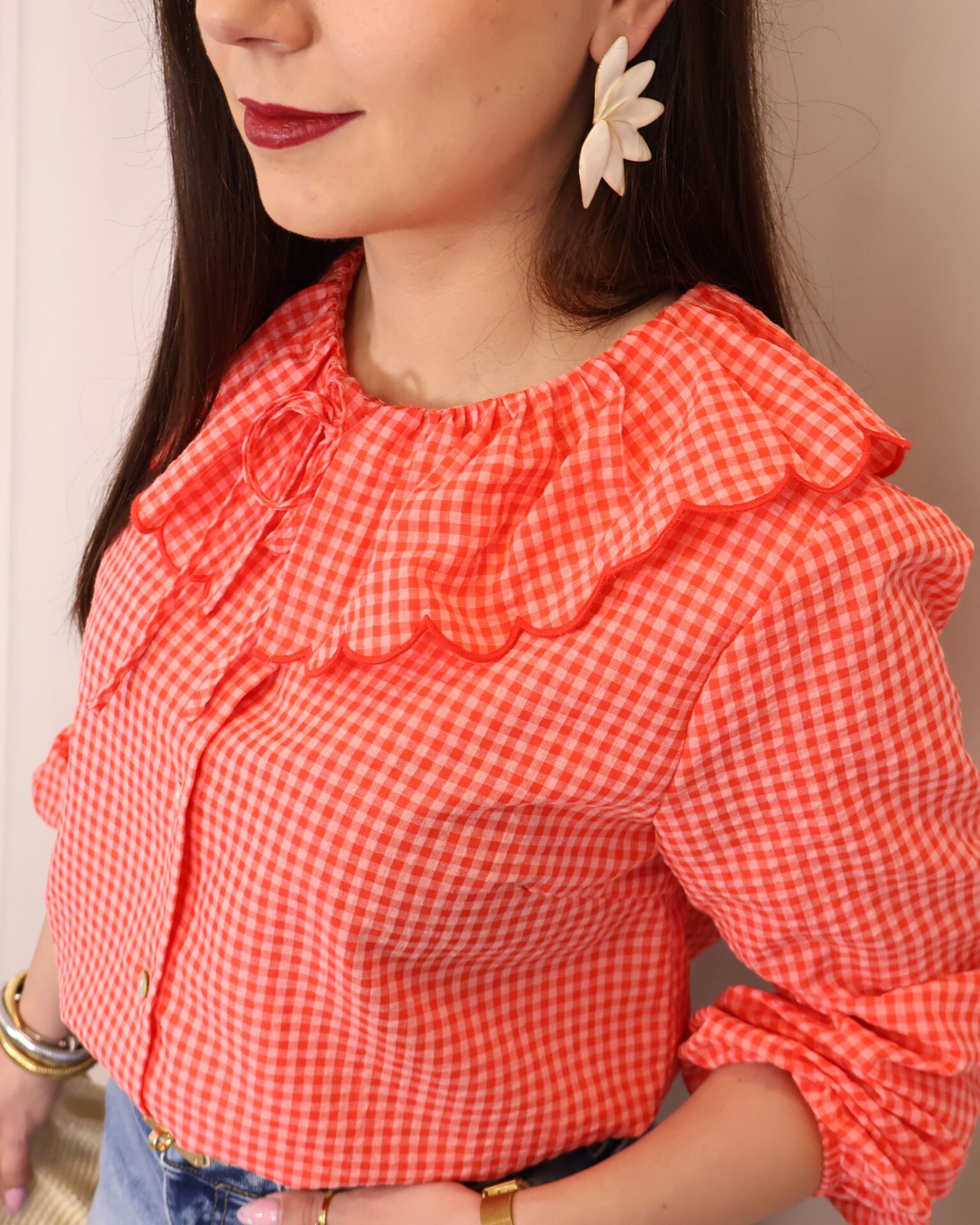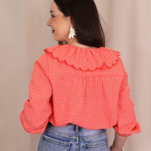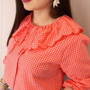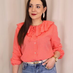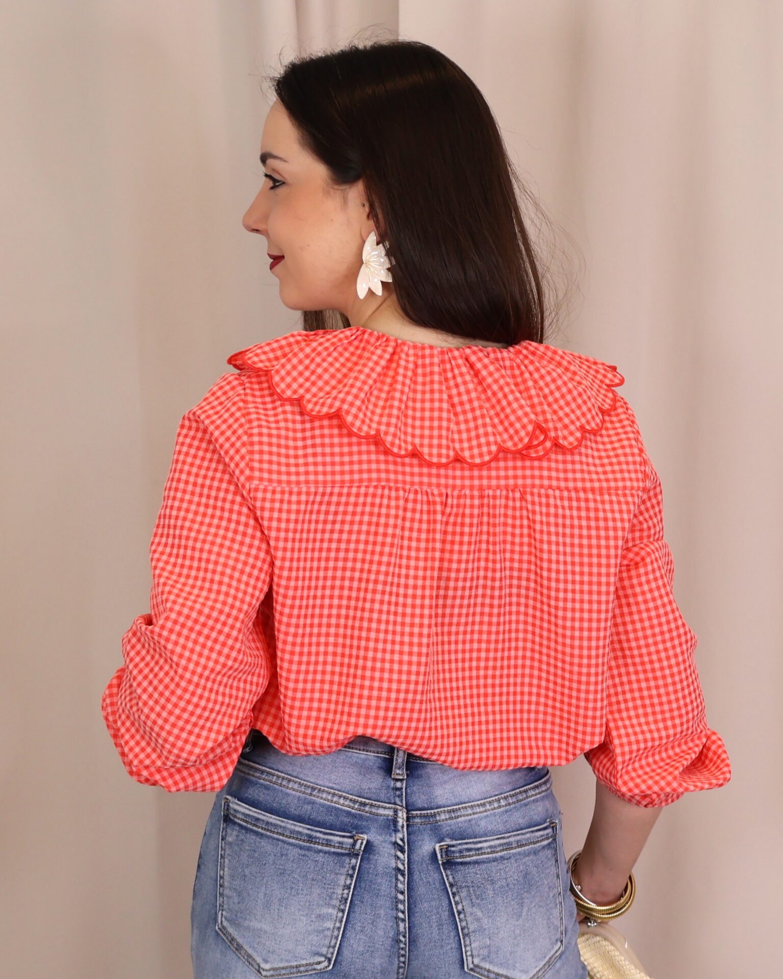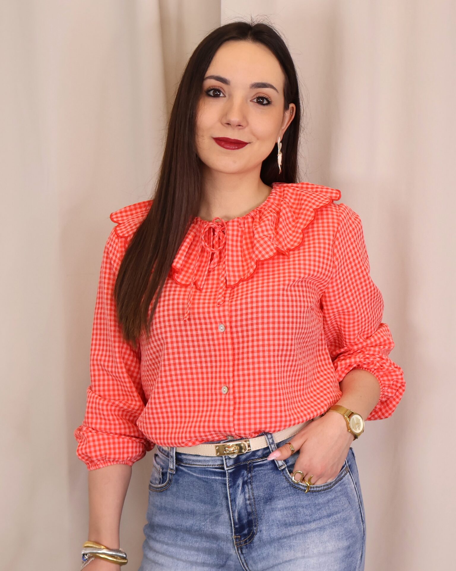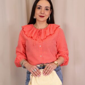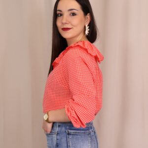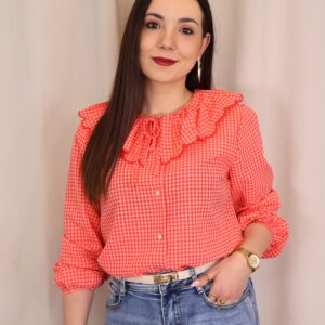 Camisa de estilo romántico en tejido ligero con estampado de cuadros vichy en tono coral. Destaca por su amplio cuello con volante ondulado en todo el contorno (delantero y trasero) y lazada fina en el cuello, además de cierre frontal con botones. De manga larga con puños con goma y acabado ligeramente fruncido, es una prenda femenina y versátil ideal para looks de diario con un toque especial.