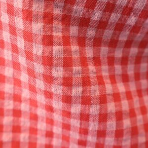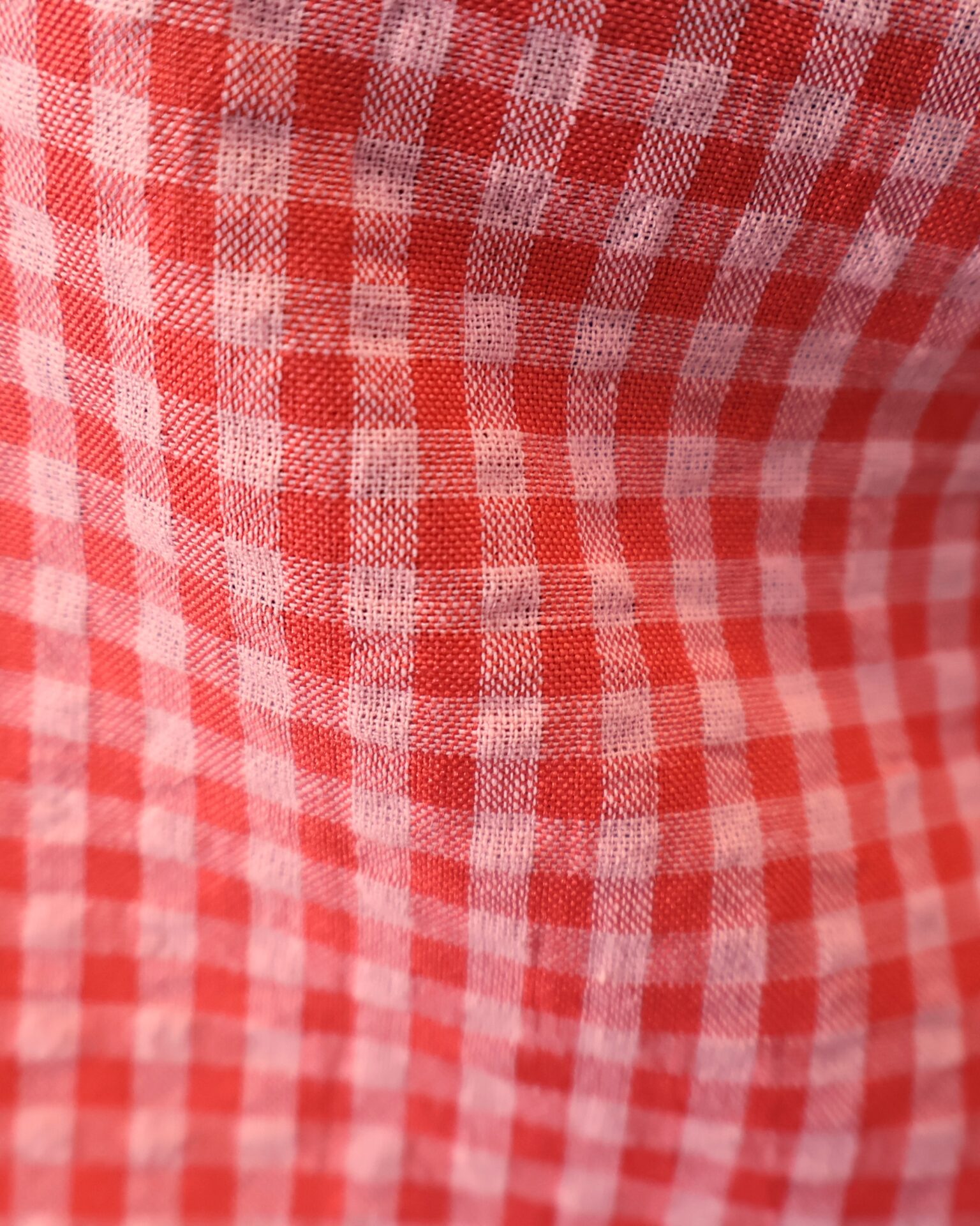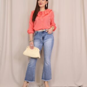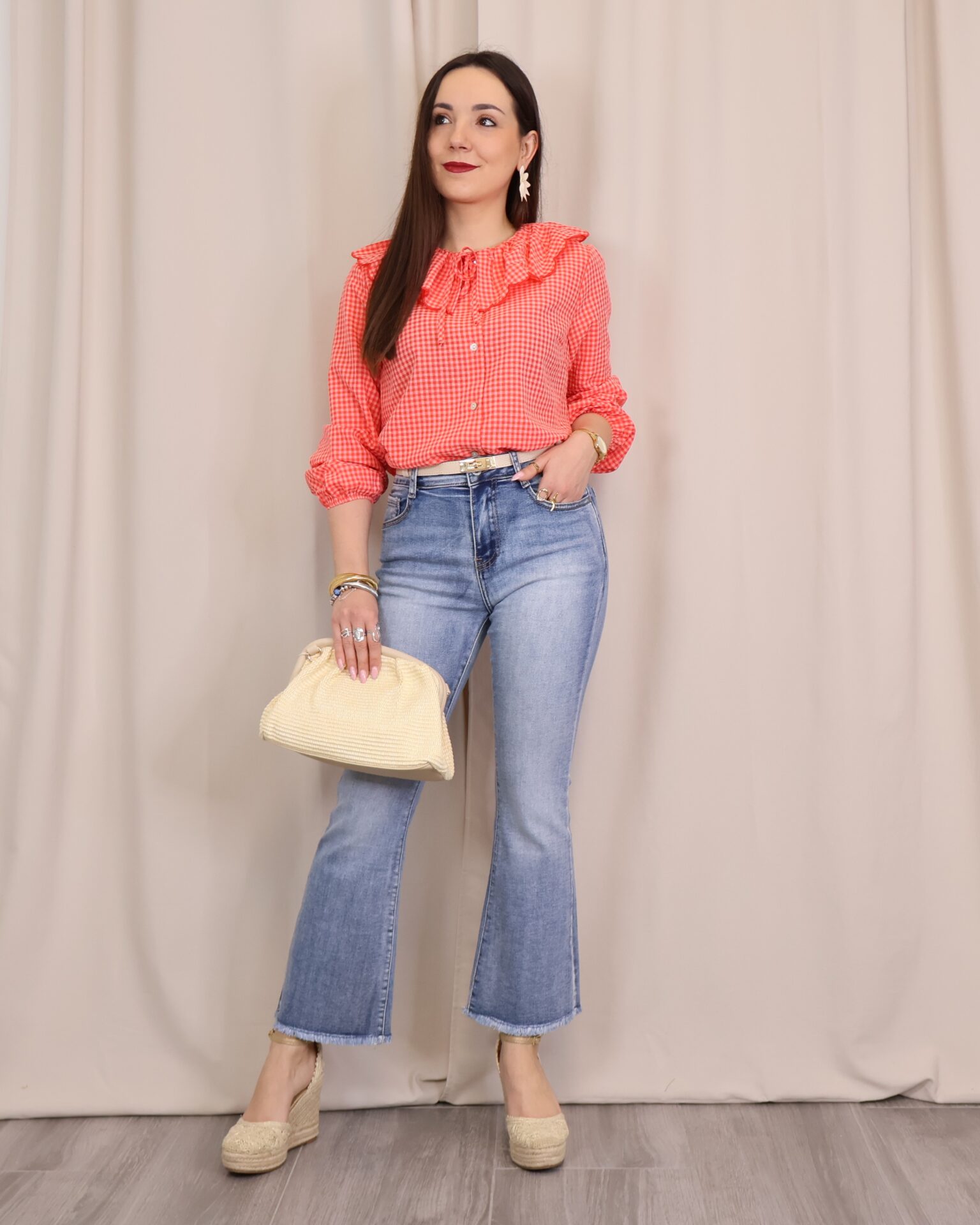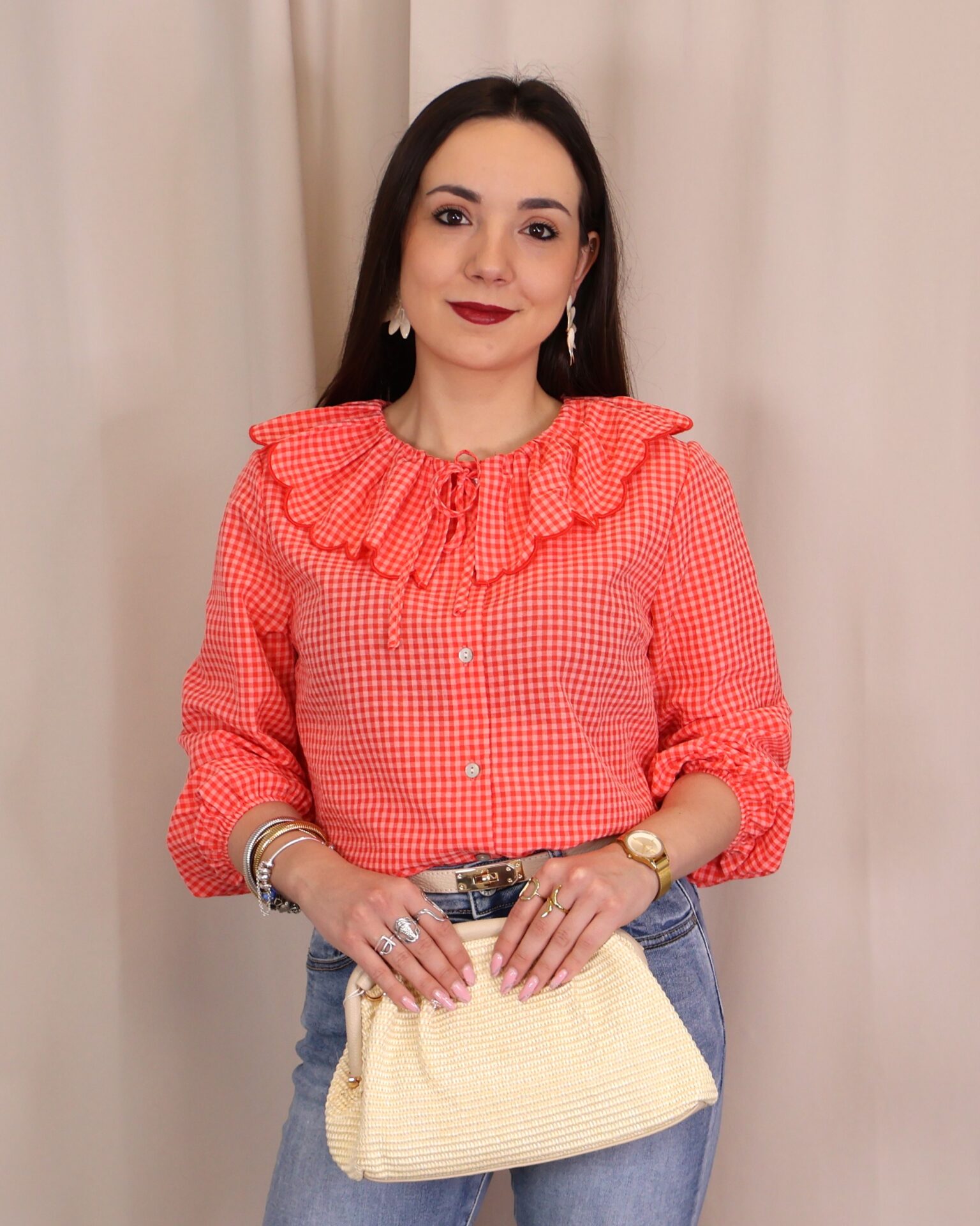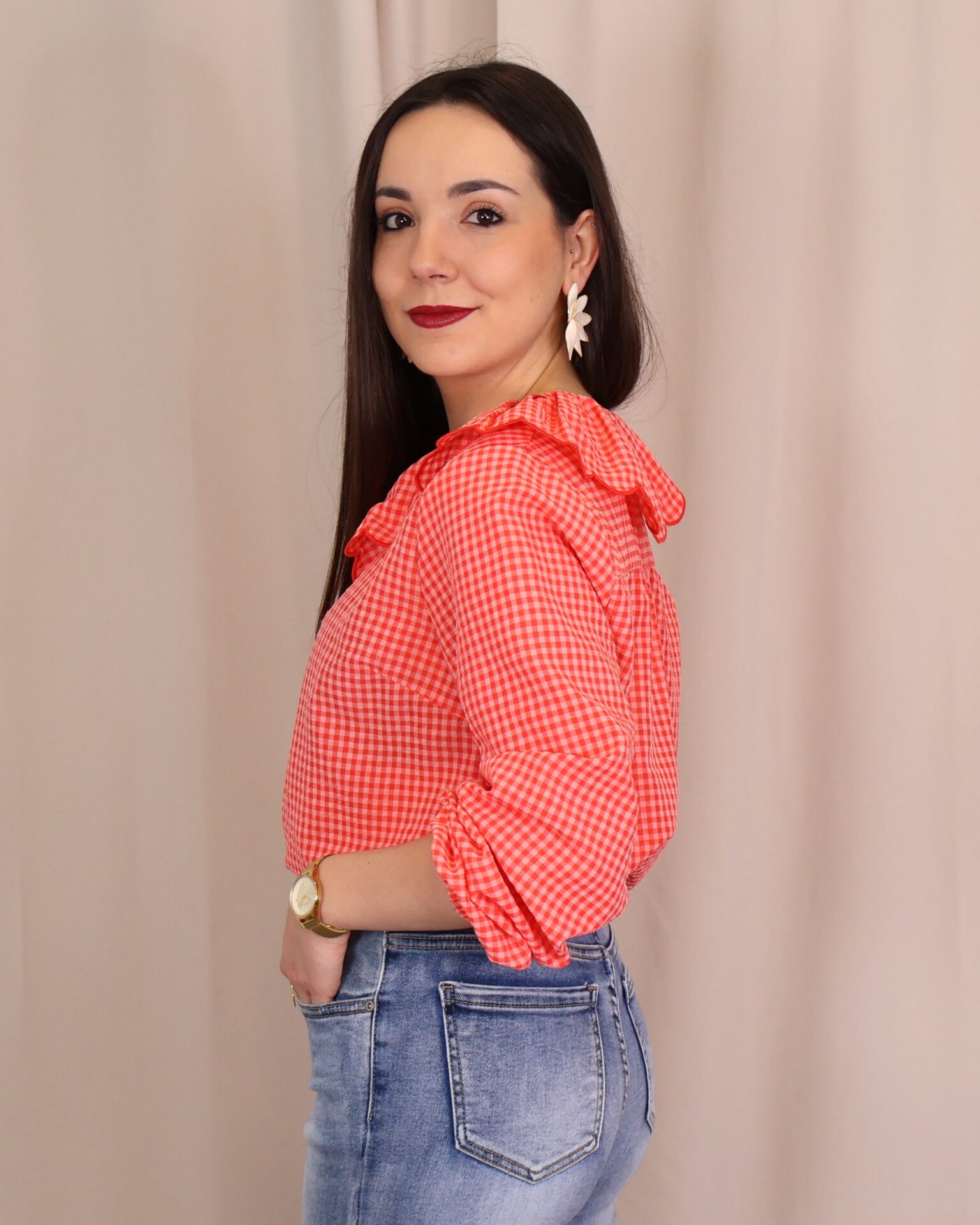 Camisa de estilo romántico en tejido ligero con estampado de cuadros vichy en tono coral. Destaca por su amplio cuello con volante ondulado en todo el contorno (delantero y trasero) y lazada fina en el cuello, además de cierre frontal con botones. De manga larga con puños con goma y acabado ligeramente fruncido, es una prenda femenina y versátil ideal para looks de diario con un toque especial.