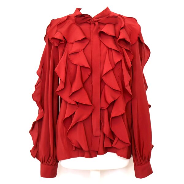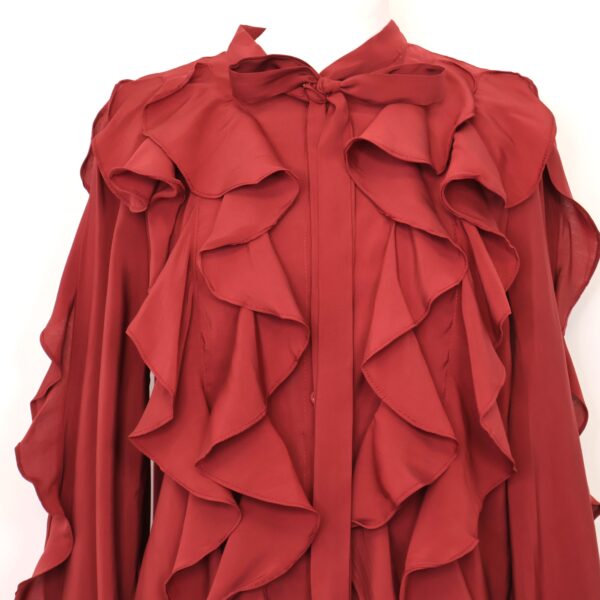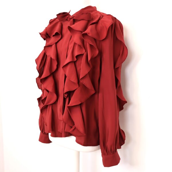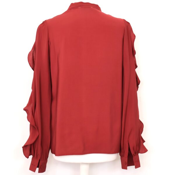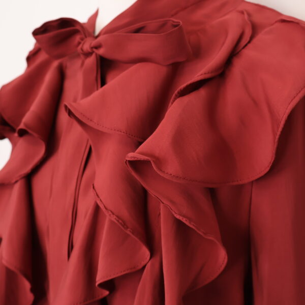 Camisa burdeos de manga larga. Abotonada de arriba a bajo. Volantes fluidos decorativos en la parte frontal y en mangas. Cuello cerrado con lazada. Botón en los puños.