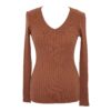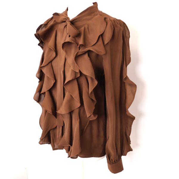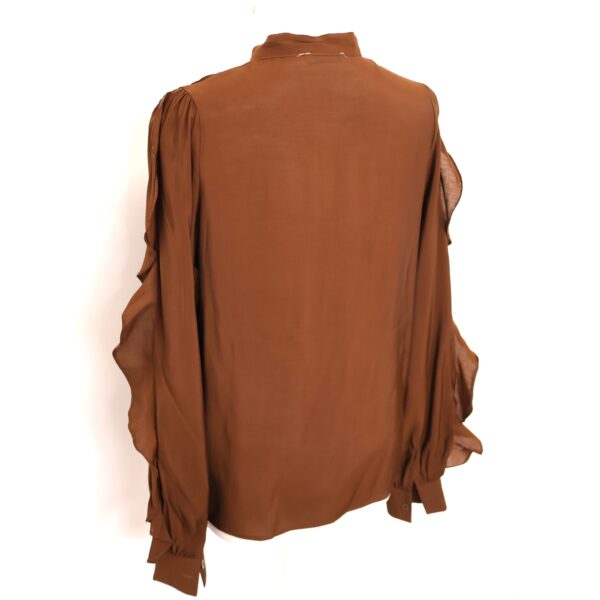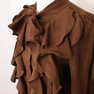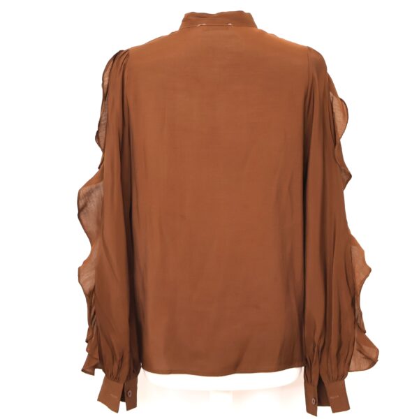 Camisa marrón chocolate de manga larga. Abotonada de arriba a bajo. Volantes fluidos decorativos en la parte frontal y en mangas. Cuello cerrado con lazada. Botón en los puños.