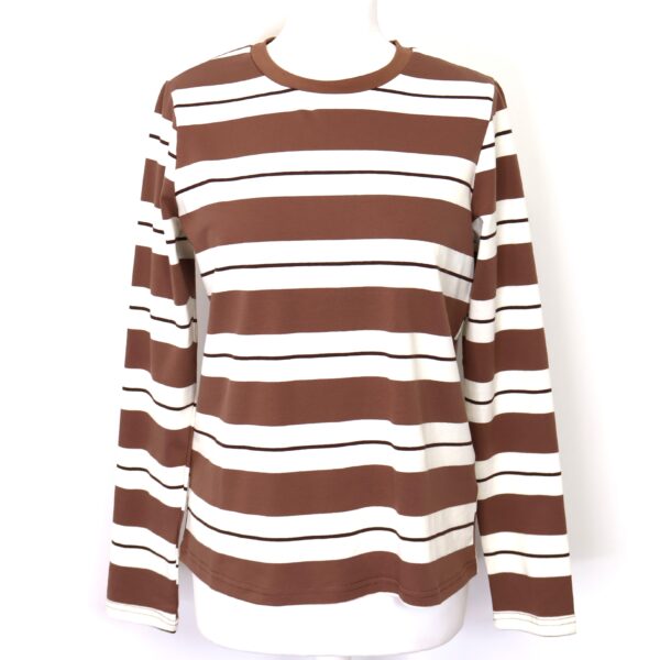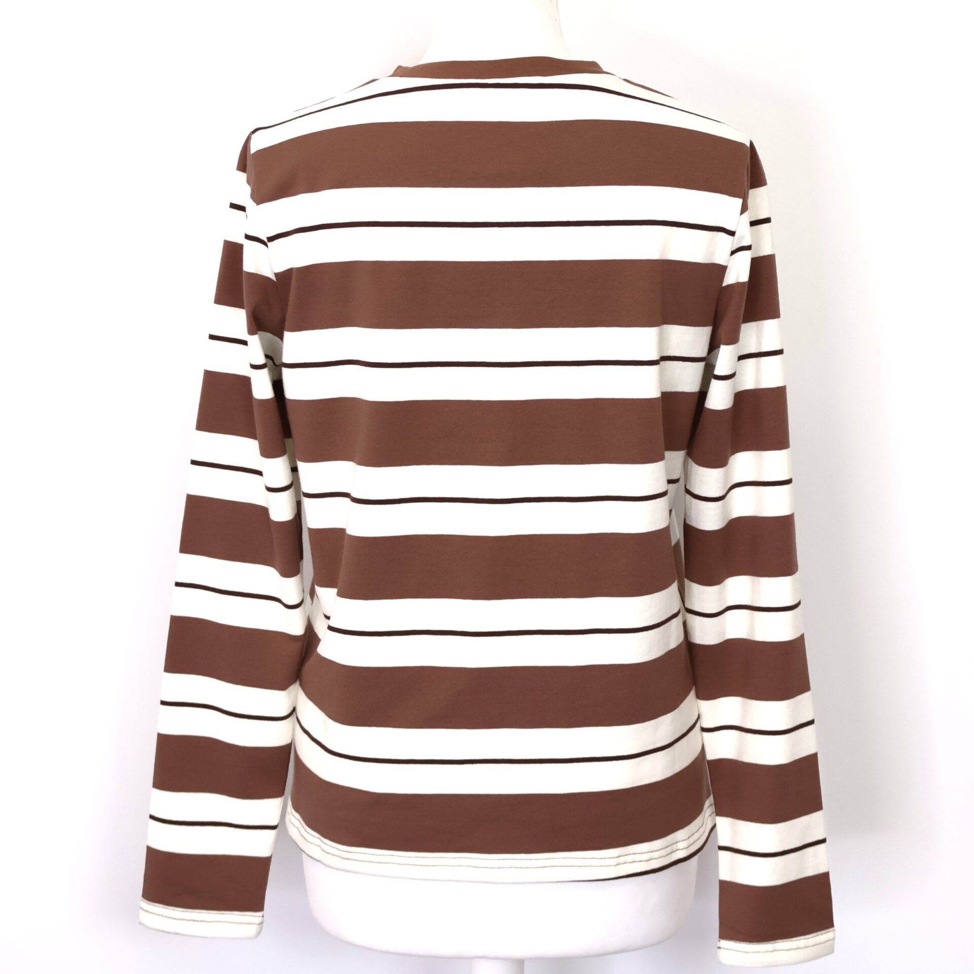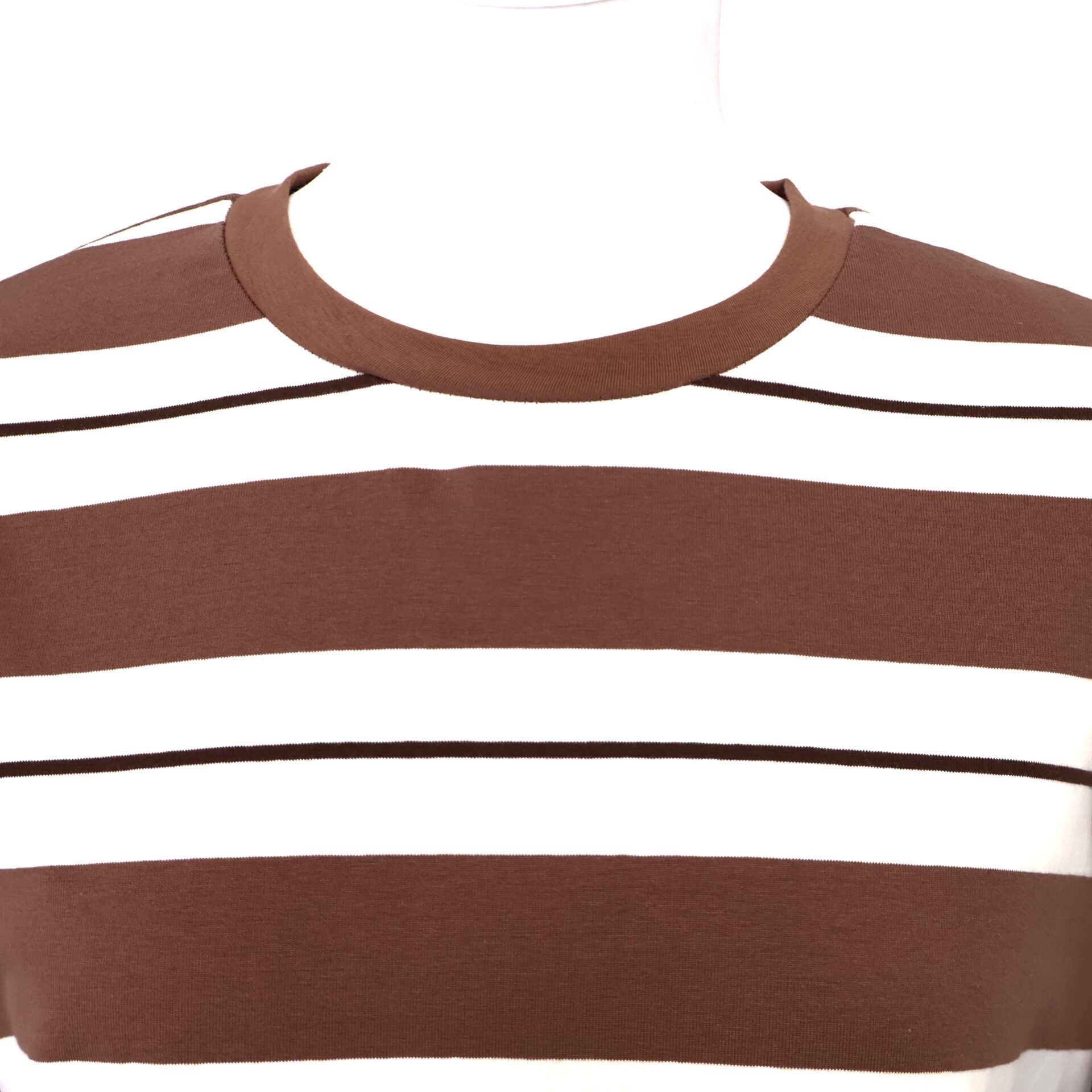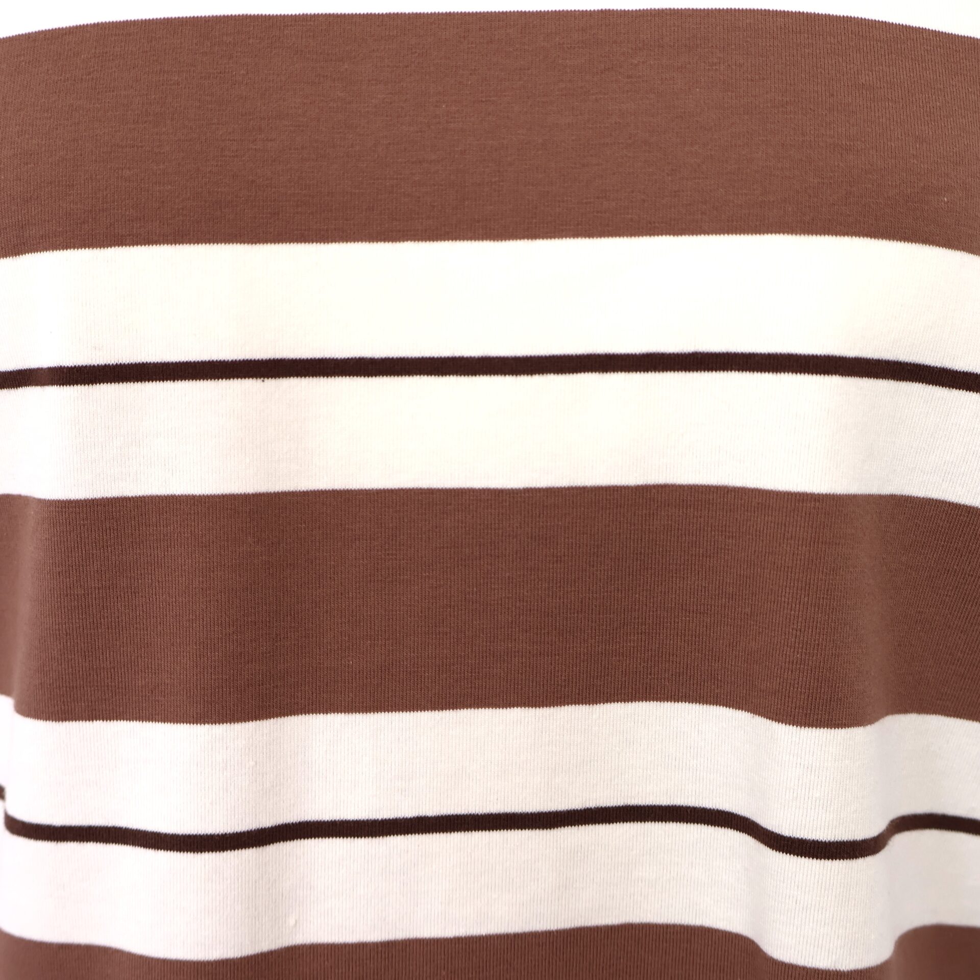 Camiseta de manga larga con estampado de rayas en color chocolate. Tejido elástico. Cuello redondo.