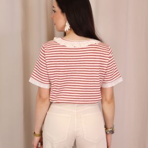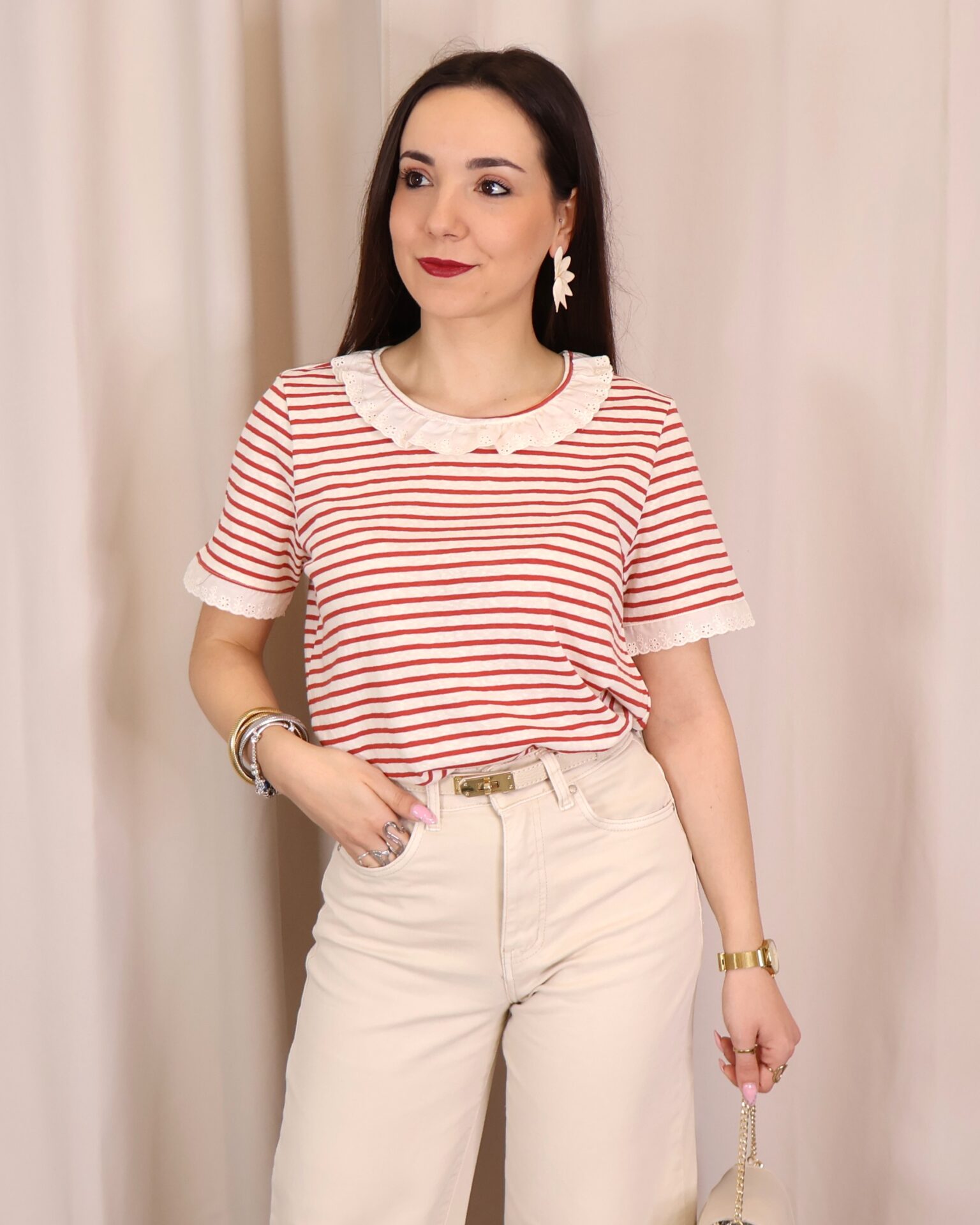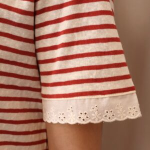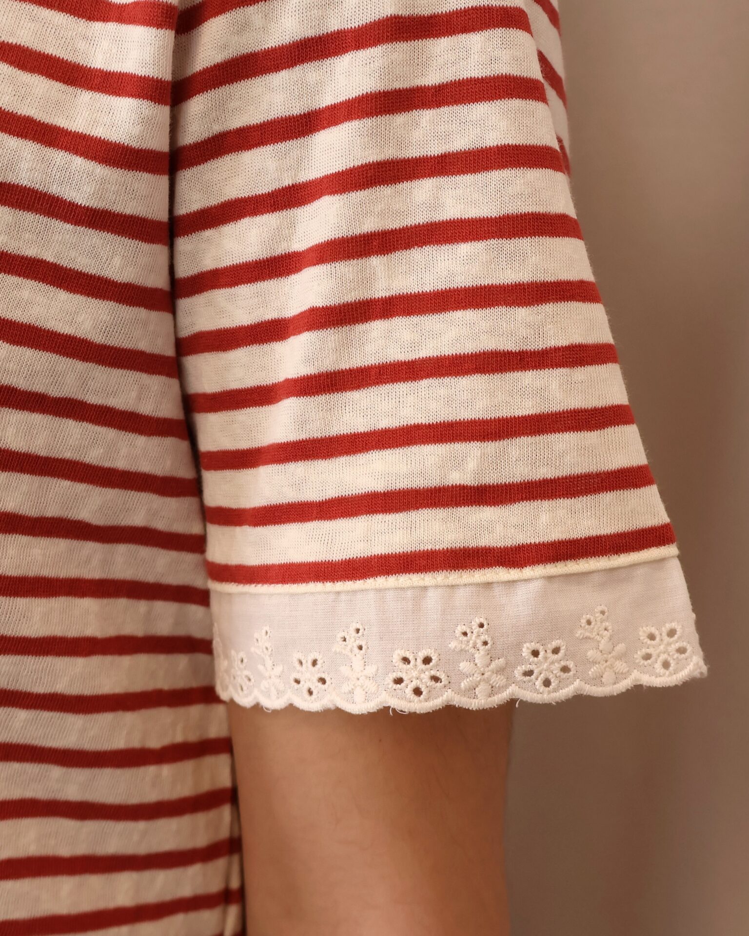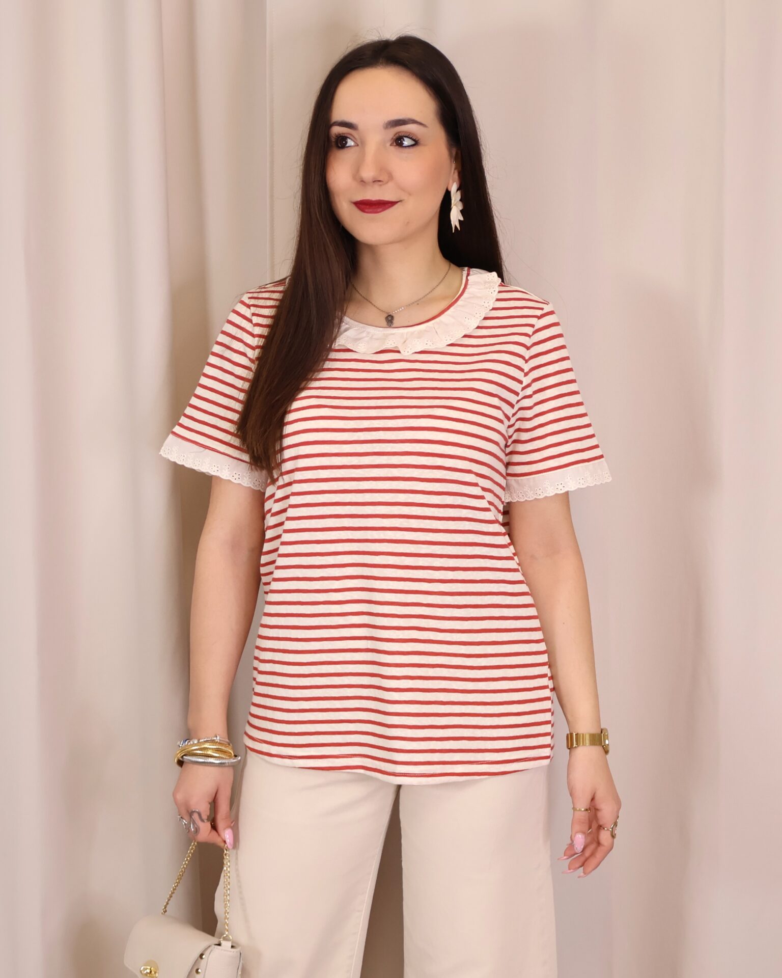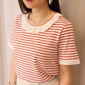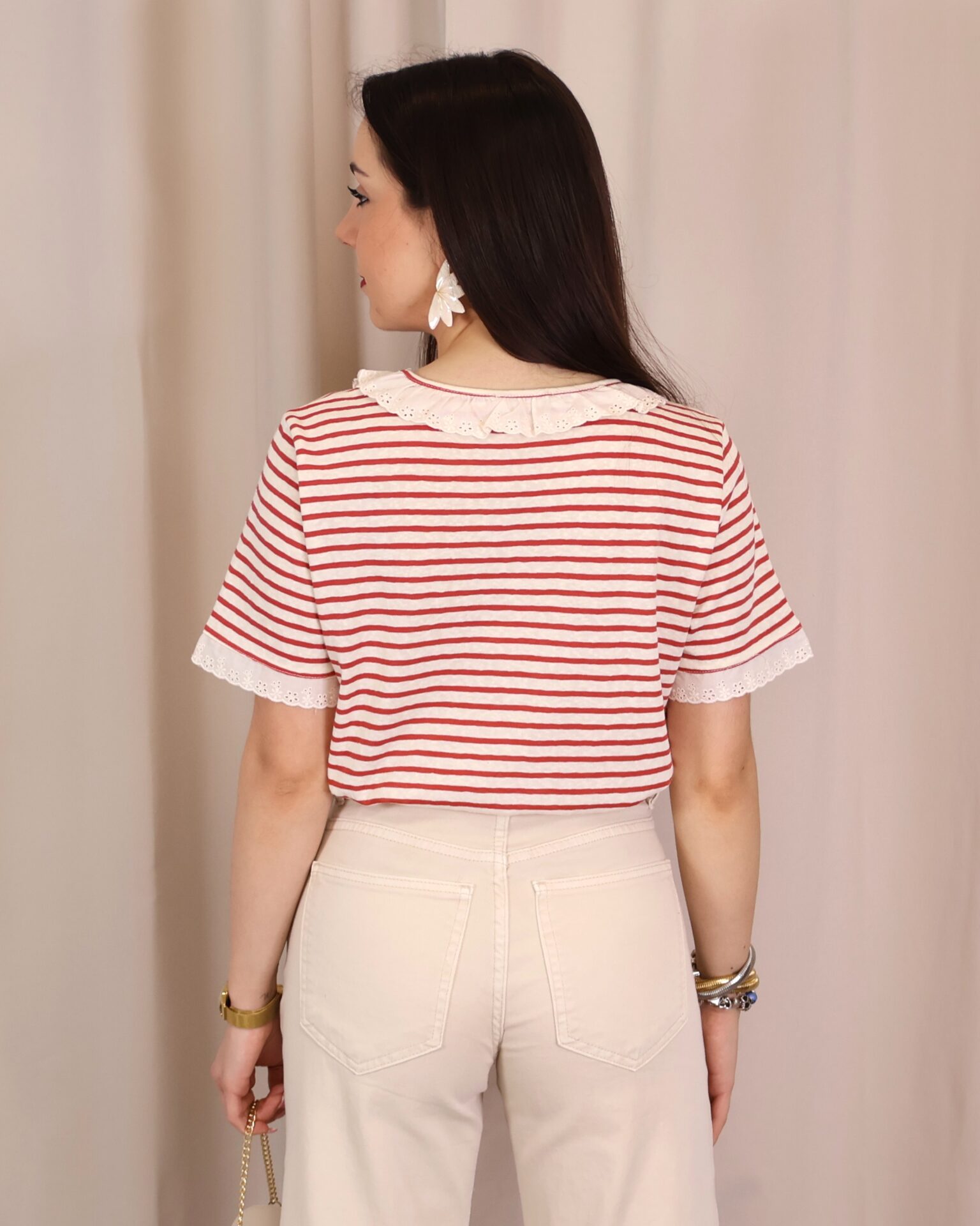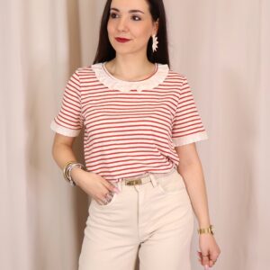Camiseta de rayas en blanco y rojo con un delicado cuello redondo adornado con puntilla en todo su borde. Confeccionada en tejido suave y cómodo, presenta manga corta también rematada con puntilla a juego. Perfecta para looks casuales con un aire romántico y fácil de combinar con cualquier prenda.
