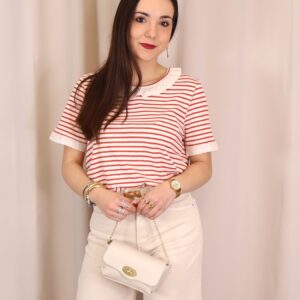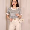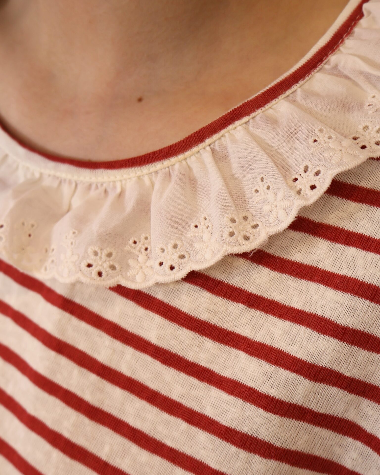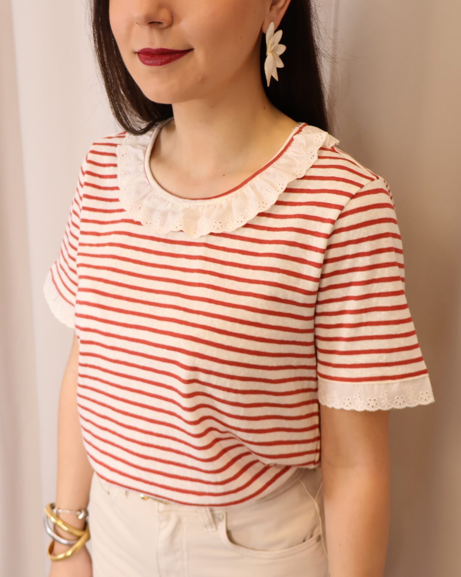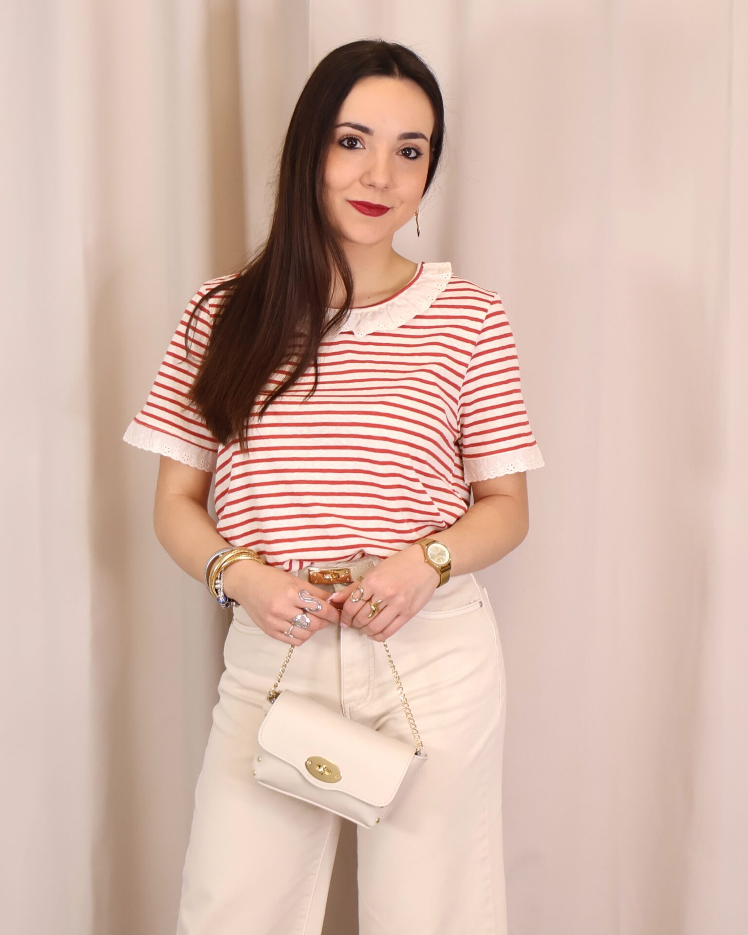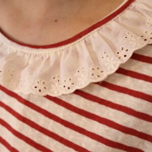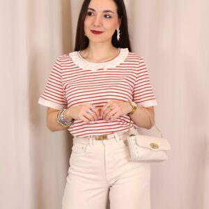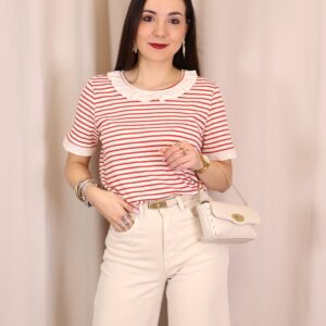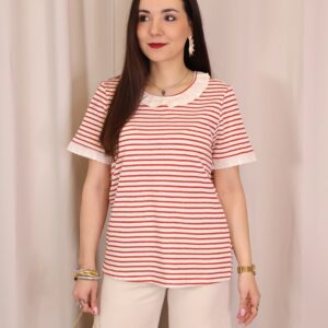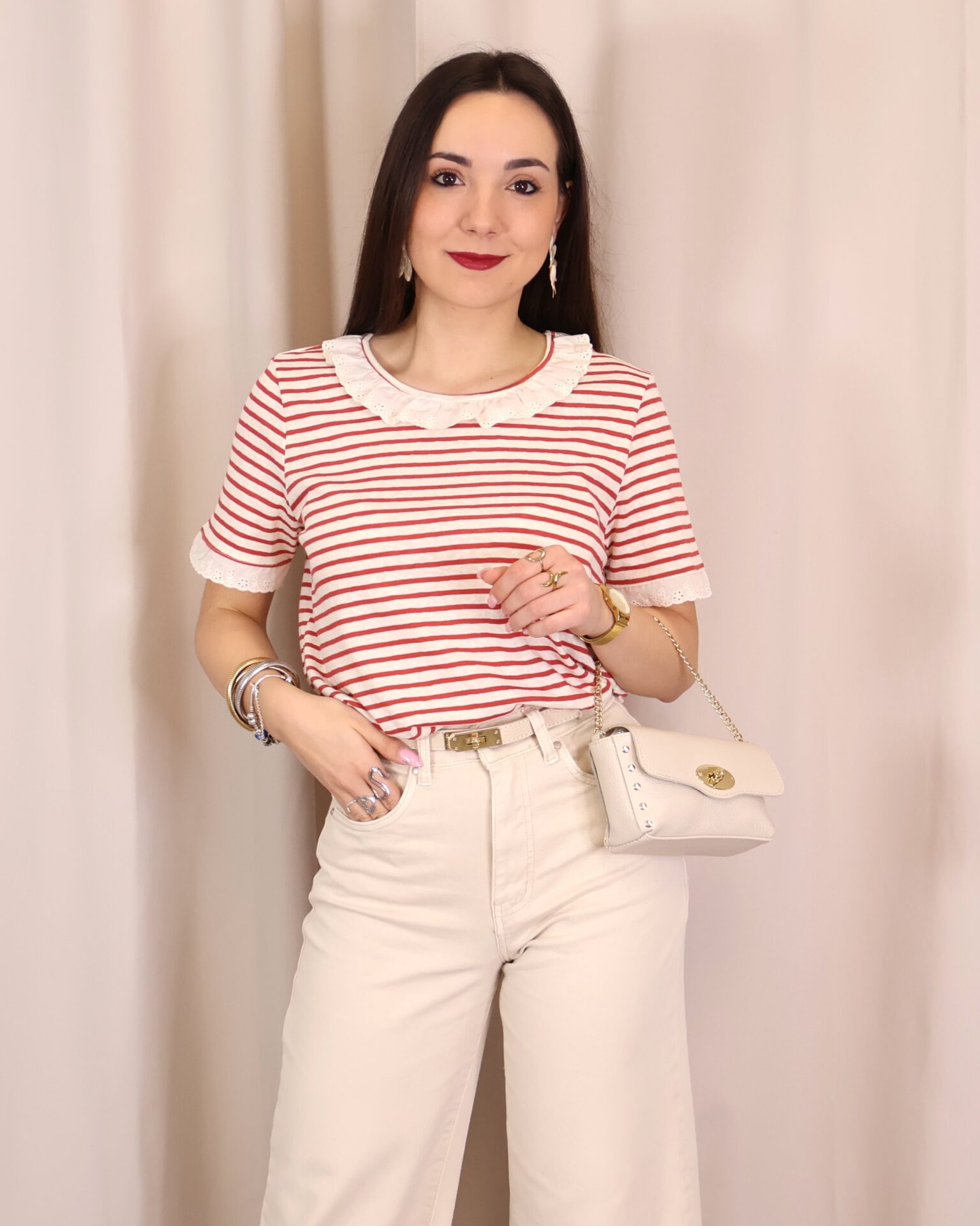 Camiseta de rayas en blanco y rojo con un delicado cuello redondo adornado con puntilla en todo su borde. Confeccionada en tejido suave y cómodo, presenta manga corta también rematada con puntilla a juego. Perfecta para looks casuales con un aire romántico y fácil de combinar con cualquier prenda.