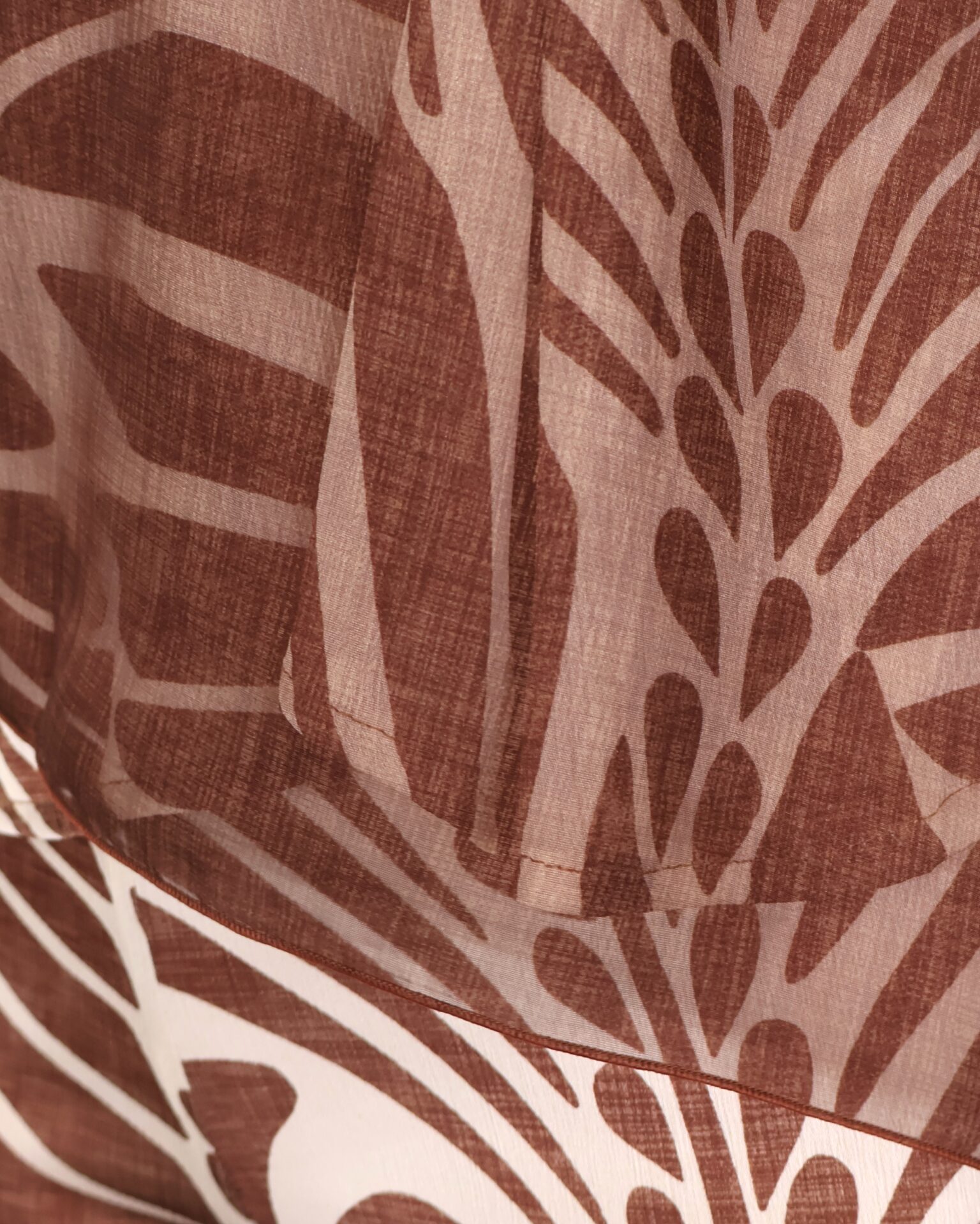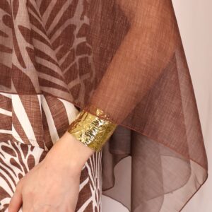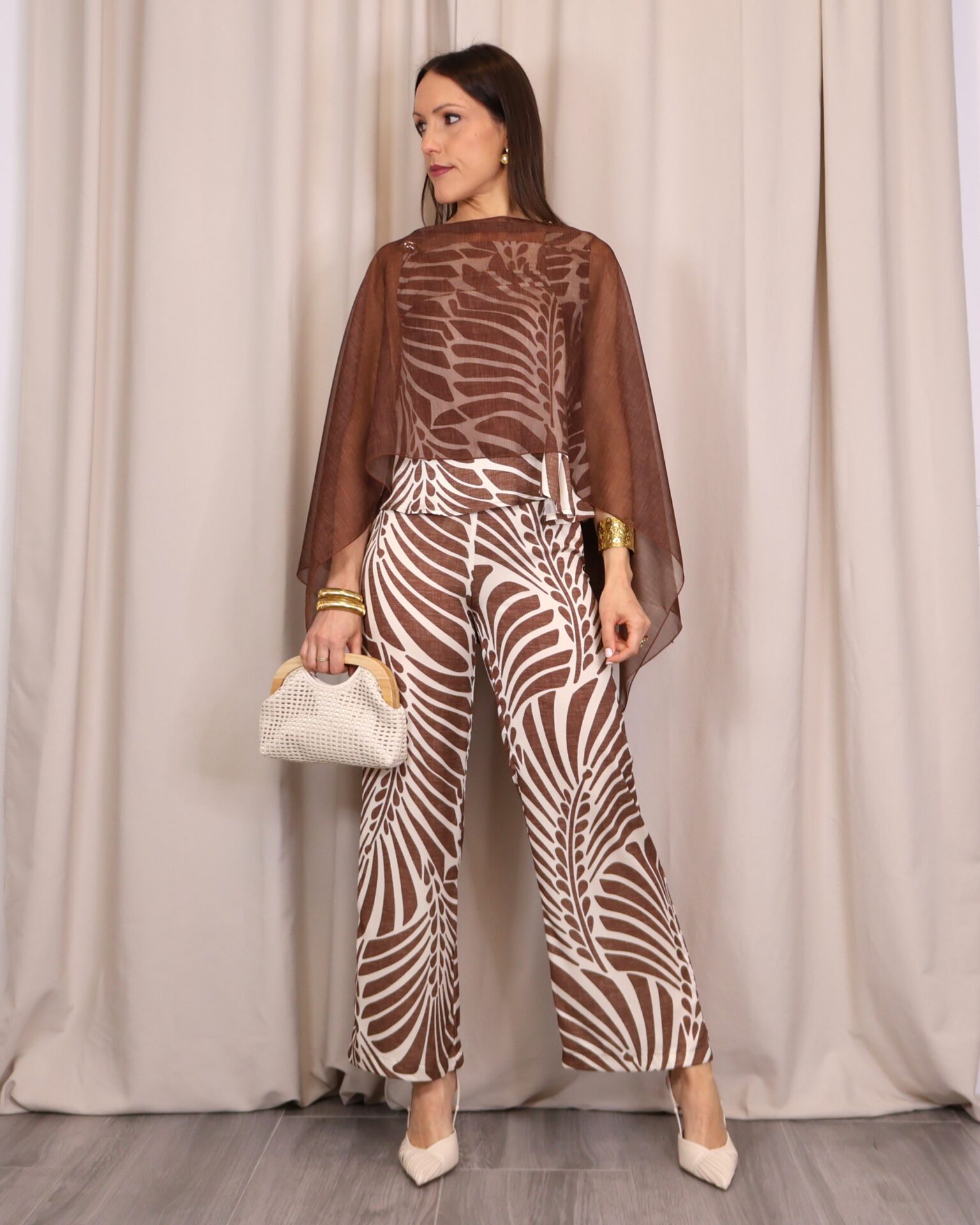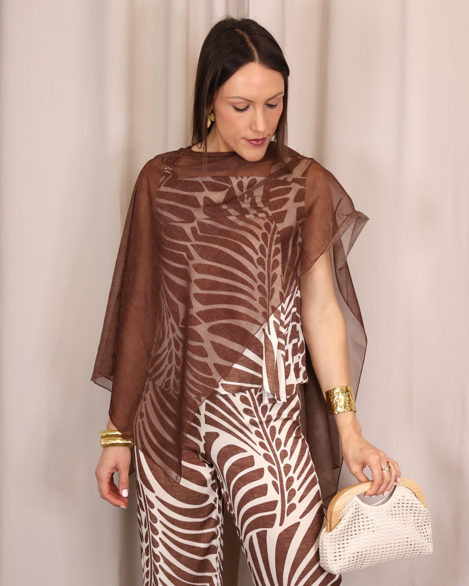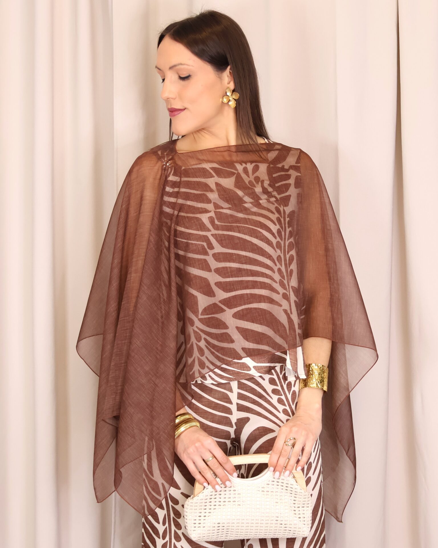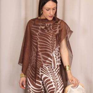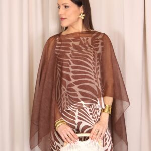 Capa ligera en tono marrón chocolate con acabado semitransparente, perfecta para añadir un toque elegante y sofisticado a cualquier look. Su diseño amplio y fluido aporta movimiento, mientras que su tejido vaporoso la convierte en una prenda ideal para superponer sin restar protagonismo al conjunto.