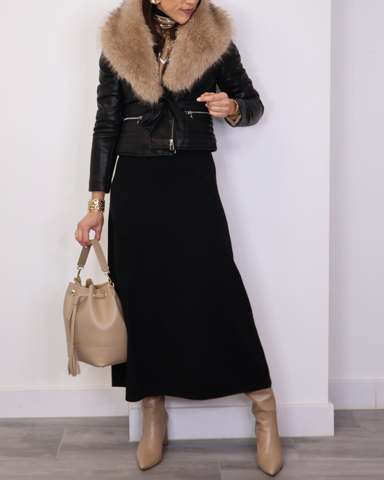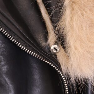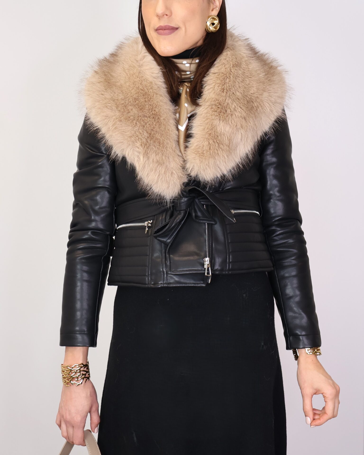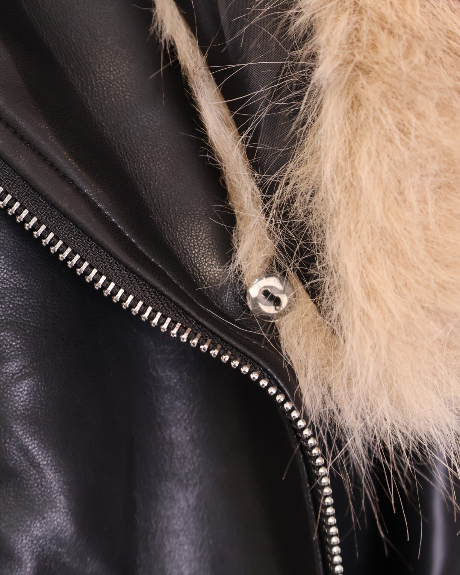 Cazadora biker confeccionada en PU en color negro con cuello solapa y manga larga. Bolsillos delanteros con cierre de cremallera. Cierre frontal cruzado con cremallera metálica. Con cinturón y pelo del cuello desmontable. Interior forrado de pelo sintético.