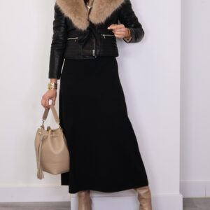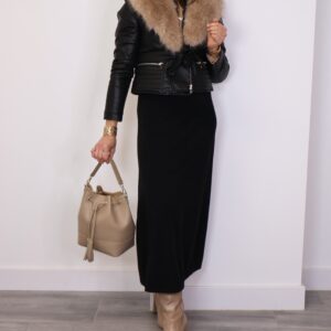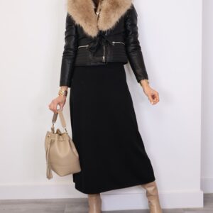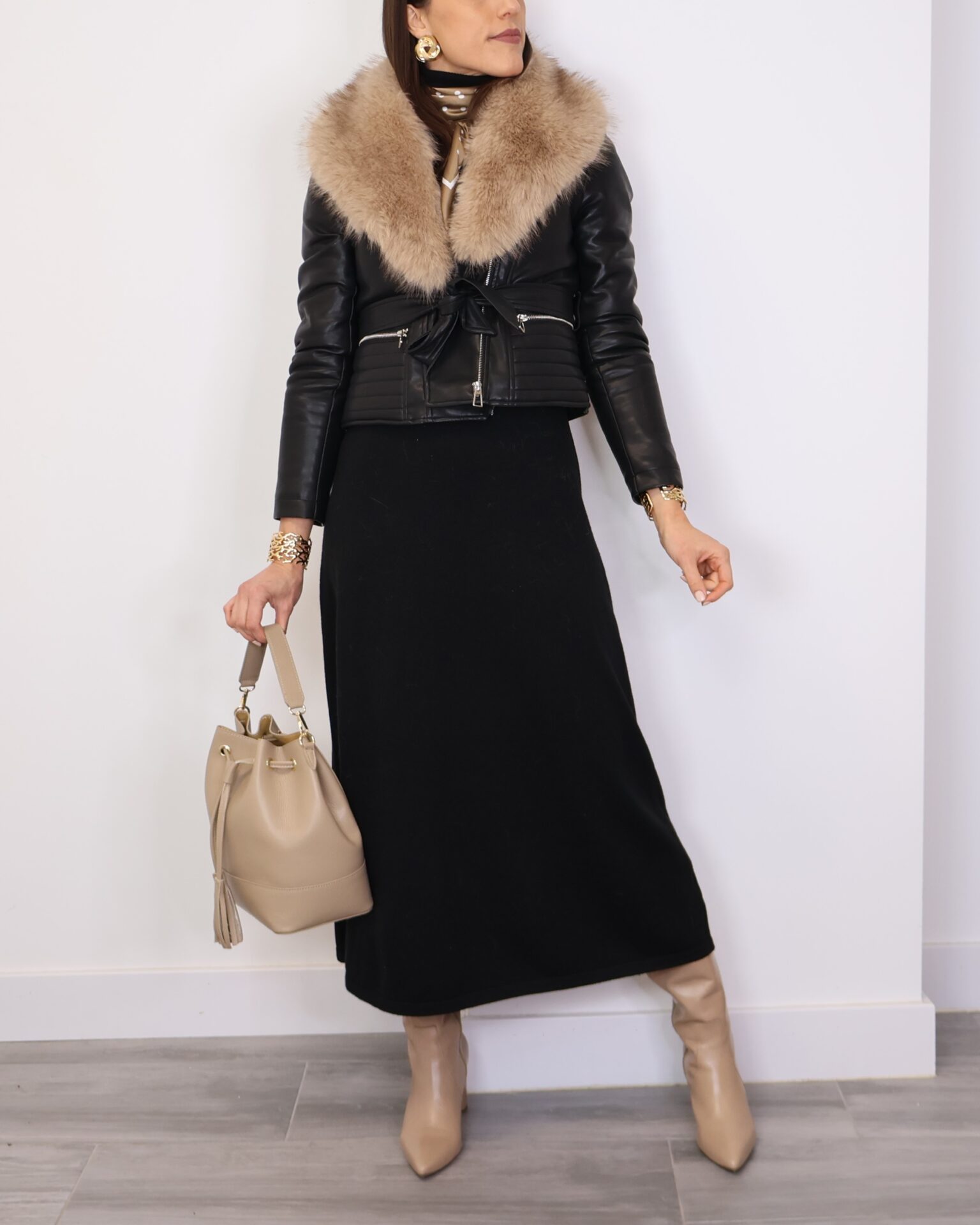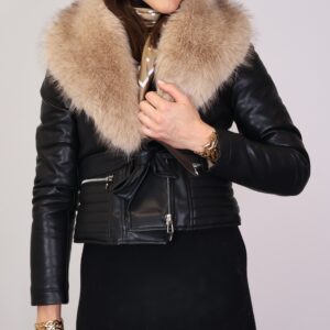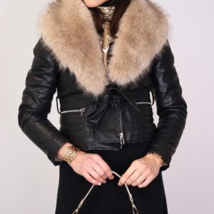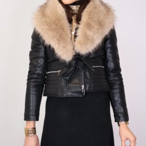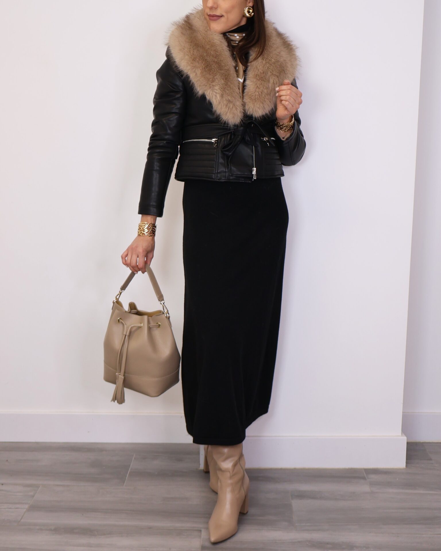 Cazadora biker confeccionada en PU en color negro con cuello solapa y manga larga. Bolsillos delanteros con cierre de cremallera. Cierre frontal cruzado con cremallera metálica. Con cinturón y pelo del cuello desmontable. Interior forrado de pelo sintético.