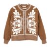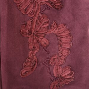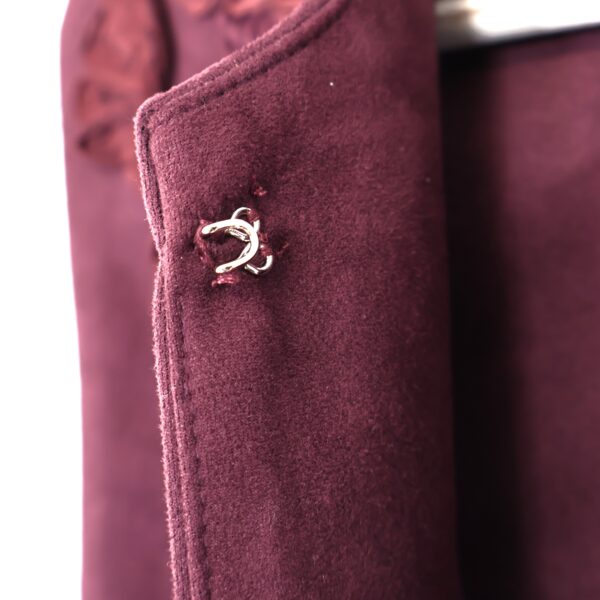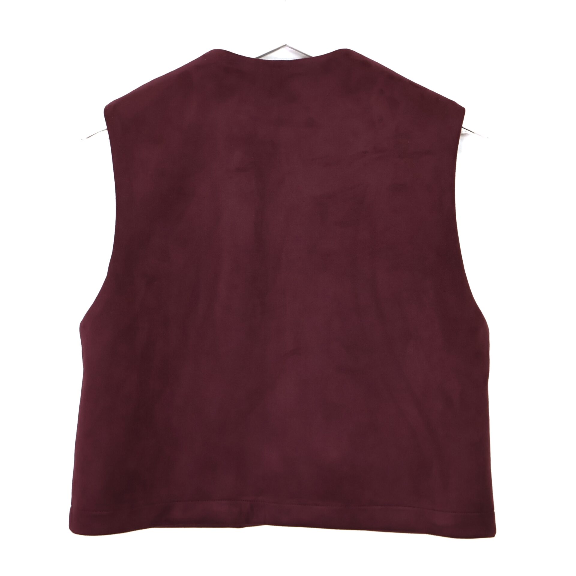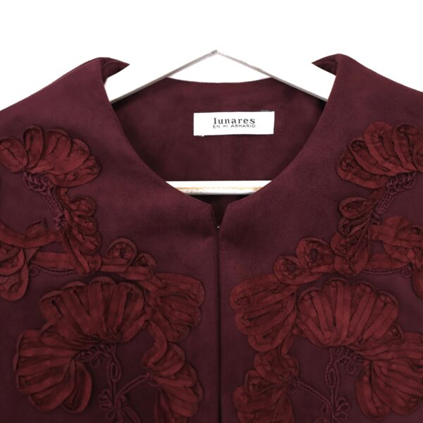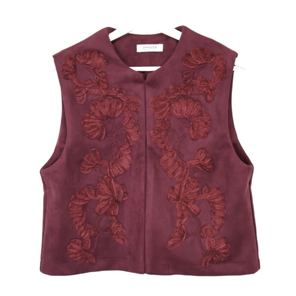 Chaleco confeccionado en ante de color burdeos. Cuello redondo. Cierres metálicos invisibles. Parte delantera decorada con bordado en tul en el mismo color.