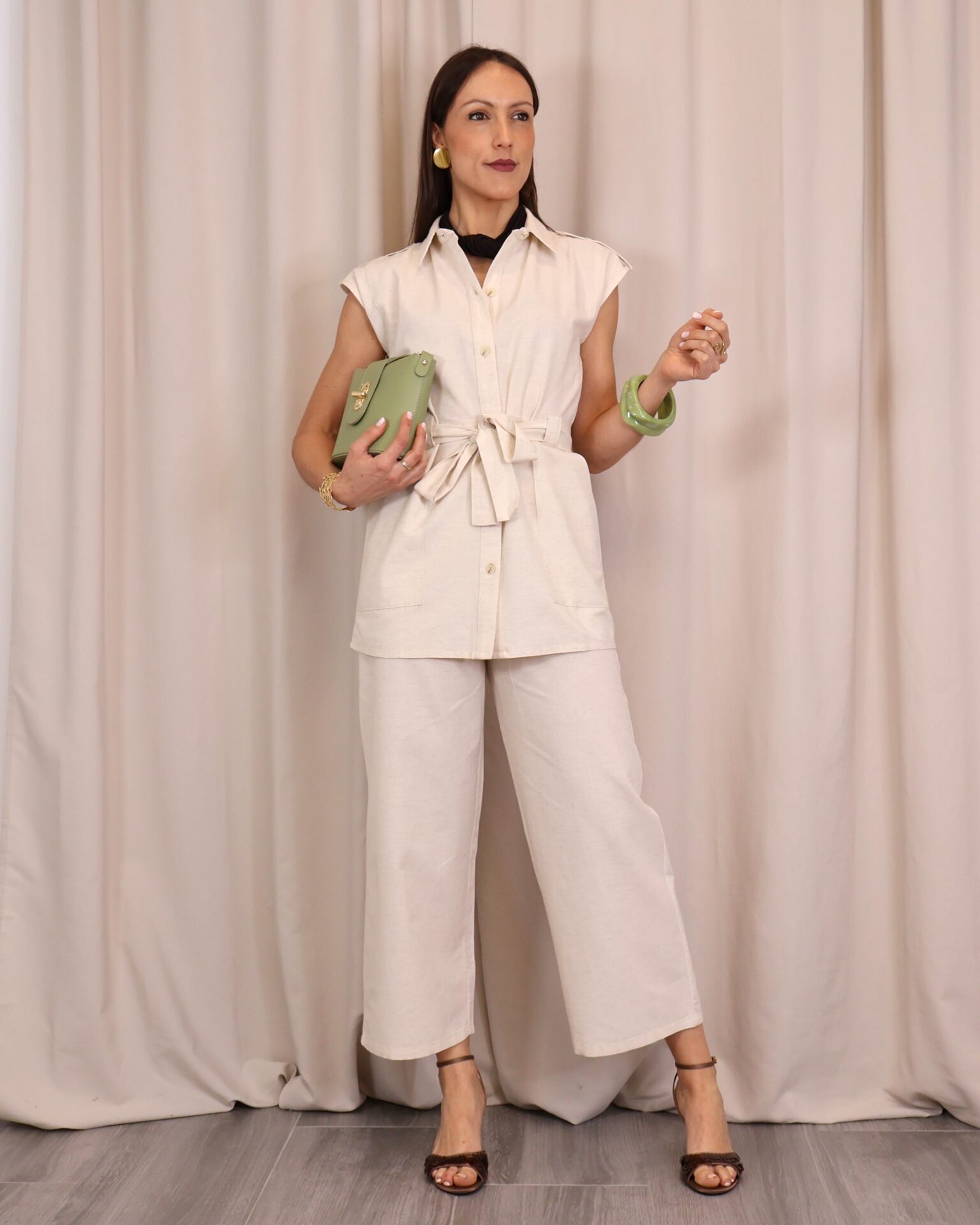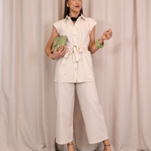 Chaleco largo en tono beige, confeccionado en un tejido ligero y natural. Presenta cuello camisero y cierre frontal con botones, aportando un aire sofisticado y atemporal. Incluye cinturón del mismo tejido para ajustar a la cintura y realzar la silueta. Los bolsillos delanteros añaden un toque funcional y desenfadado.