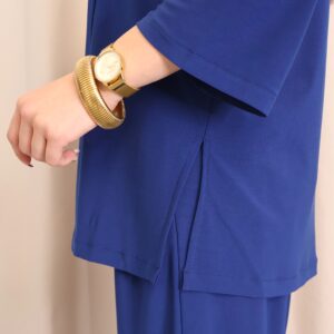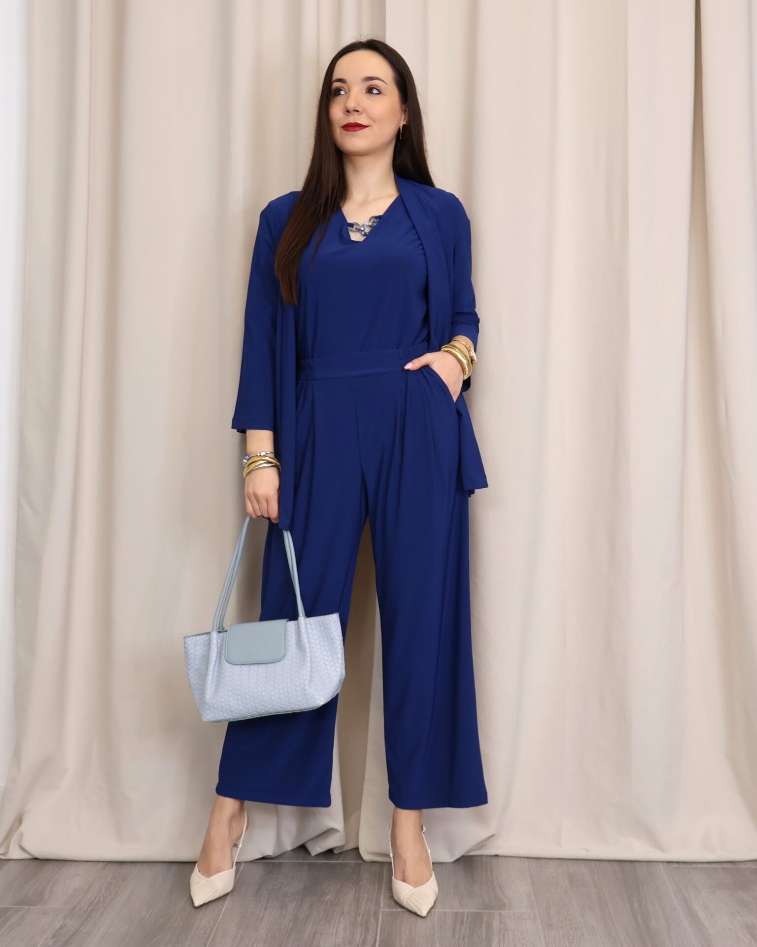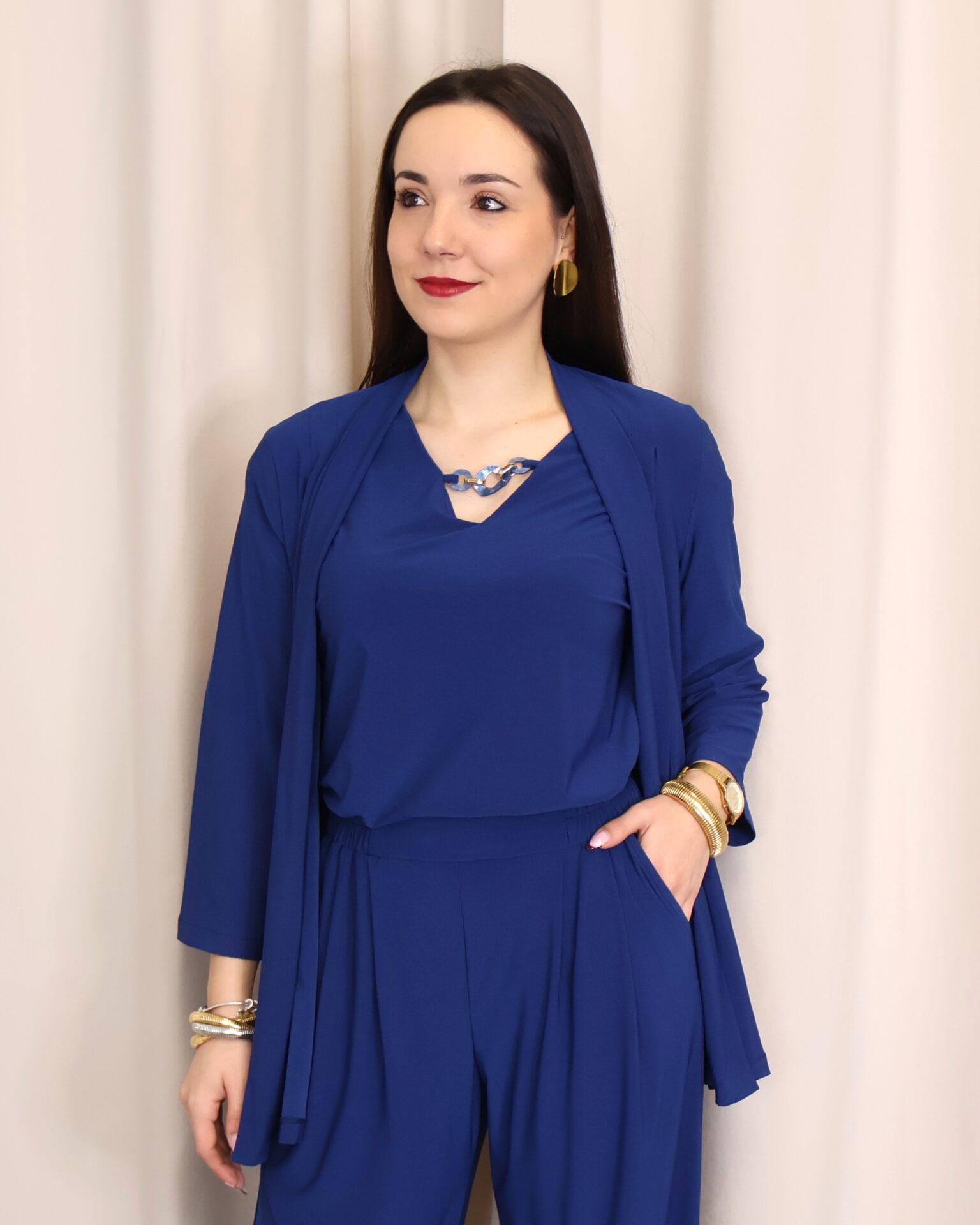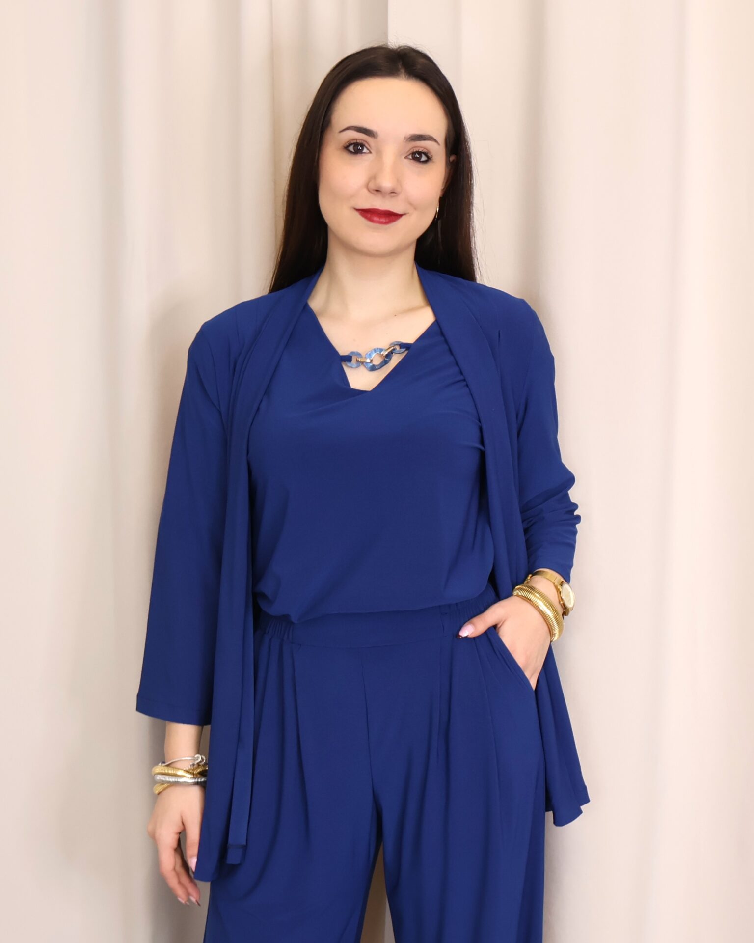 Chaqueta abierta confeccionada en un tejido suave y fluido en elegante color azul índigo, ideal para aportar un toque sofisticado a cualquier look. Su diseño ligero y sin cierre la convierte en una prenda cómoda y fácil de combinar. Cuenta con manga francesa (3/4), que aporta un aire actual y favorecedor, perfecta para entretiempo. Su caída fluida estiliza la silueta, convirtiéndola en una opción versátil tanto para looks casuales como más arreglados.