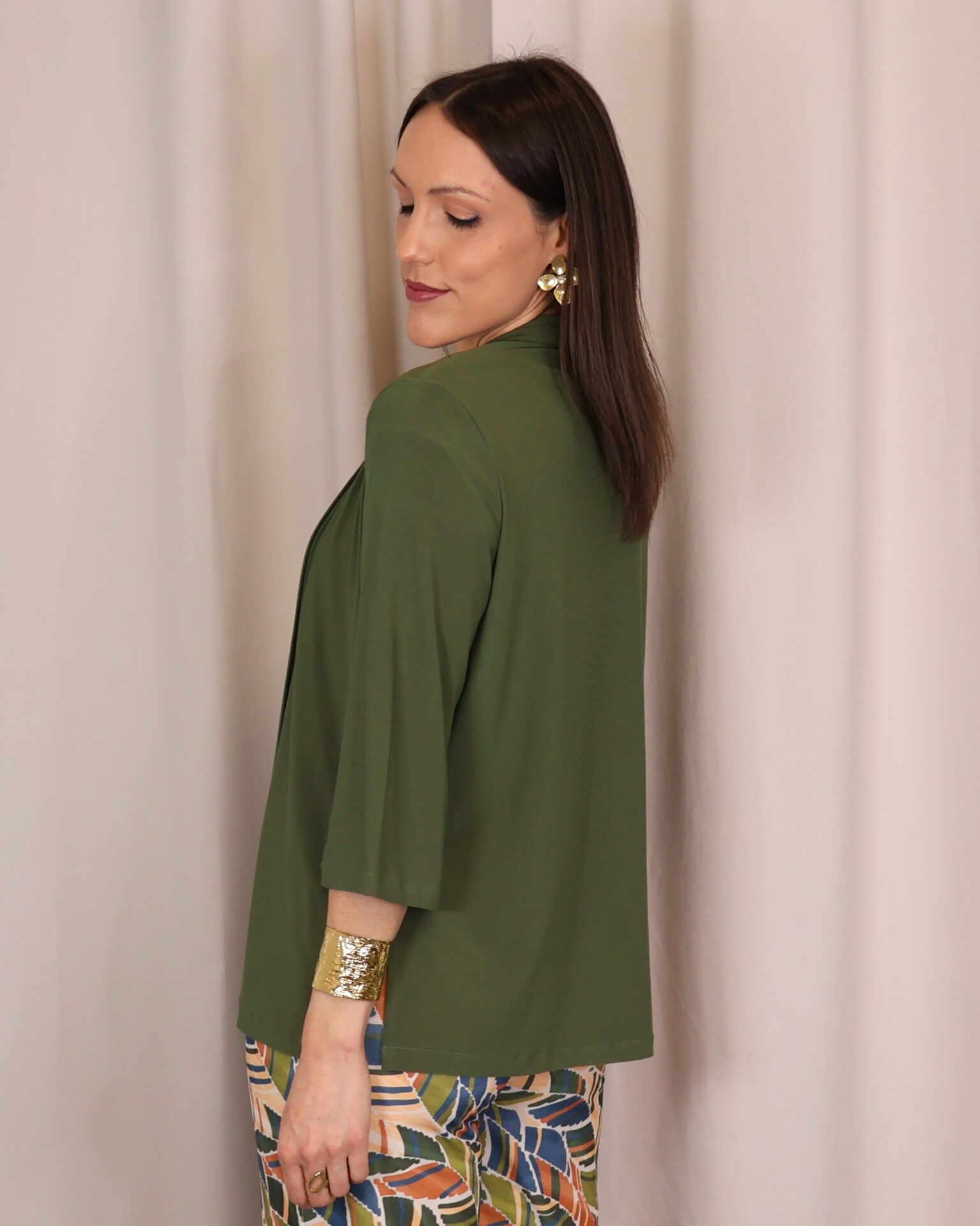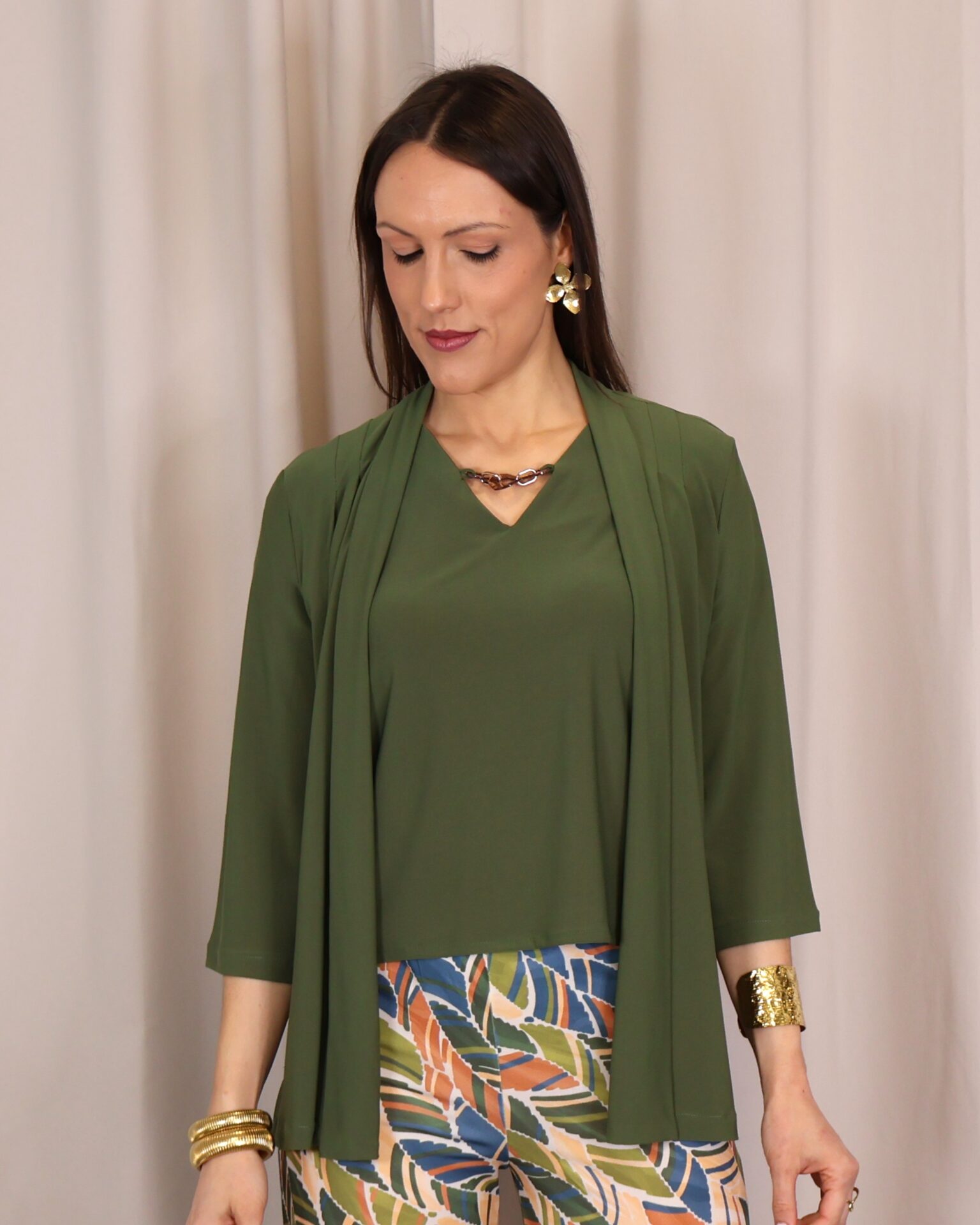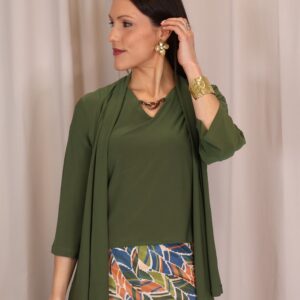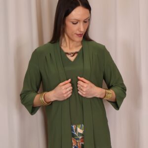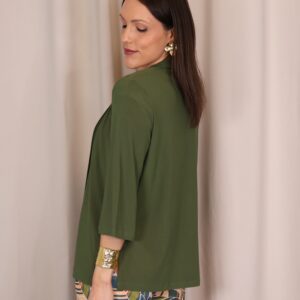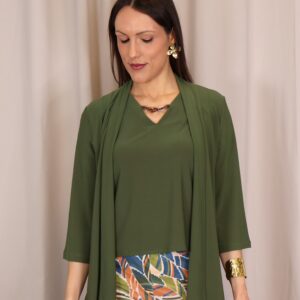 Chaqueta abierta confeccionada en un tejido suave y fluido en elegante color verde kaki, ideal para aportar un toque sofisticado a cualquier look. Su diseño ligero y sin cierre la convierte en una prenda cómoda y fácil de combinar. Cuenta con manga francesa (3/4), que aporta un aire actual y favorecedor, perfecta para entretiempo. Su caída fluida estiliza la silueta, convirtiéndola en una opción versátil tanto para looks casuales como más arreglados.