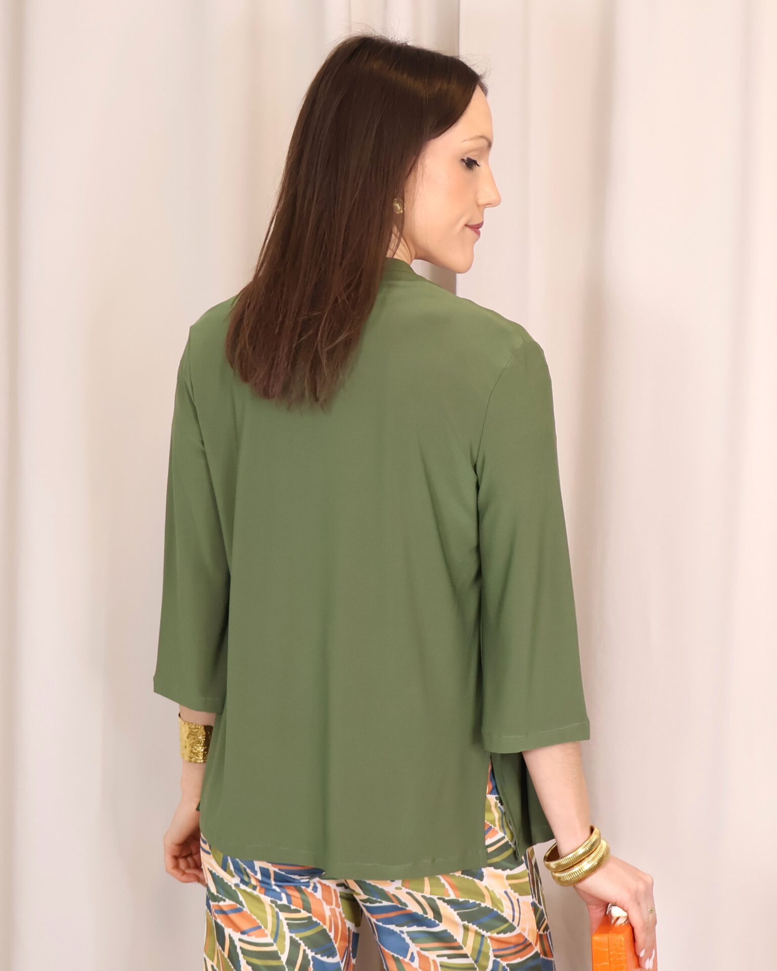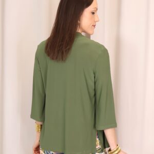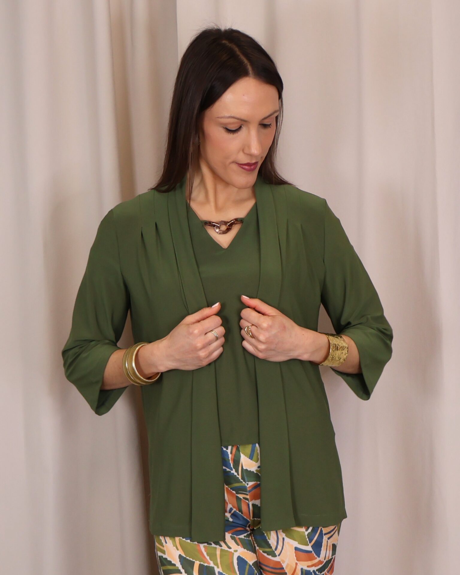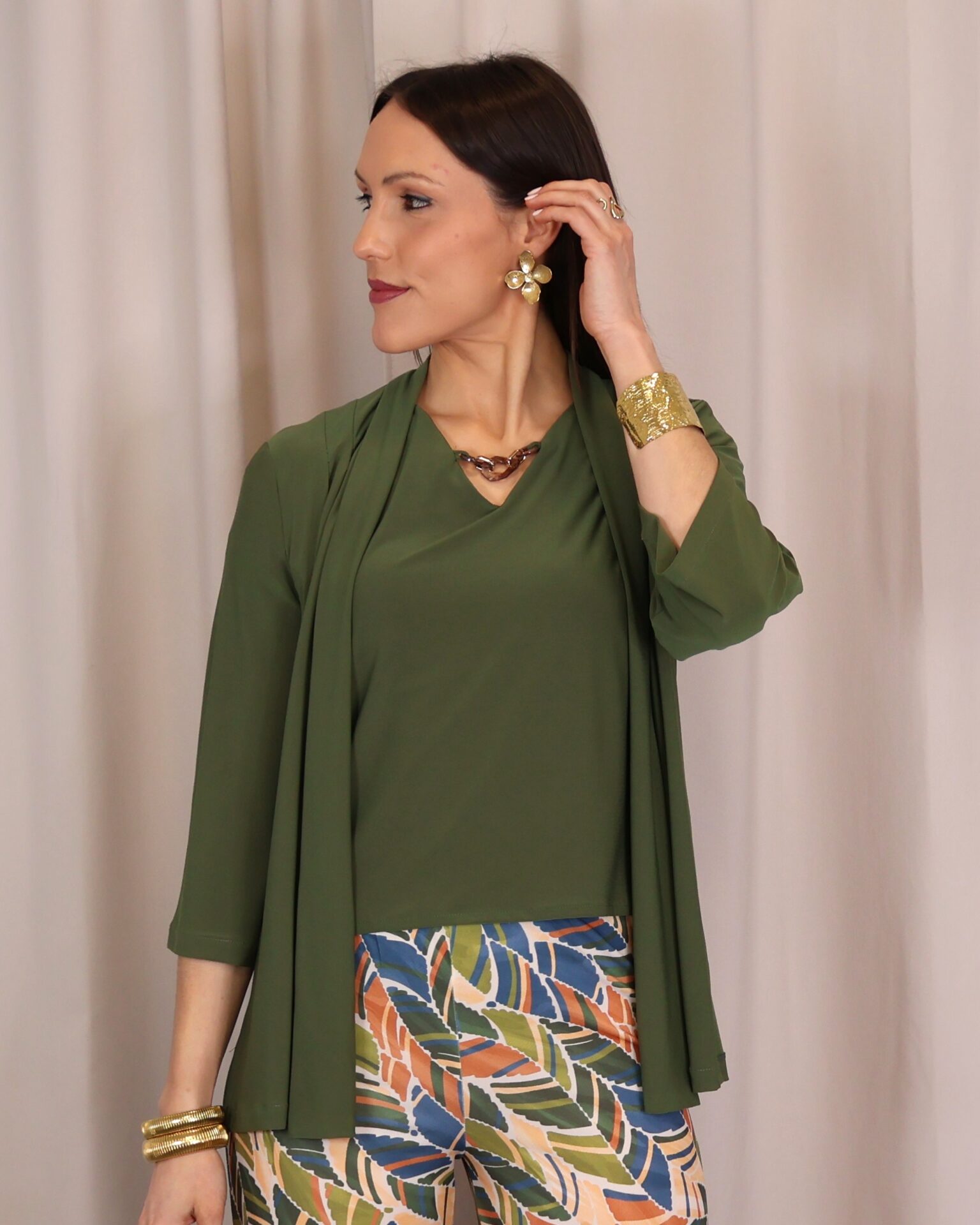 Chaqueta abierta confeccionada en un tejido suave y fluido en elegante color verde kaki, ideal para aportar un toque sofisticado a cualquier look. Su diseño ligero y sin cierre la convierte en una prenda cómoda y fácil de combinar. Cuenta con manga francesa (3/4), que aporta un aire actual y favorecedor, perfecta para entretiempo. Su caída fluida estiliza la silueta, convirtiéndola en una opción versátil tanto para looks casuales como más arreglados.