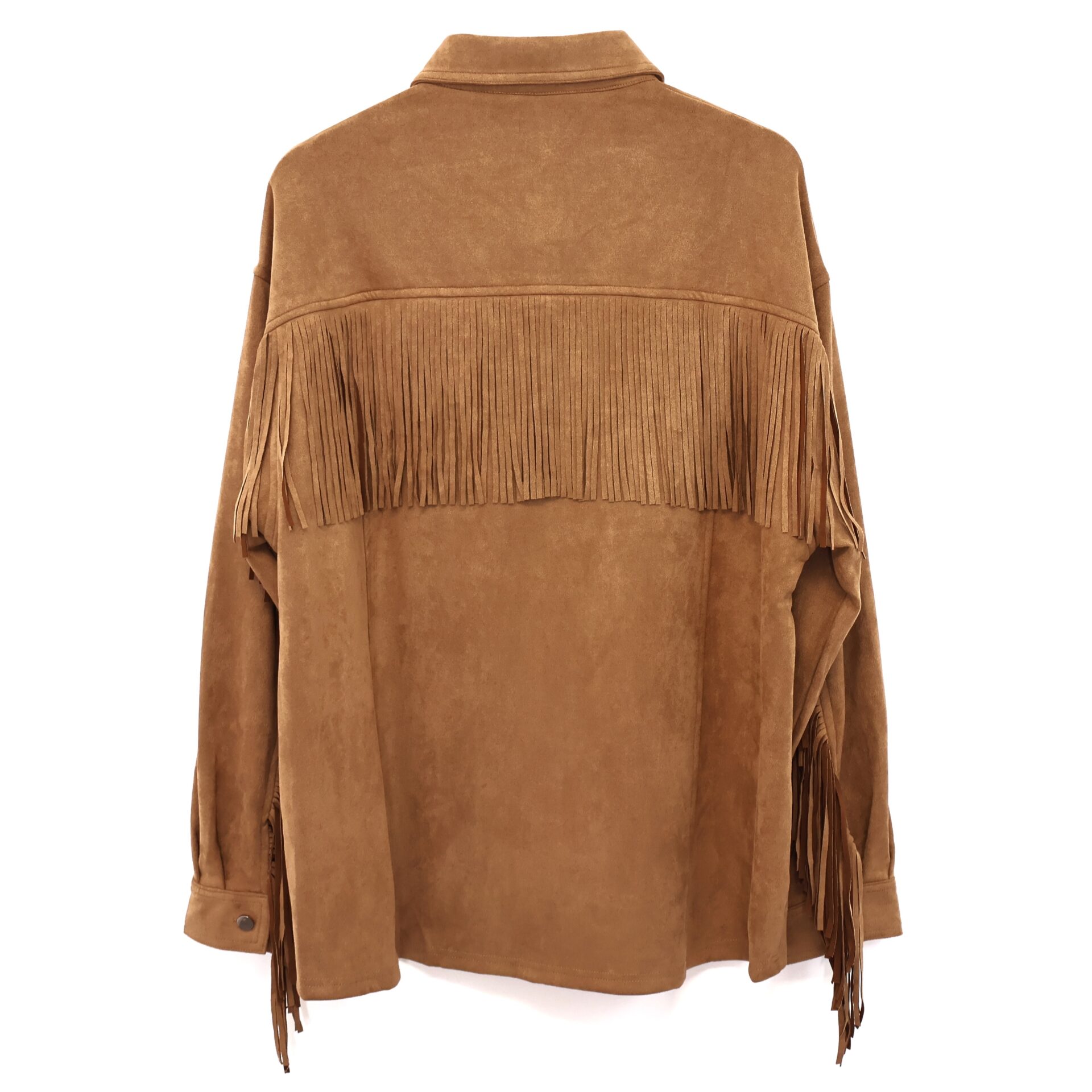 Chaqueta de flecos de corte oversize confeccionada en ante color camel. Cierre con botones. Manga caída con botón en los puños.