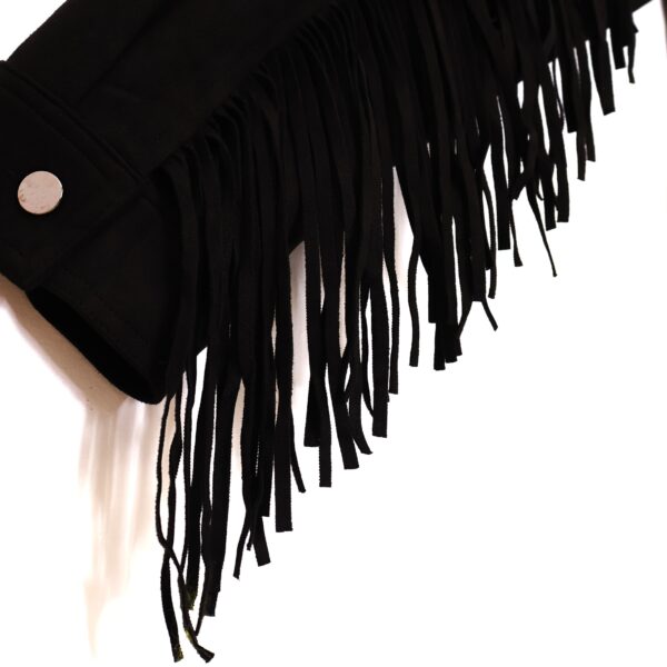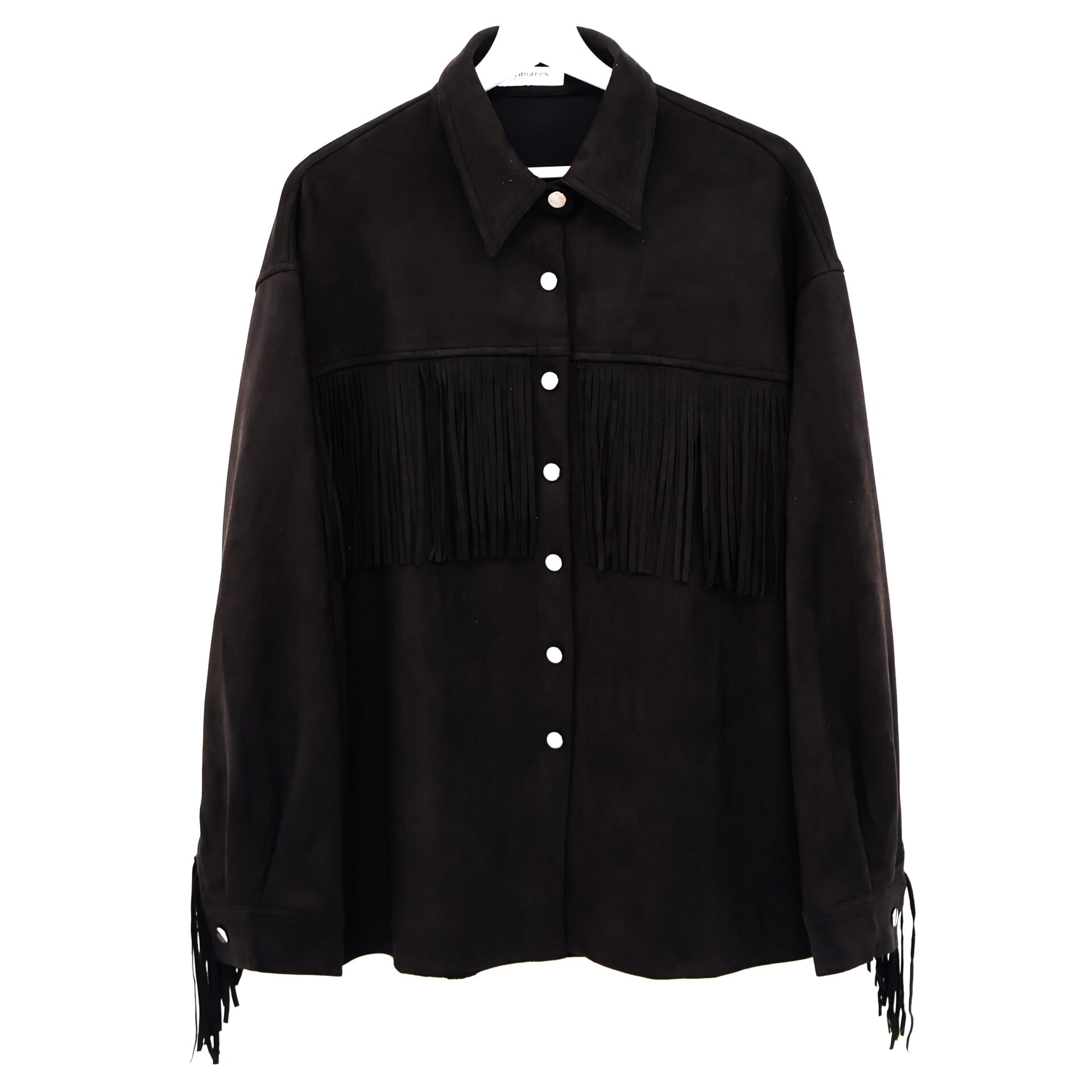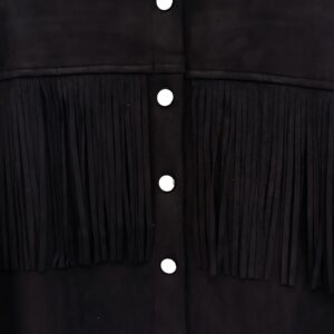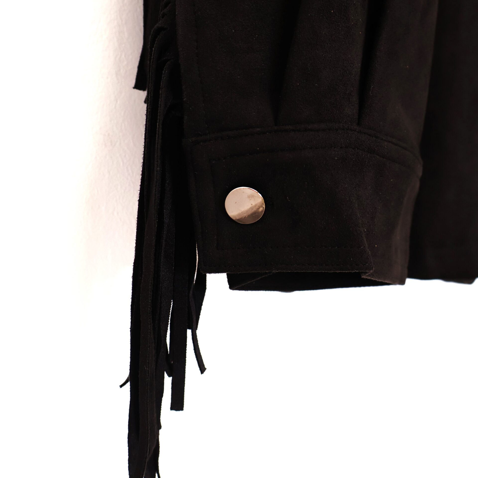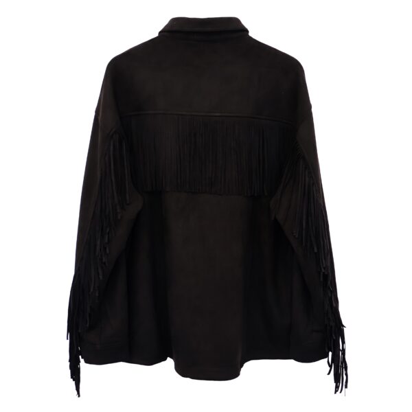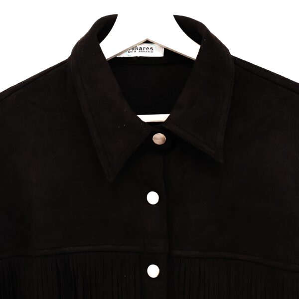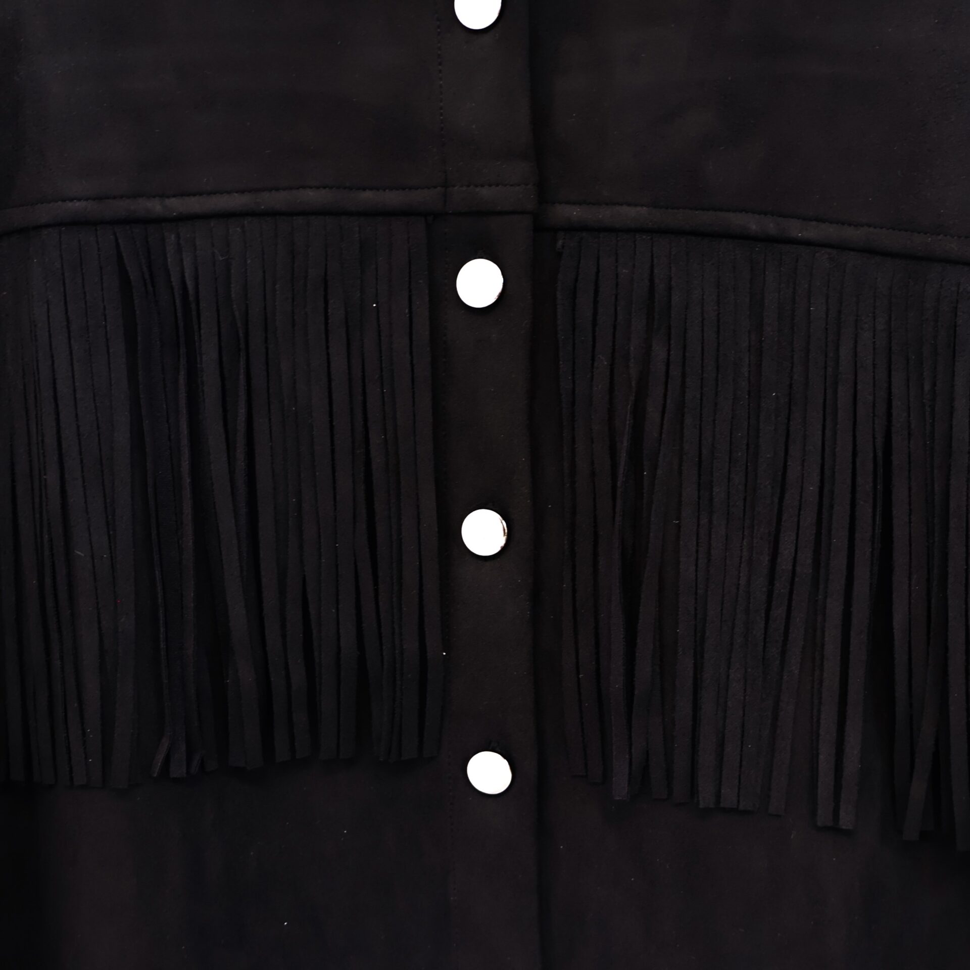 Chaqueta de flecos de corte oversize confeccionada en ante color negro. Cierre con botones. Manga caída con botón en los puños.