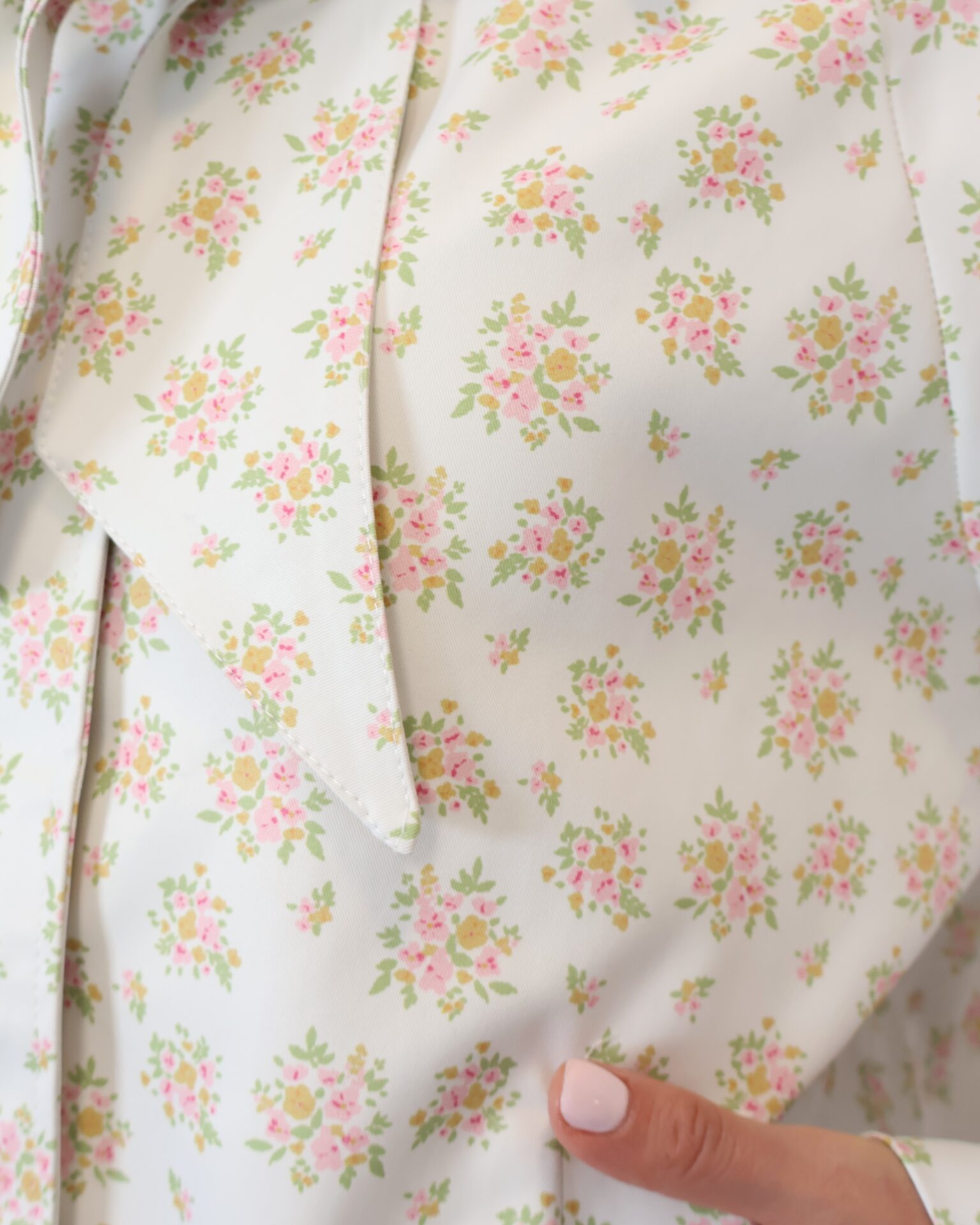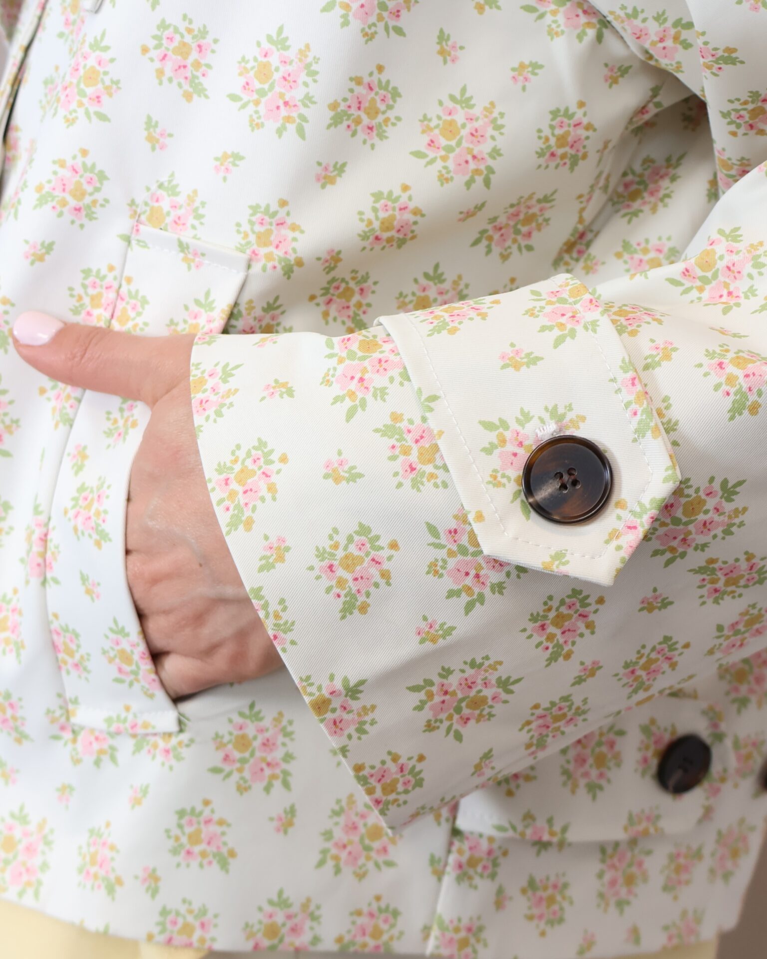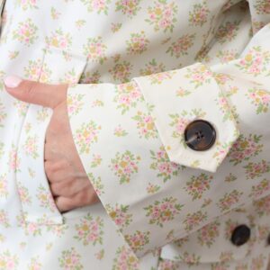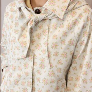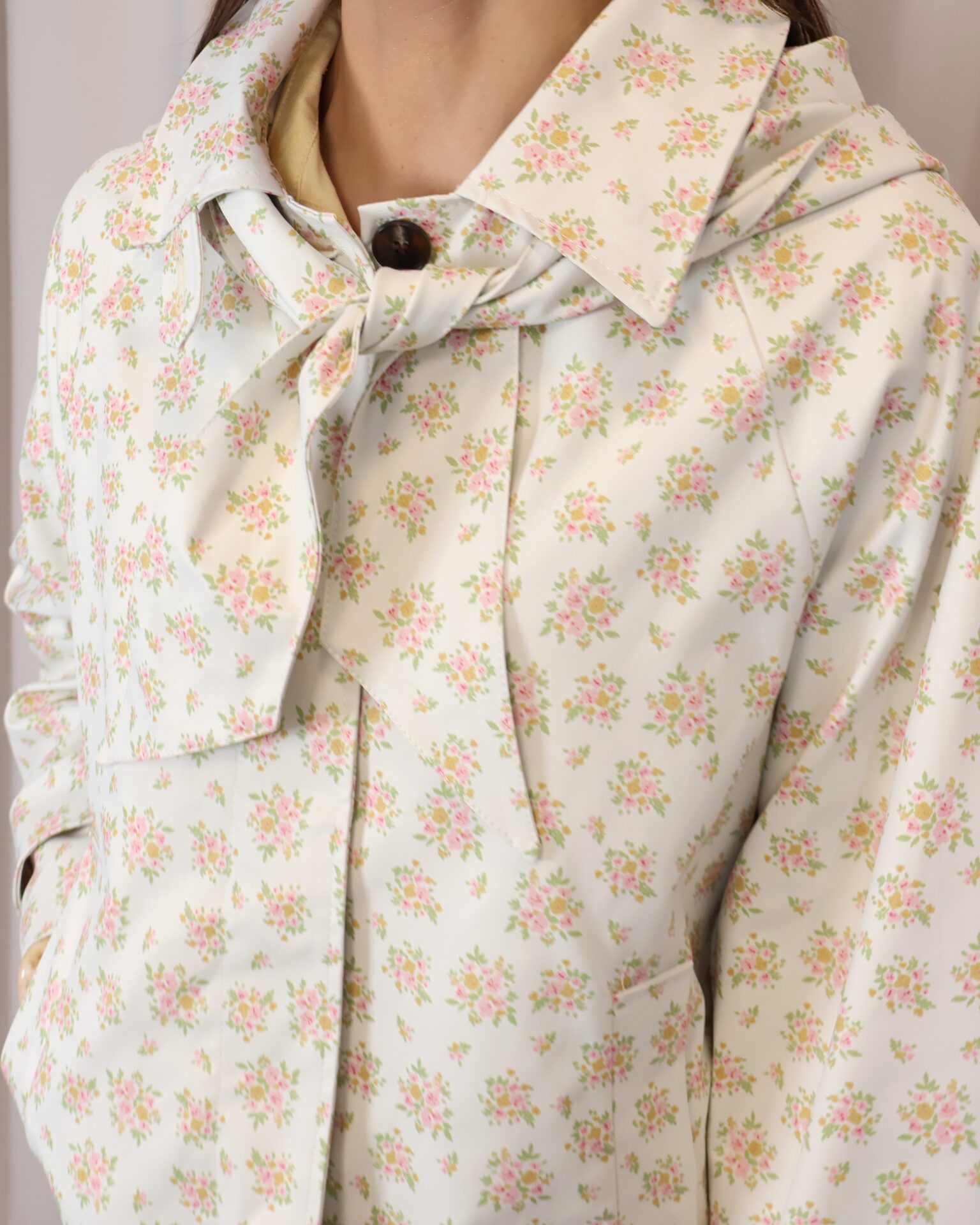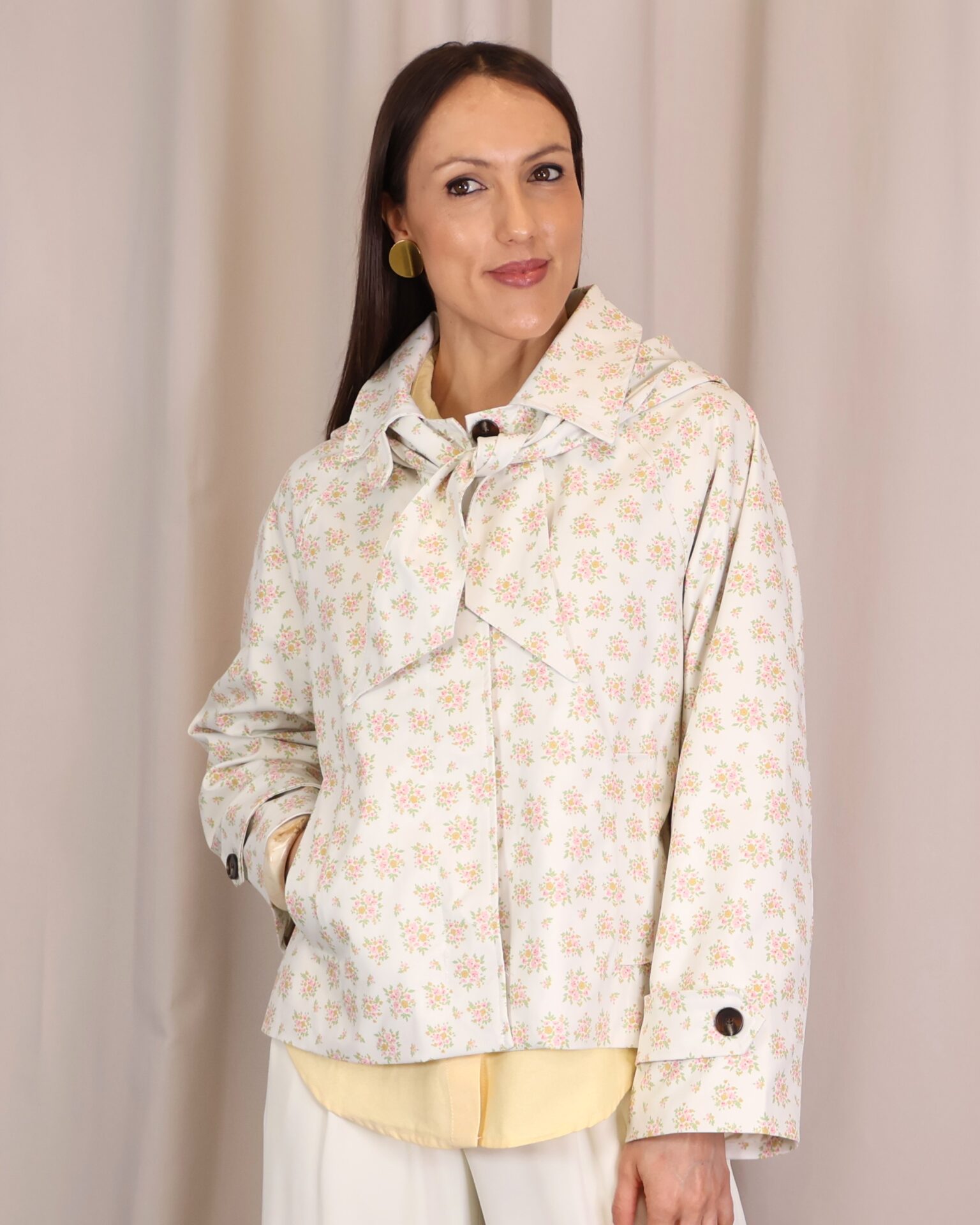 Chaqueta en color crudo con delicado estampado de flores en tonos rosas y detalles verdes, perfecta para aportar un toque fresco y femenino. Presenta cuello camisero y cierre frontal mediante botones, combinando estilo y funcionalidad. Incorpora bolsillos laterales prácticos y es impermeable, ideal para los días de lluvia sin renunciar al diseño. Incluye capucha tipo balaclava confeccionada en el mismo tejido y estampado, además de forro interior para mayor comodidad y protección.