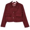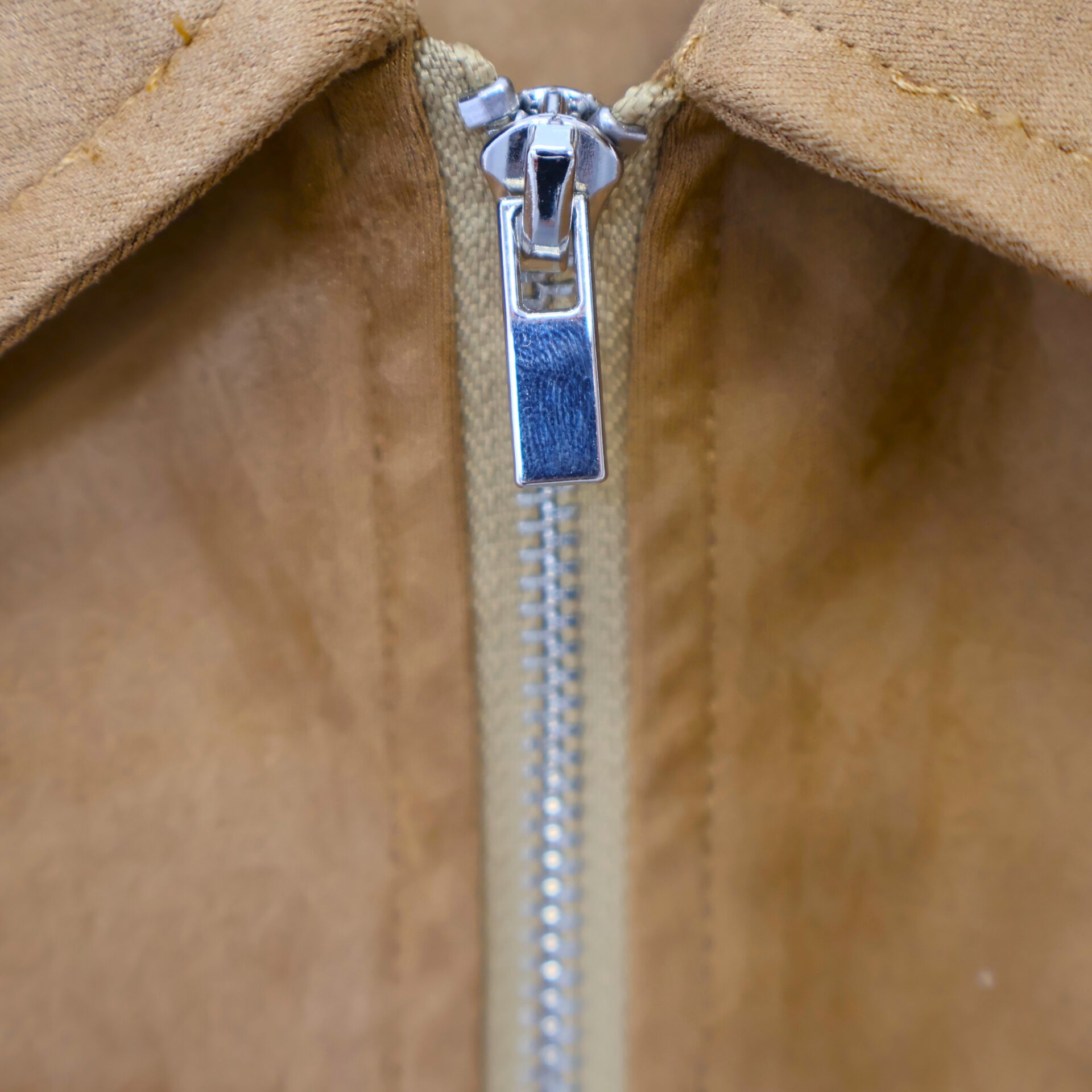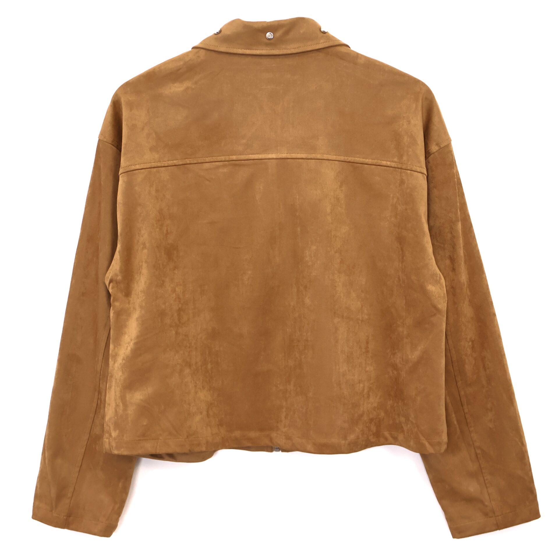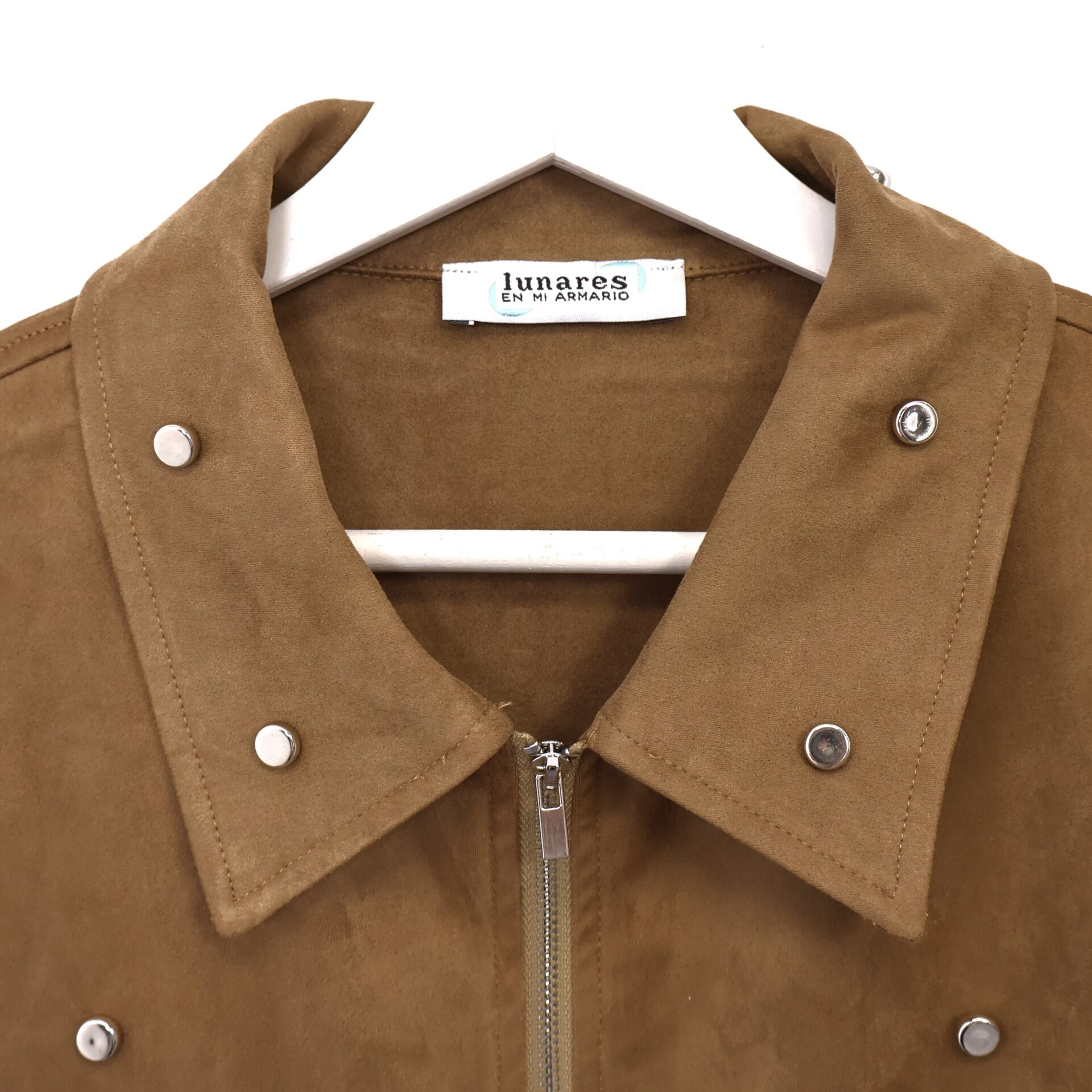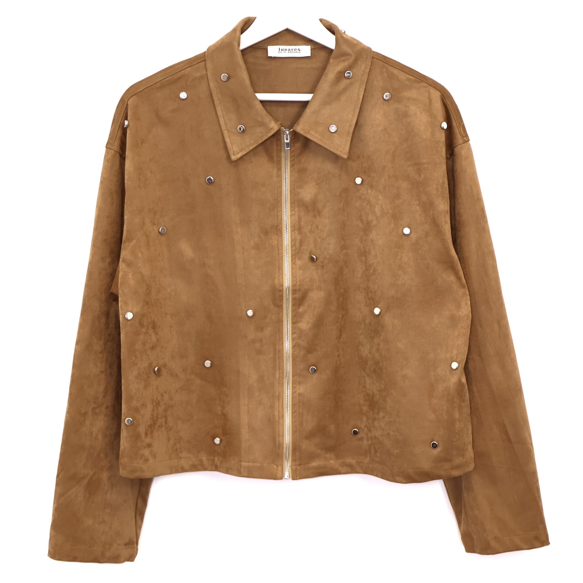 Chaqueta corta confeccionada en ante color camel. Cuello camisa y  cierre frontal con cremallera. Manga larga y caída. Tachuelas decorativas en la parte frontal y en la solapa del cuello.