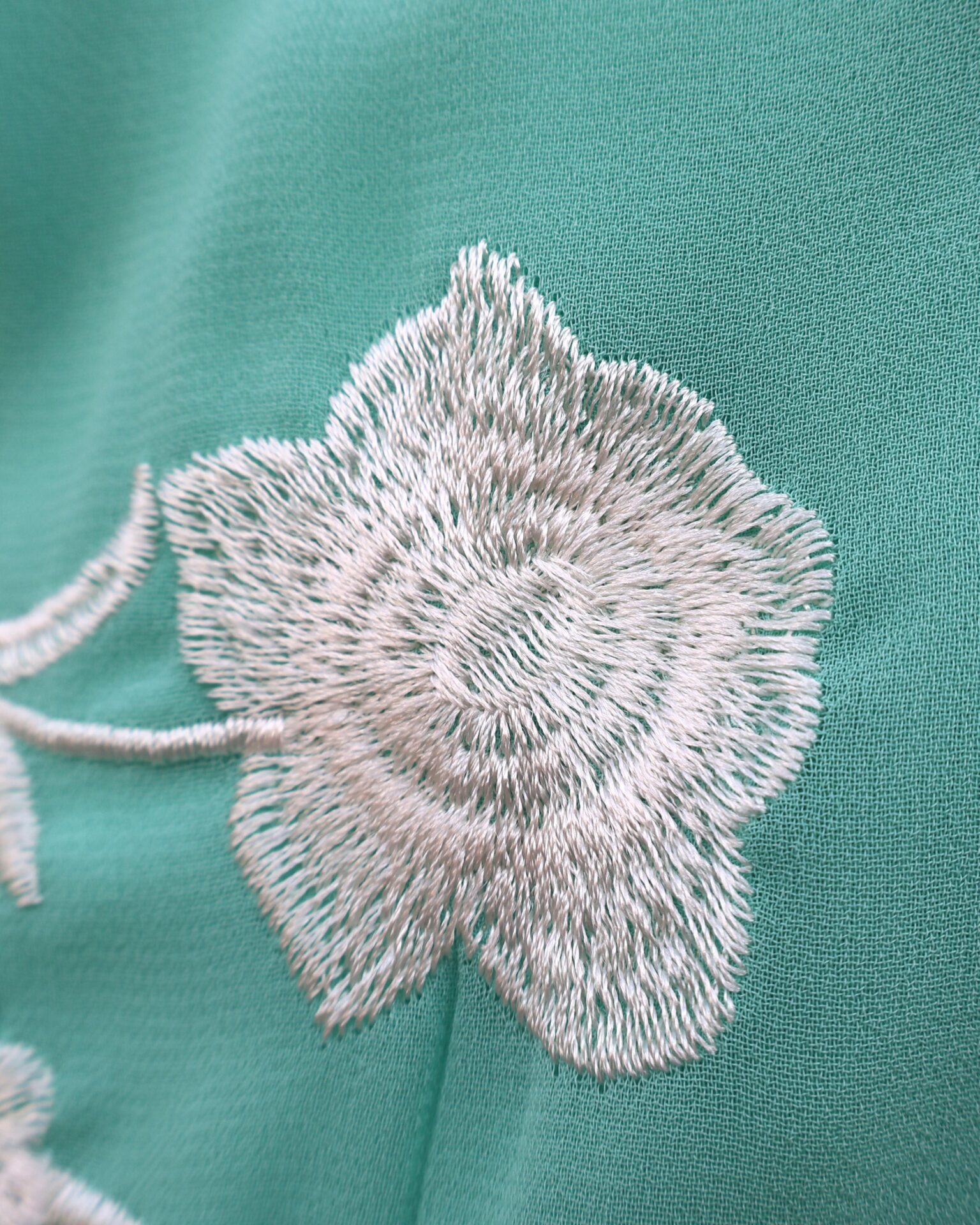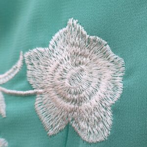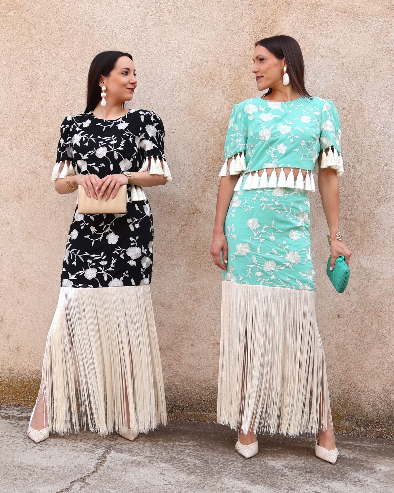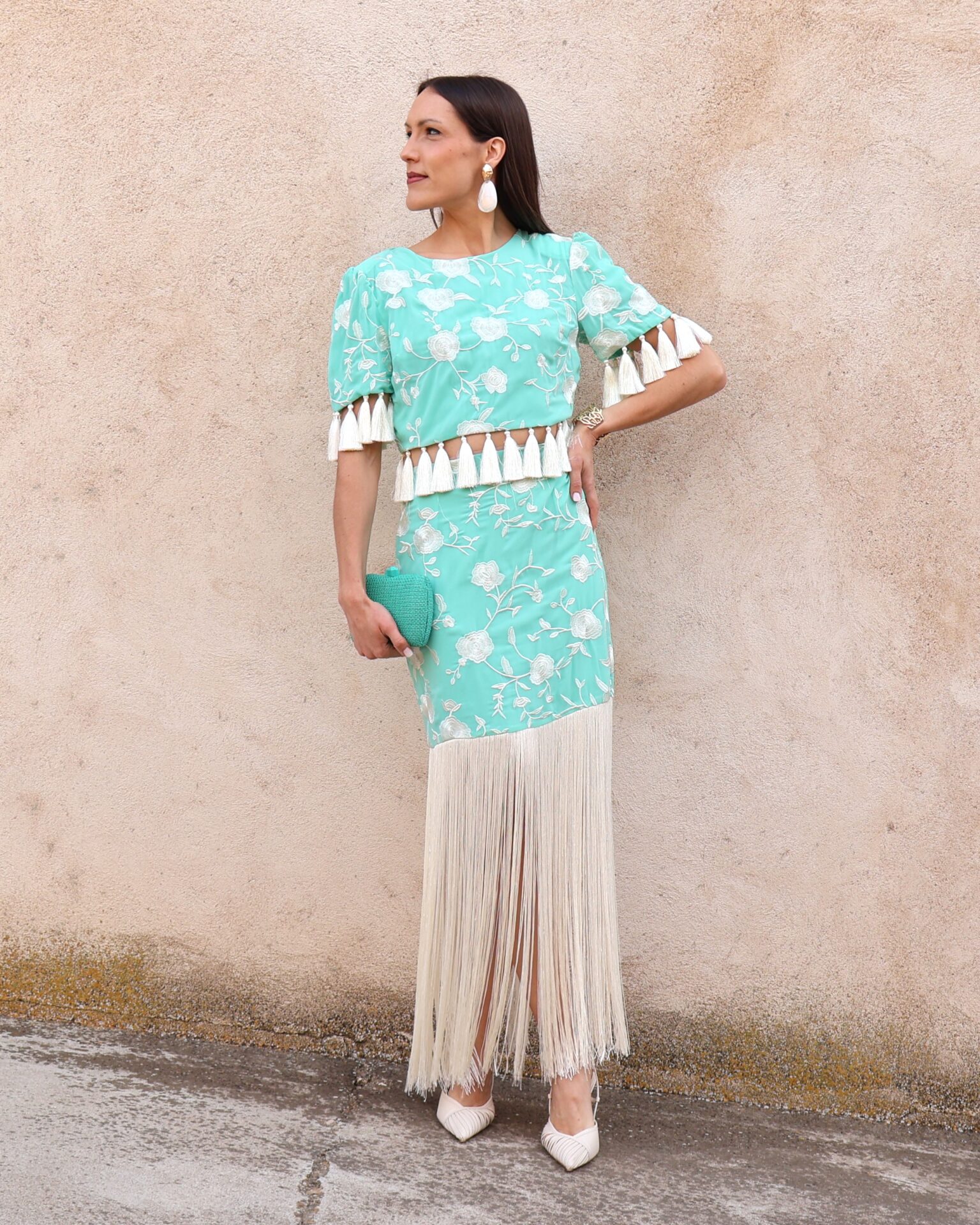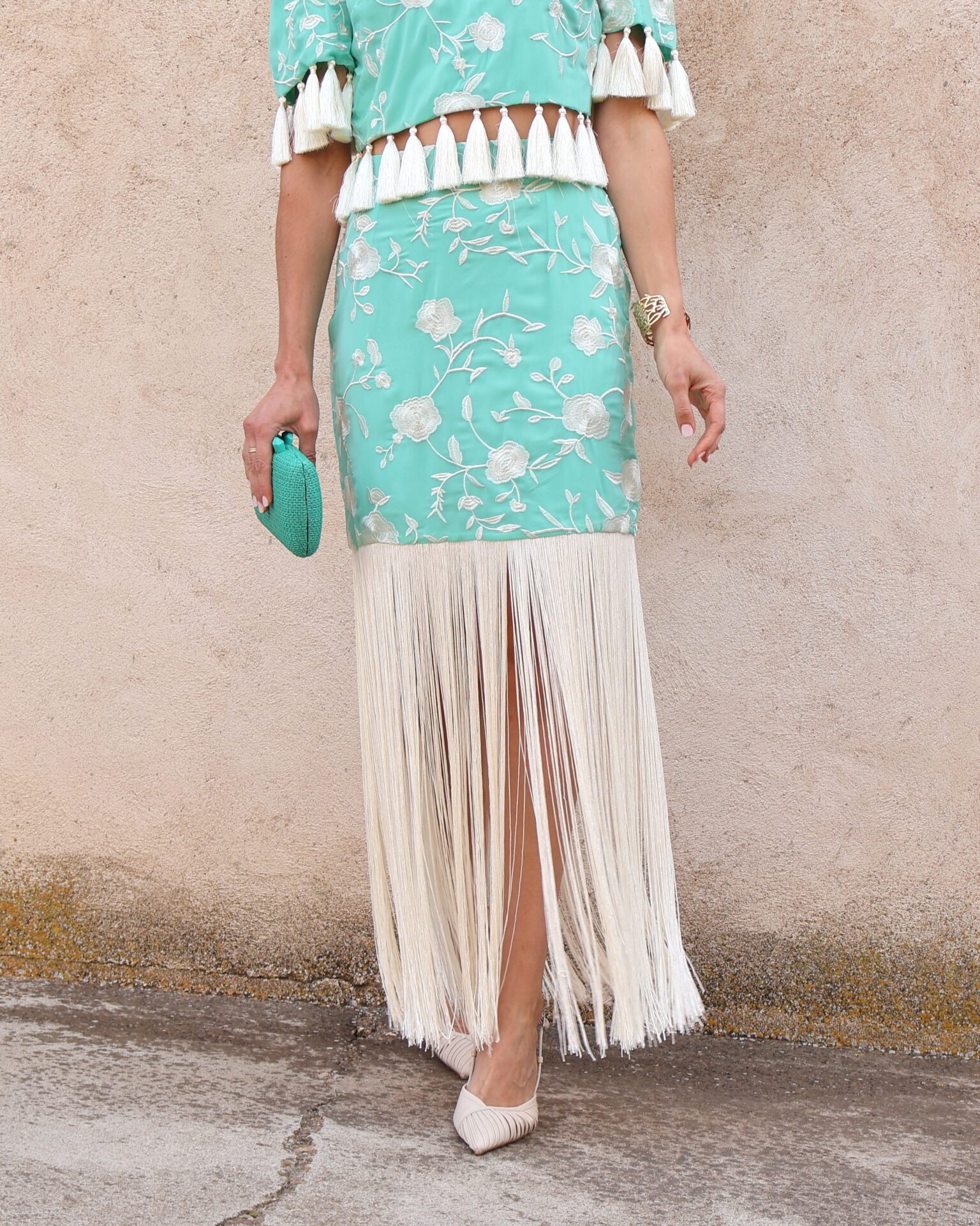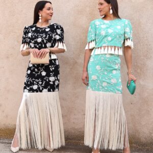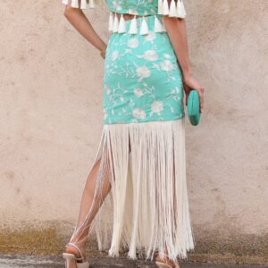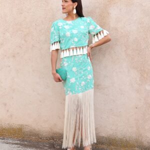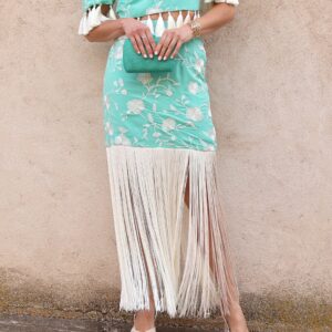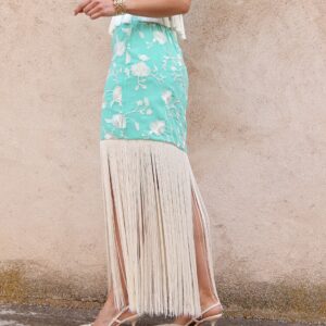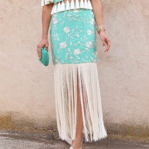Falda midi de tiro alto en color verde agua con bordado floral en contraste blanco. Destaca por su espectacular bajo rematado con largos flecos que aportan dinamismo y sofisticación al movimiento. Cuenta con cierre lateral mediante cremallera invisible, que garantiza un ajuste limpio y cómodo y goma en la parte trasera de la cintura para mayor adaptabilidad y confort. Su silueta estiliza la figura y la convierte en una prenda protagonista ideal para eventos o celebraciones.