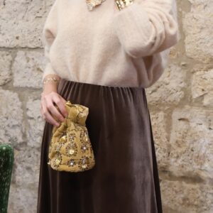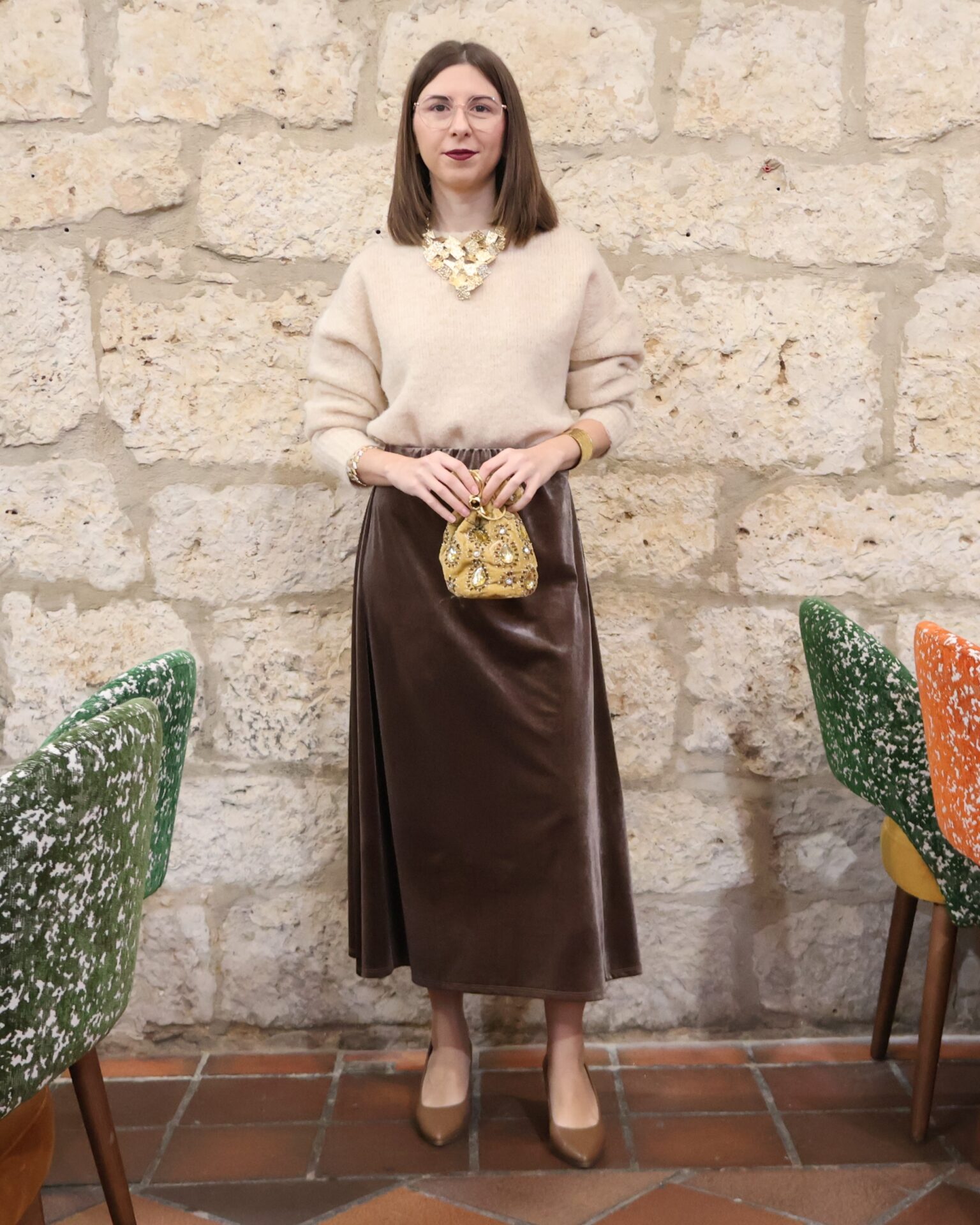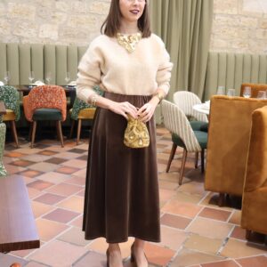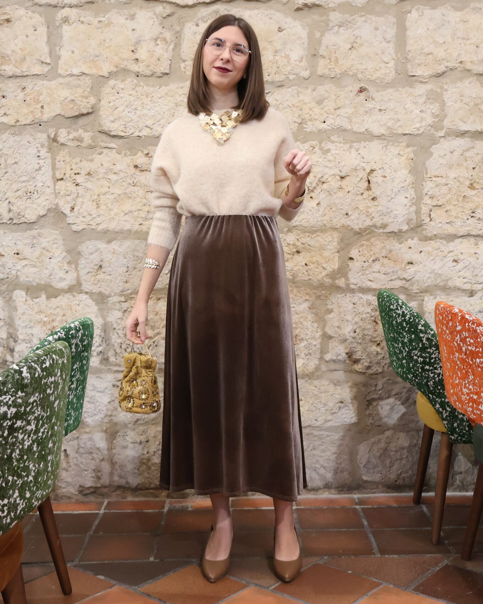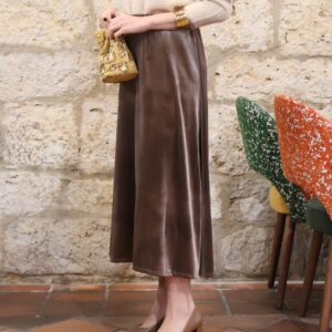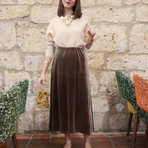 Falda midi confeccionada en terciopelo de color taupe, suave y elegante, que se ajusta cómodamente gracias a su cintura elástica con goma en todo el contorno.