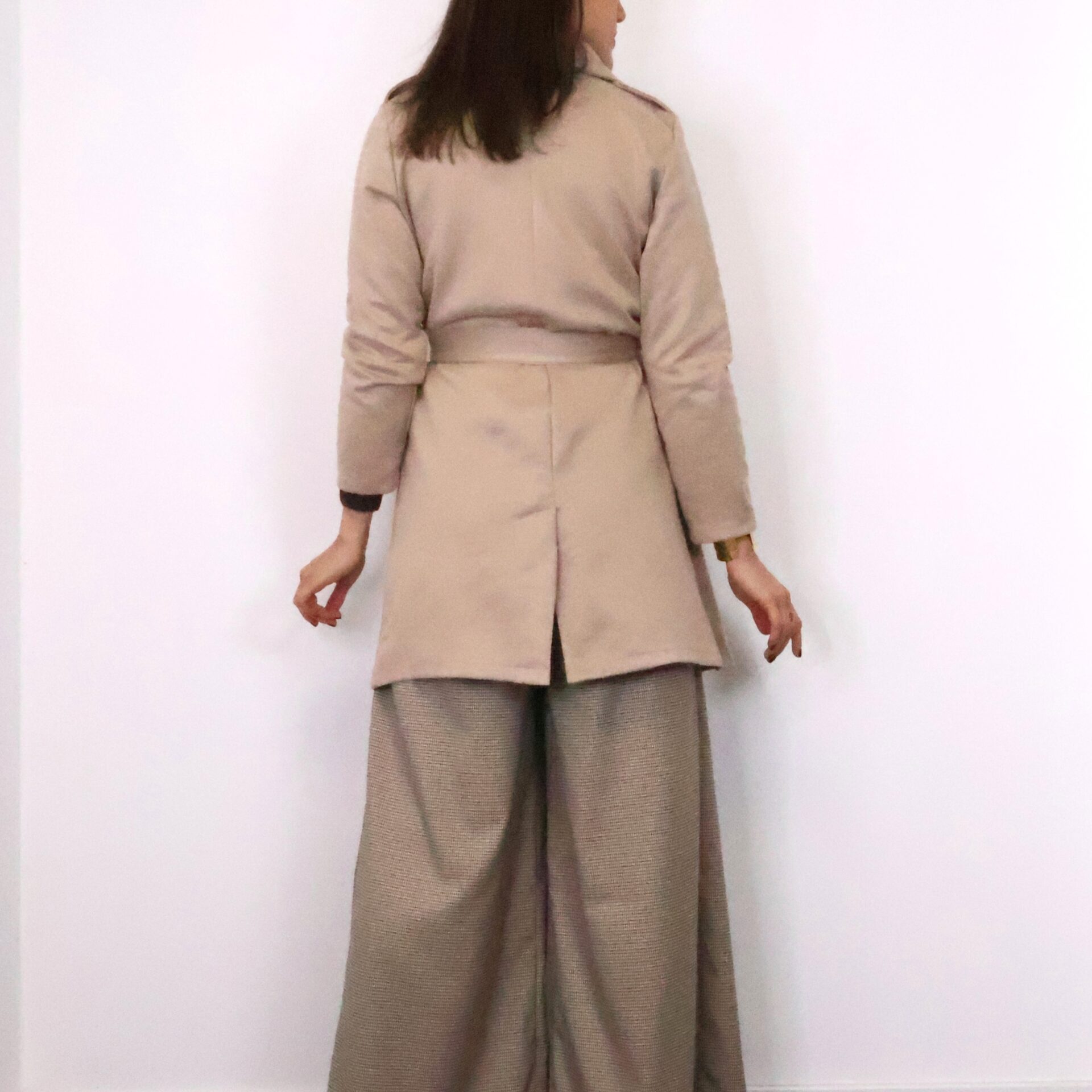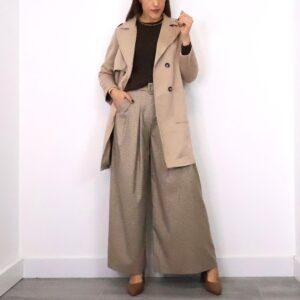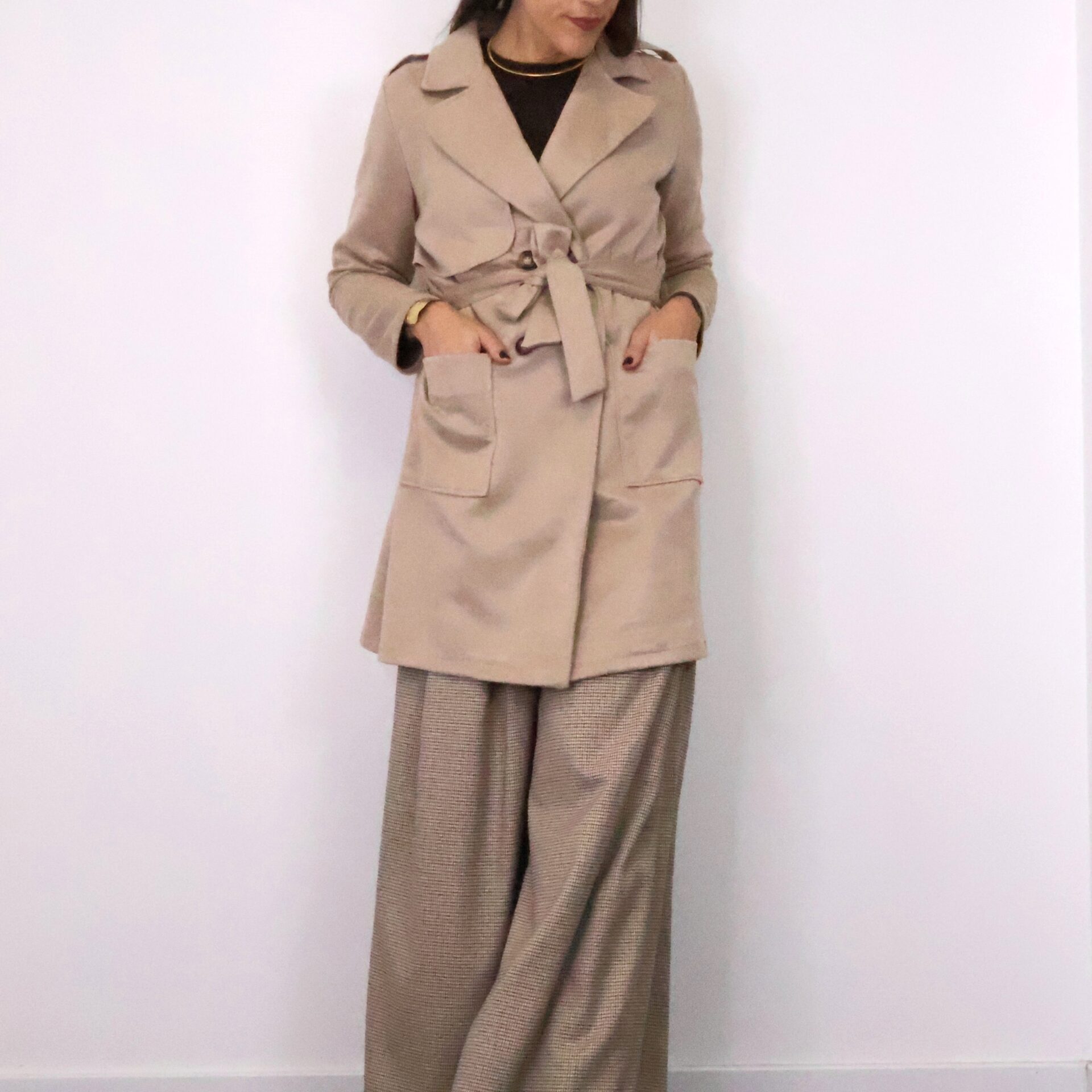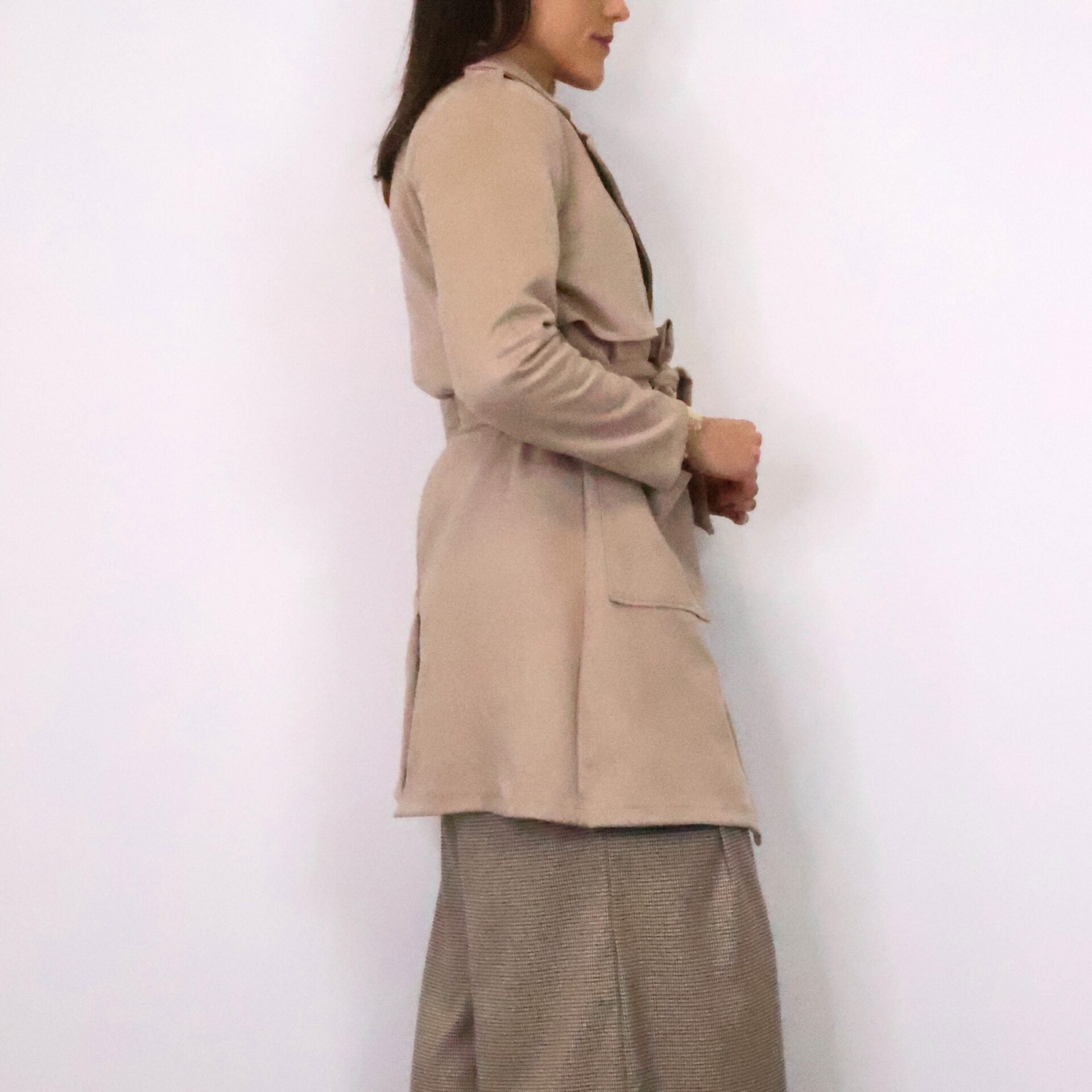 Gabardina midi confeccionada en ante de color beige. Con cuello solapa y bolsillos delanteros. Cintura ajustable con cinturón del mismo tejido.