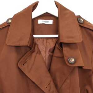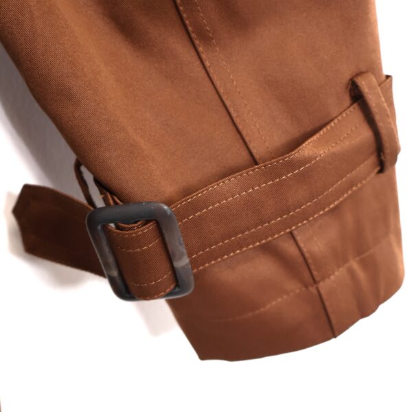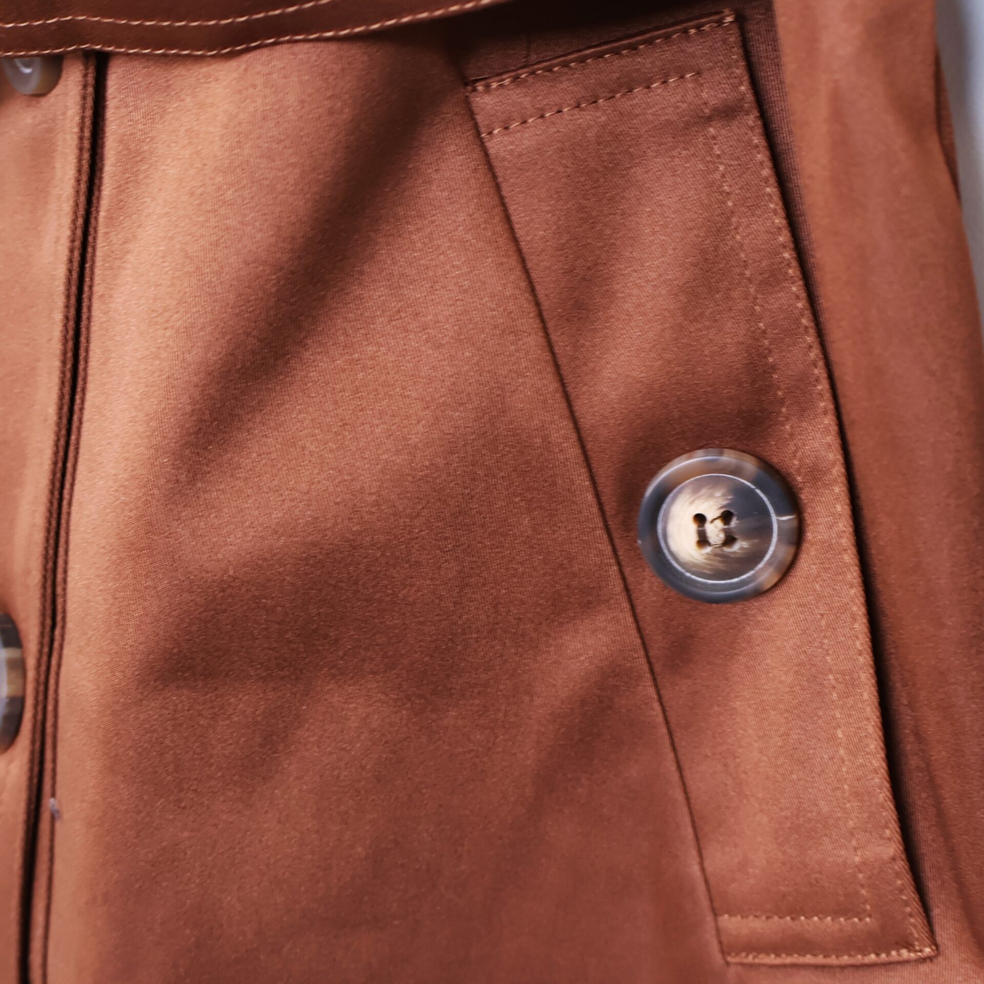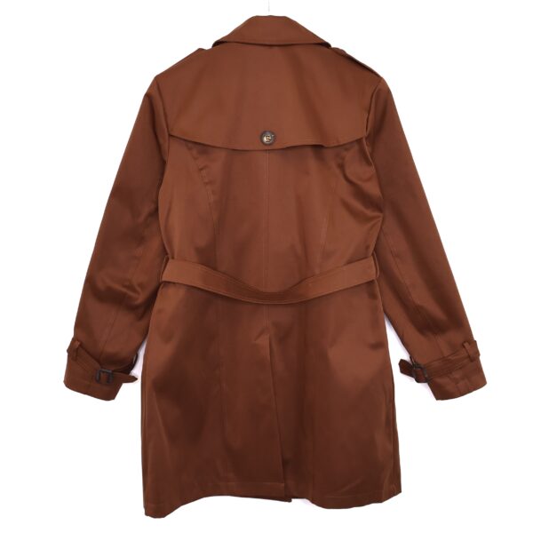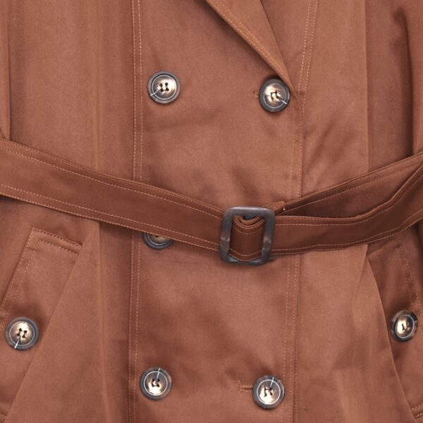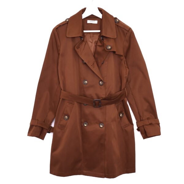 Gabardina midi de color café. Con forro interior y bolsillos delanteros. Cuello solapa. Cierre con botones delanteros. Detalle de trabillas en hombro y manga. Cintura ajustable con cinturón del mismo tejido.