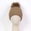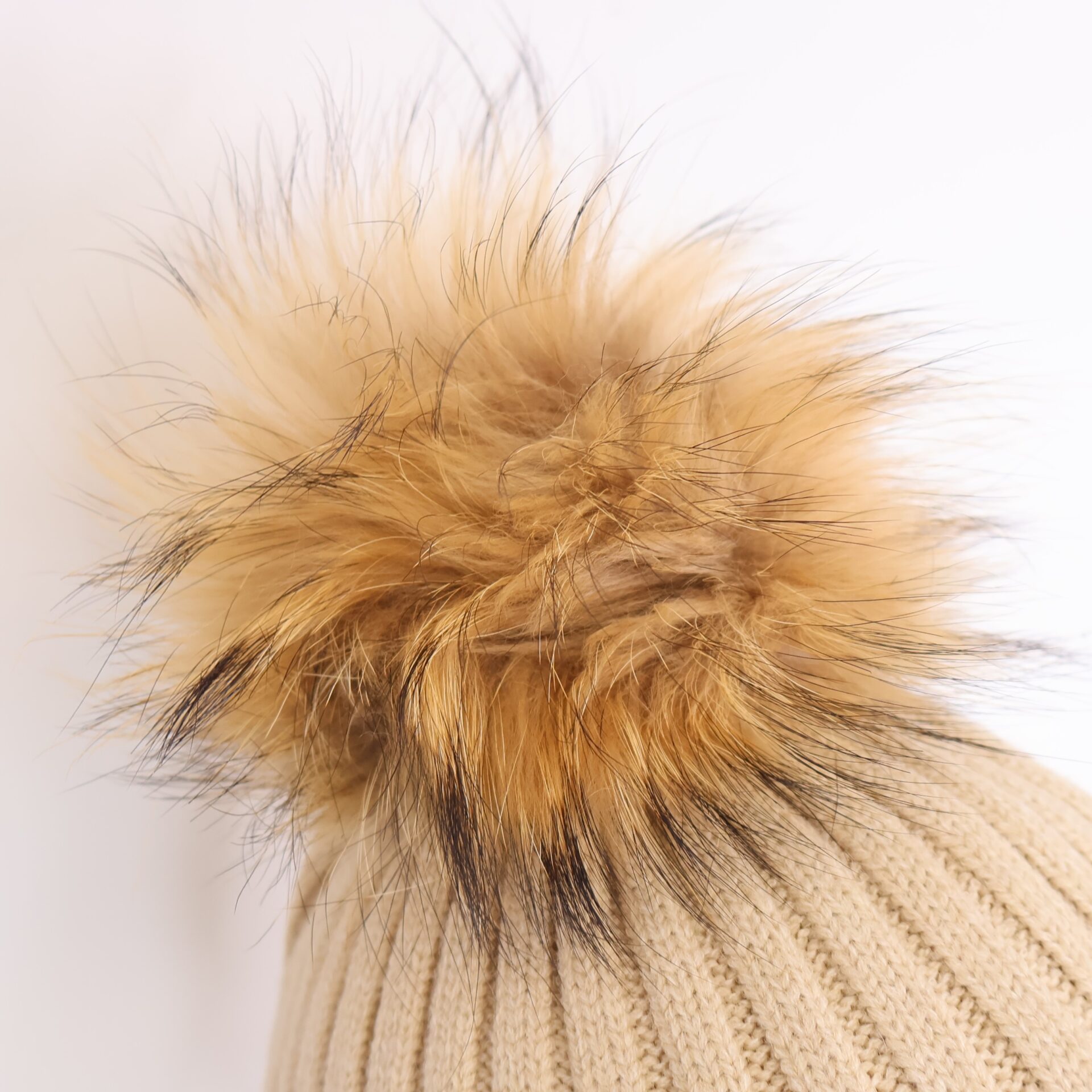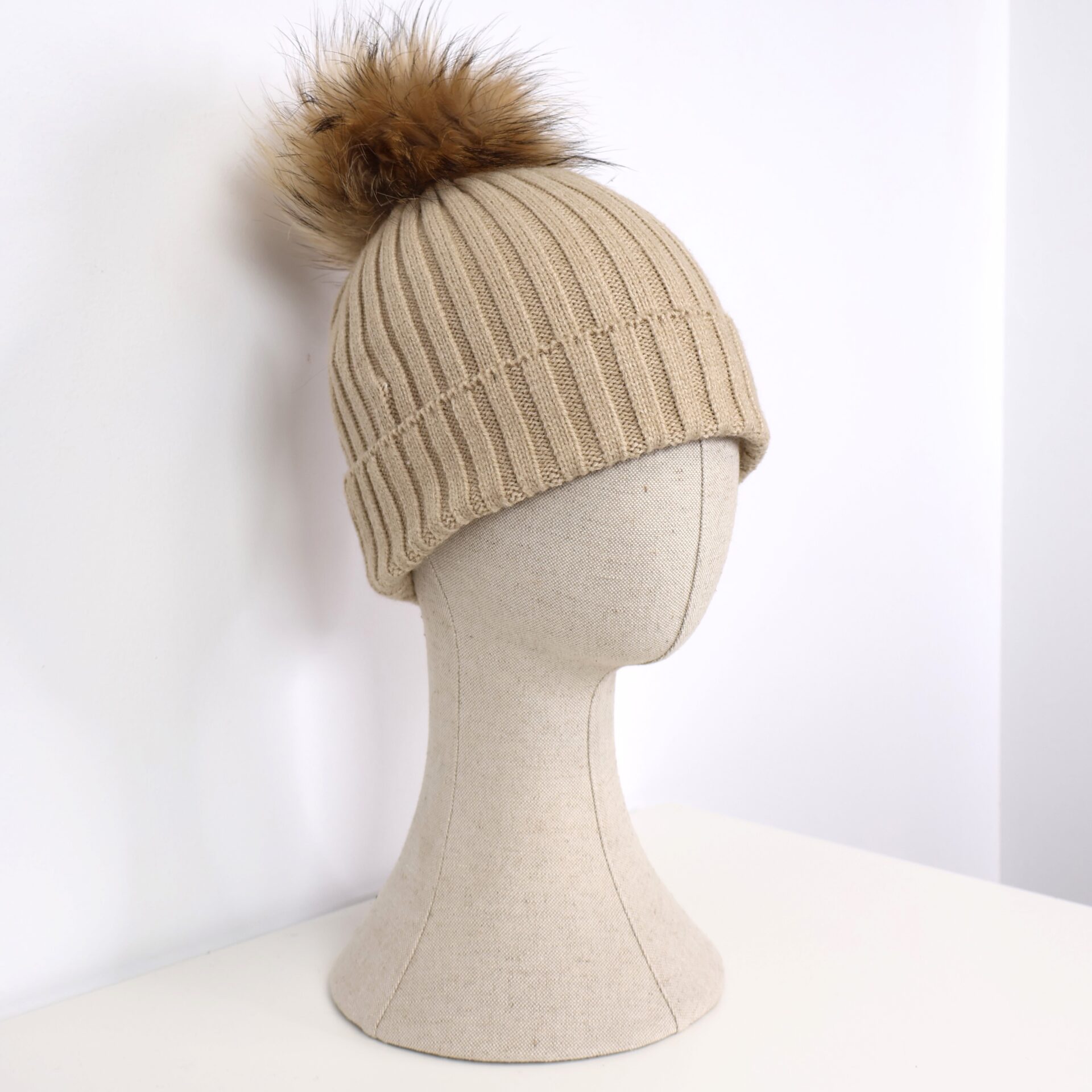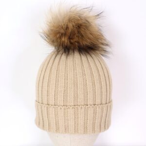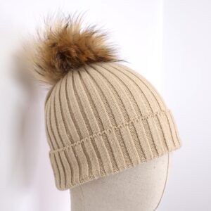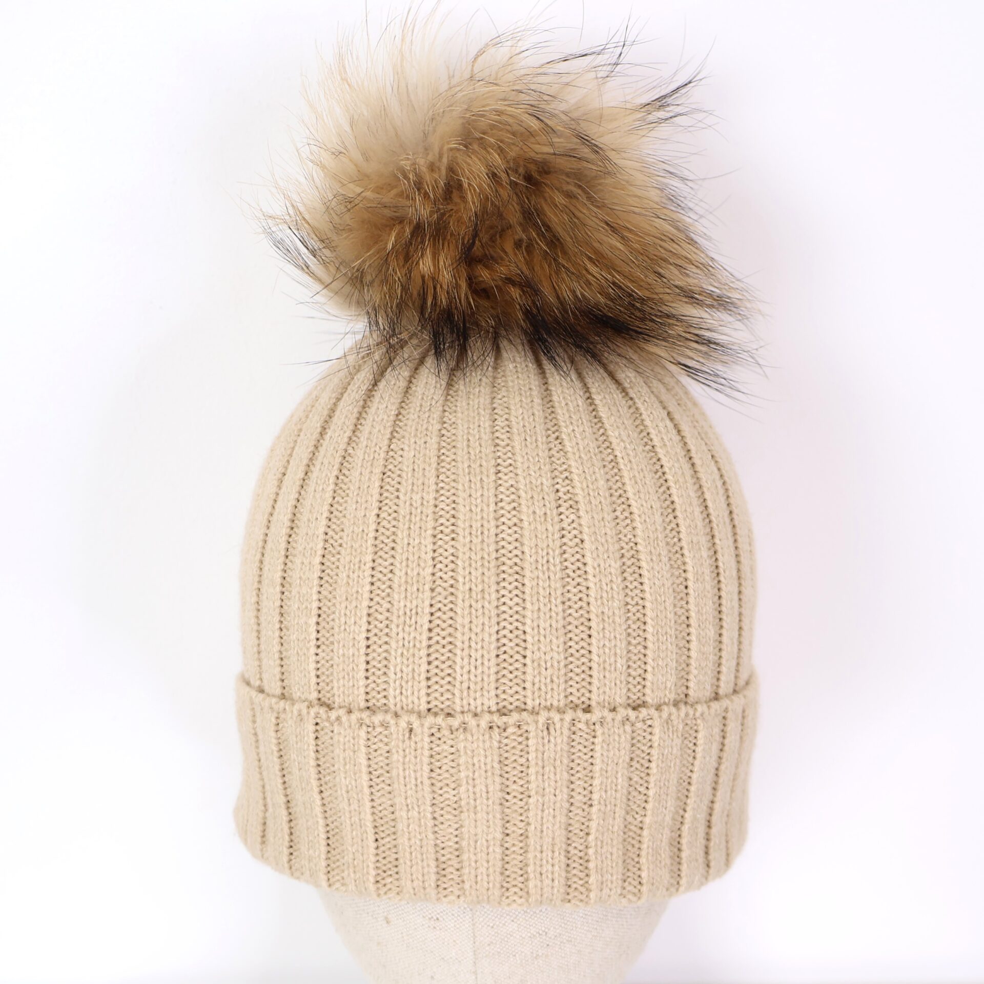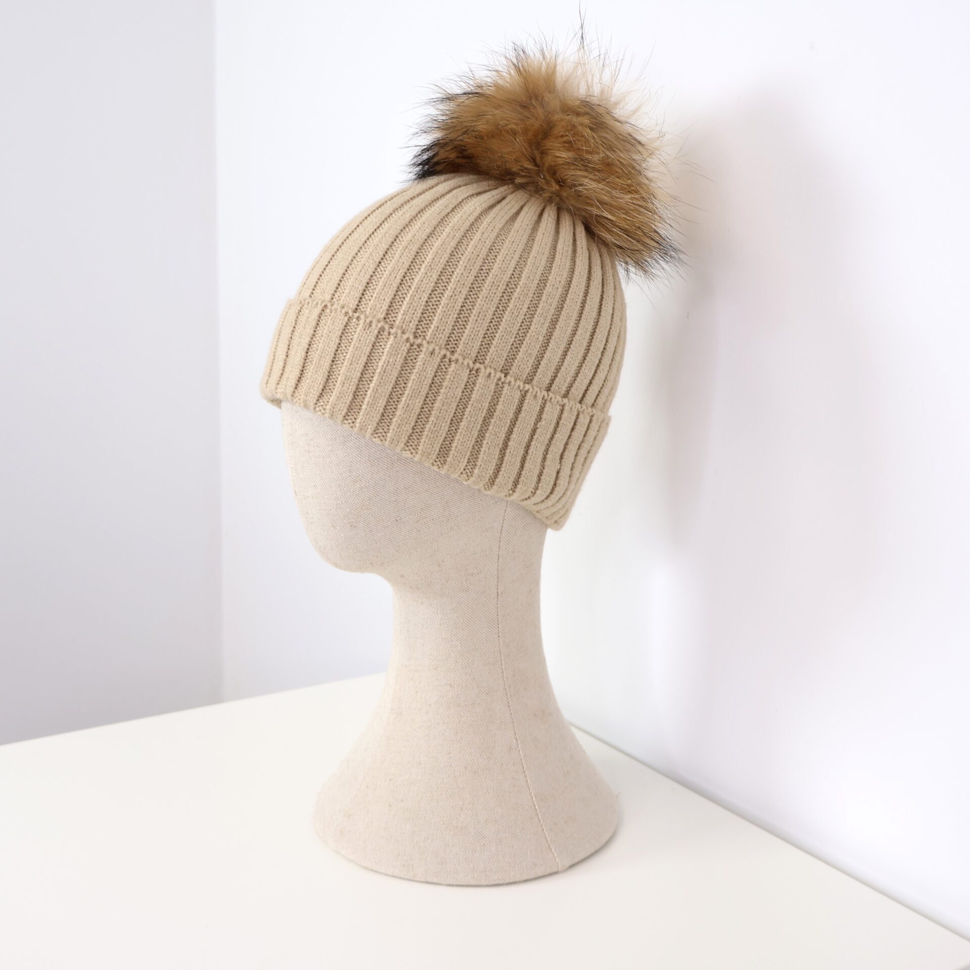 Gorro confeccionado en tejido de punto con líneas verticales decorativas y pompón de pelo natural desmontable.