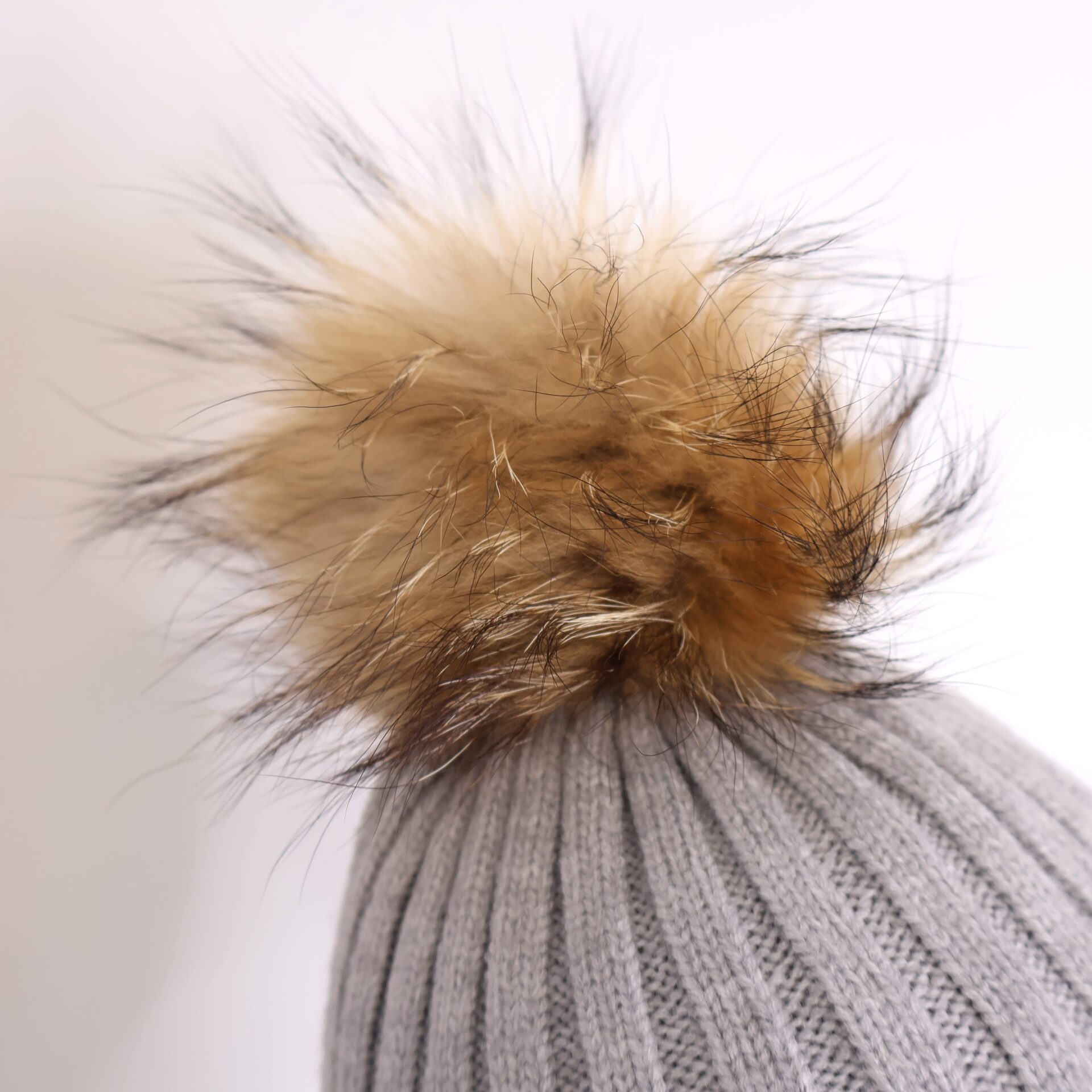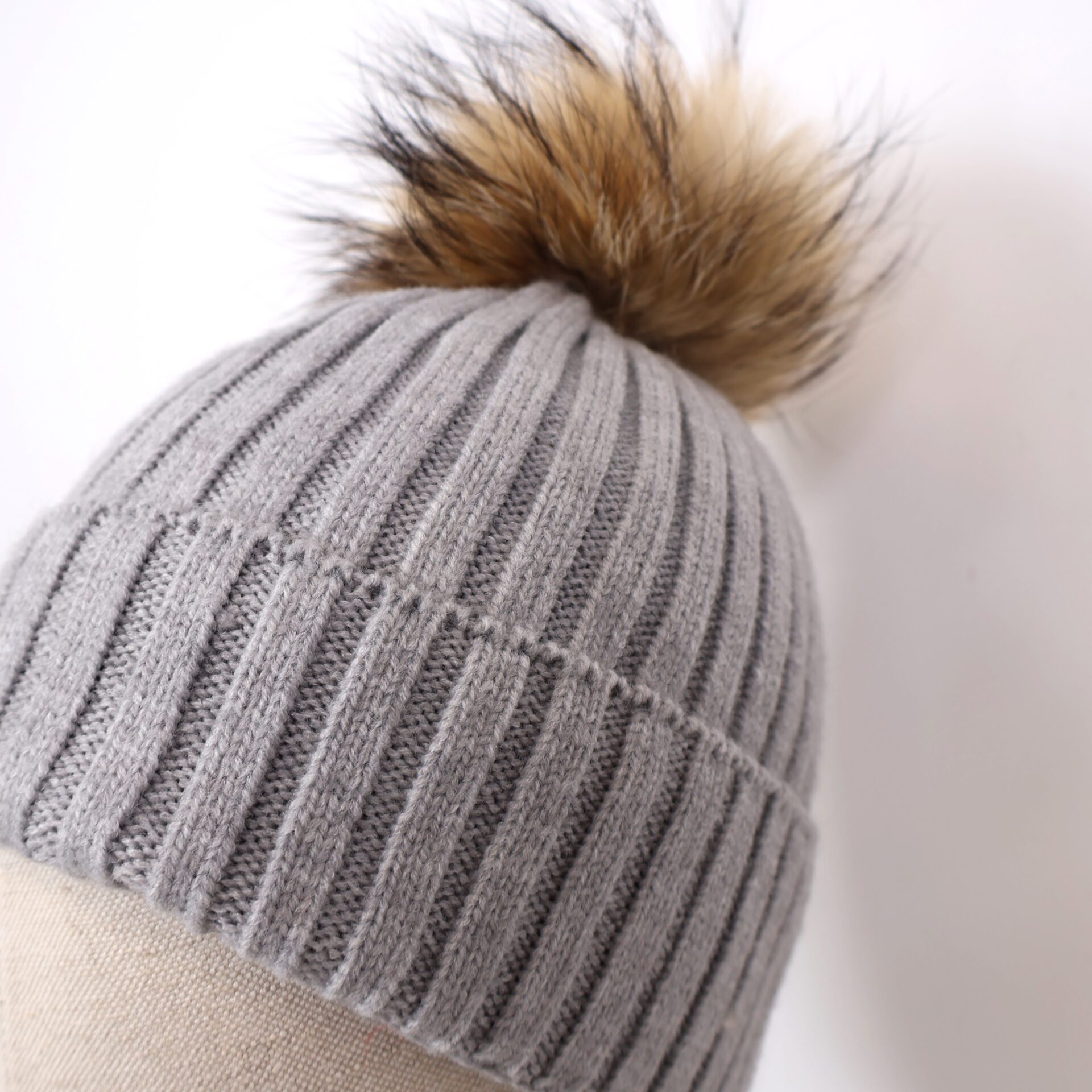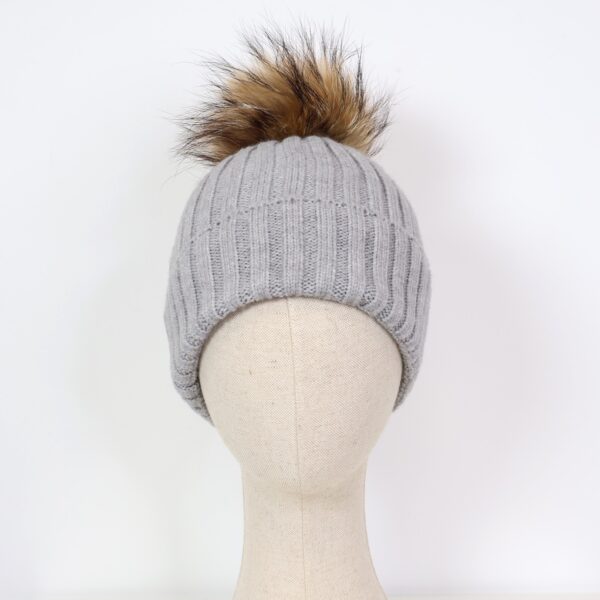 Gorro confeccionado en tejido de punto con líneas verticales decorativas y pompón de pelo natural desmontable.