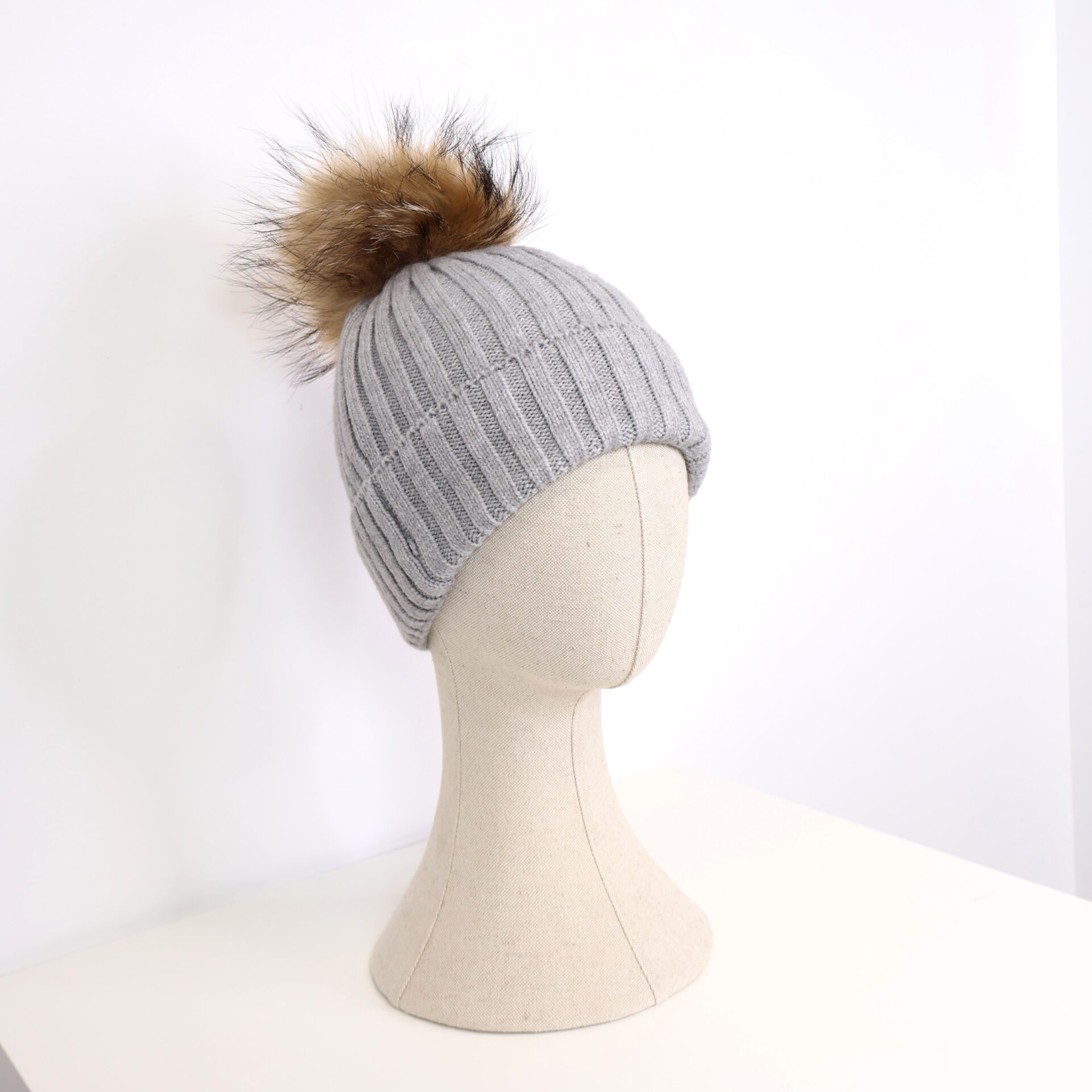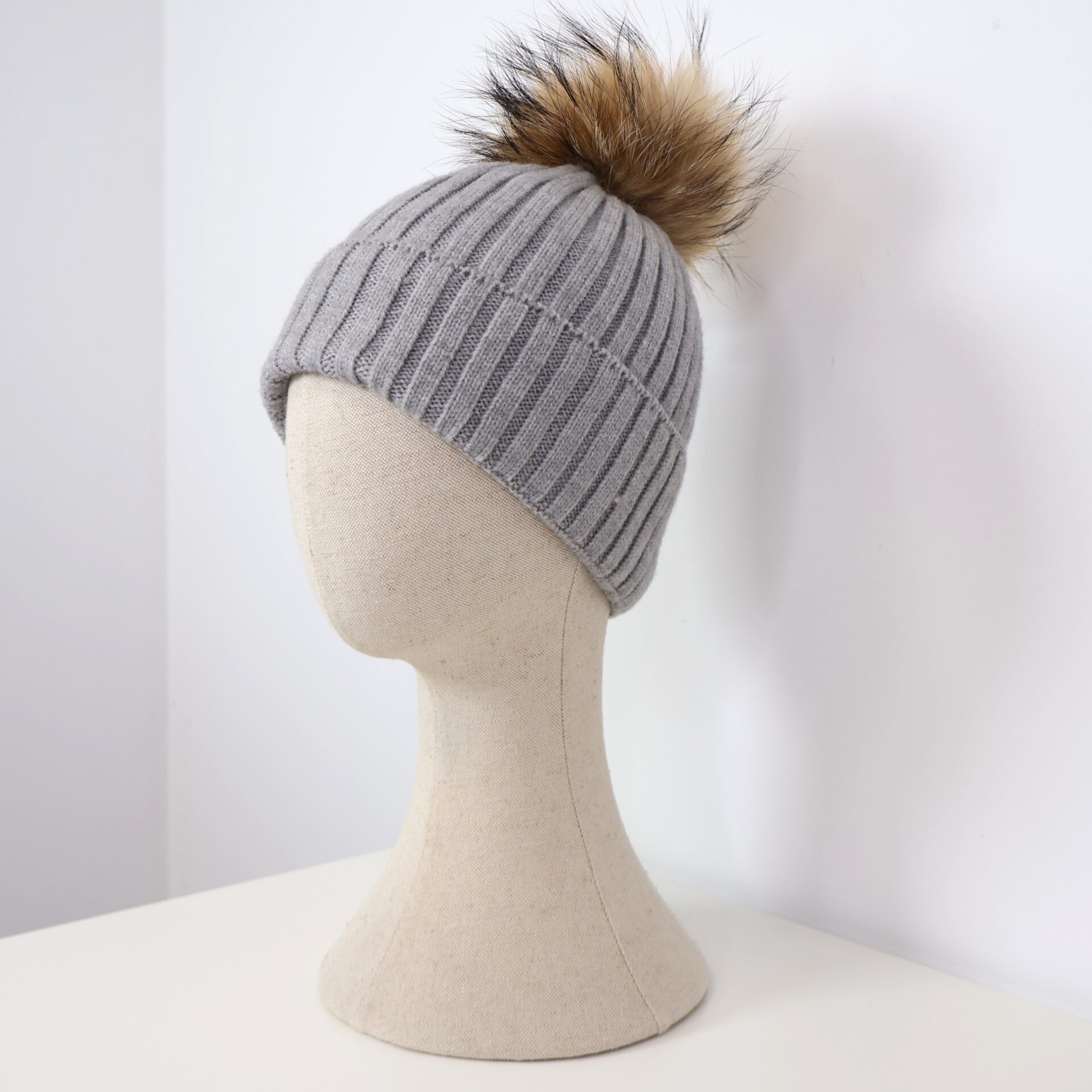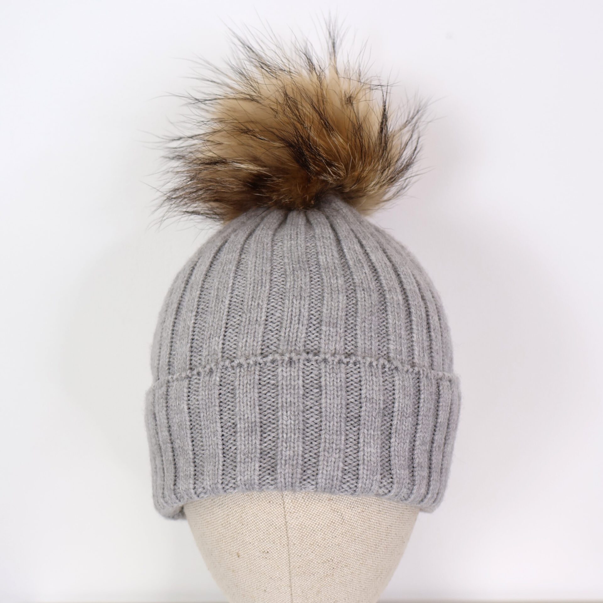 Gorro confeccionado en tejido de punto con líneas verticales decorativas y pompón de pelo natural desmontable.
