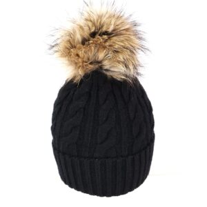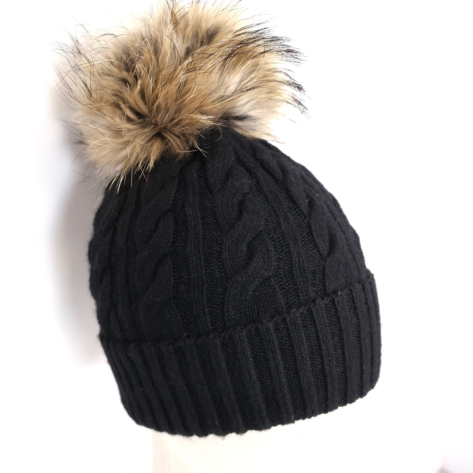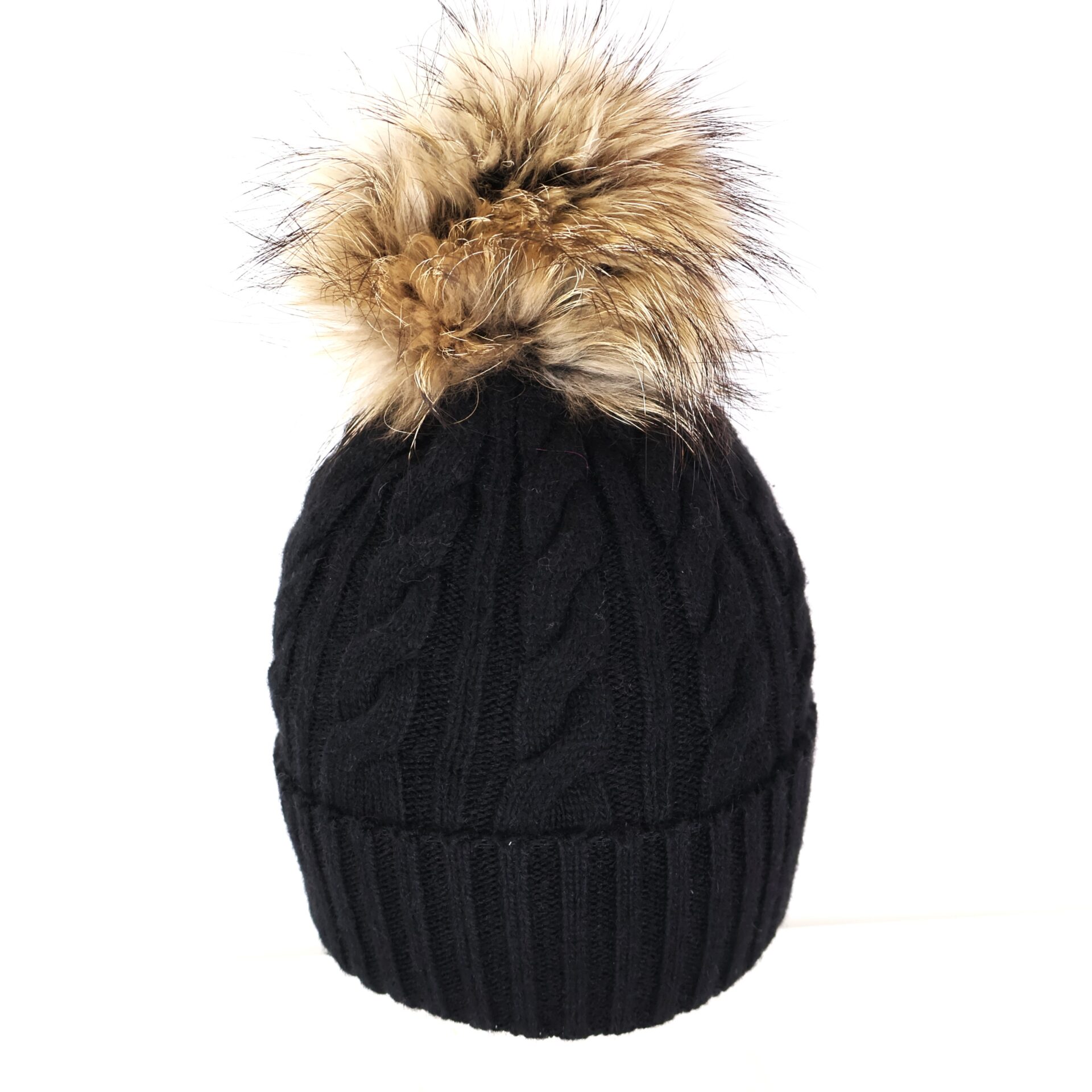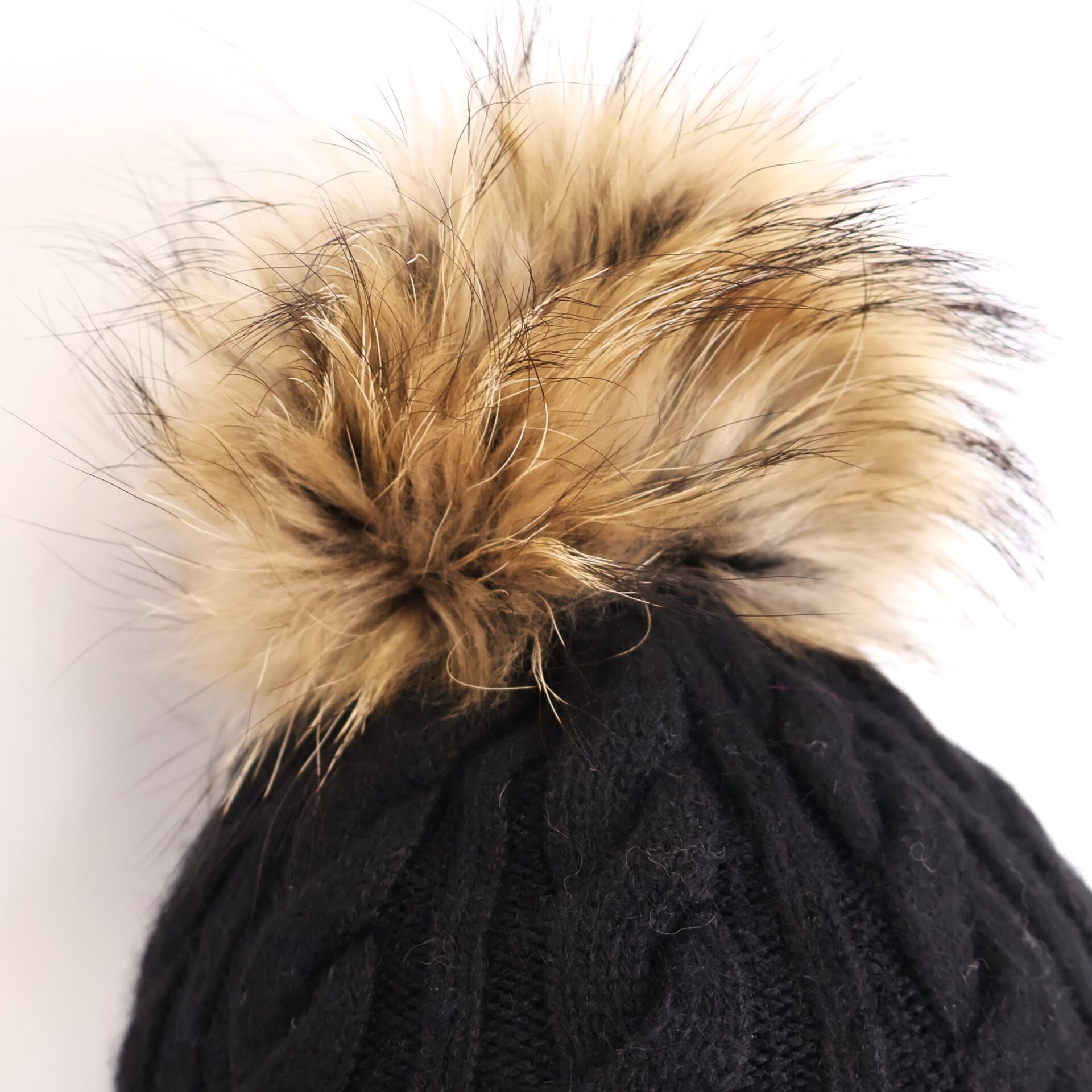 Gorro confeccionado en tejido de punto con líneas verticales y pequeñas listas de ochos trenzados decorativas. Pompón de pelo natural desmontable.