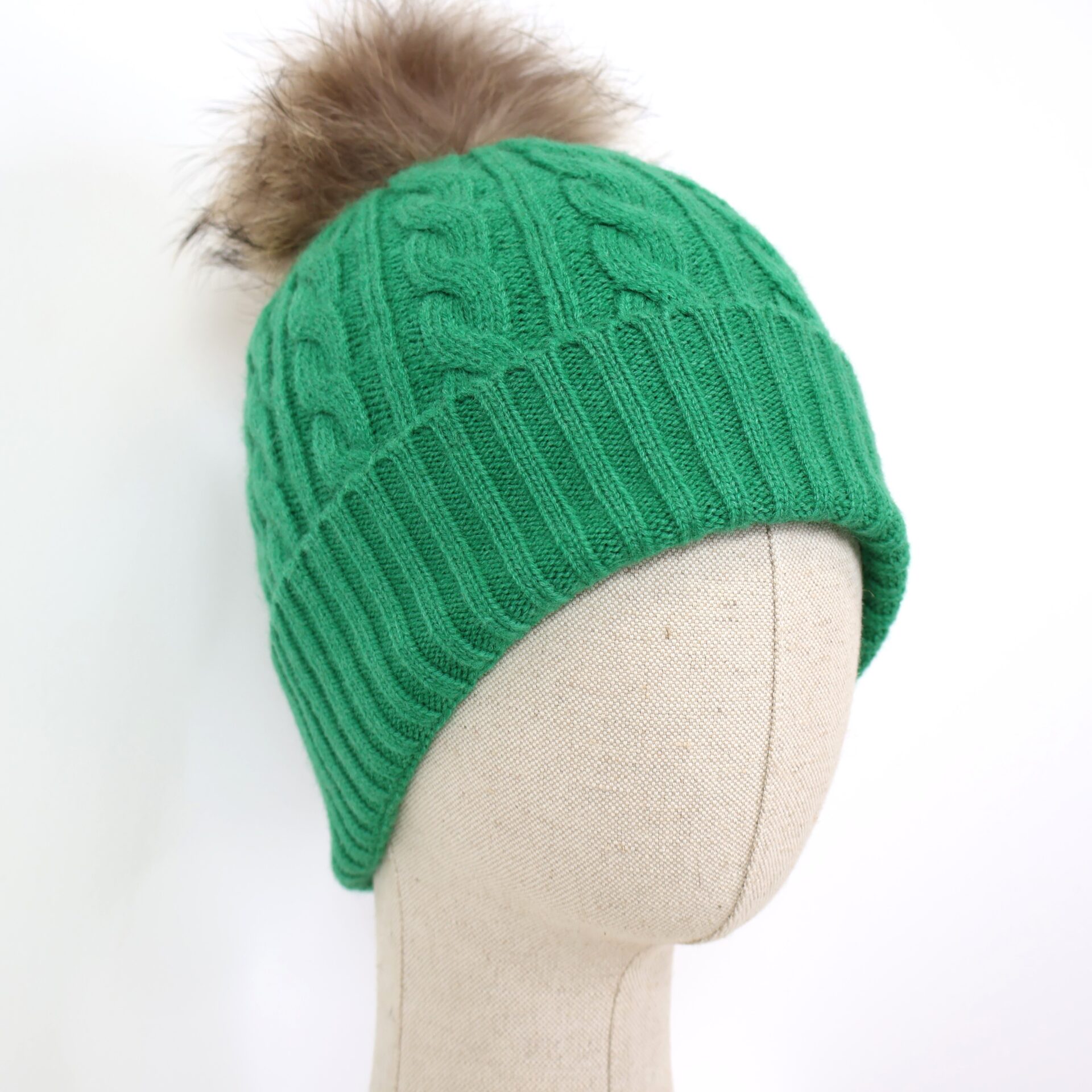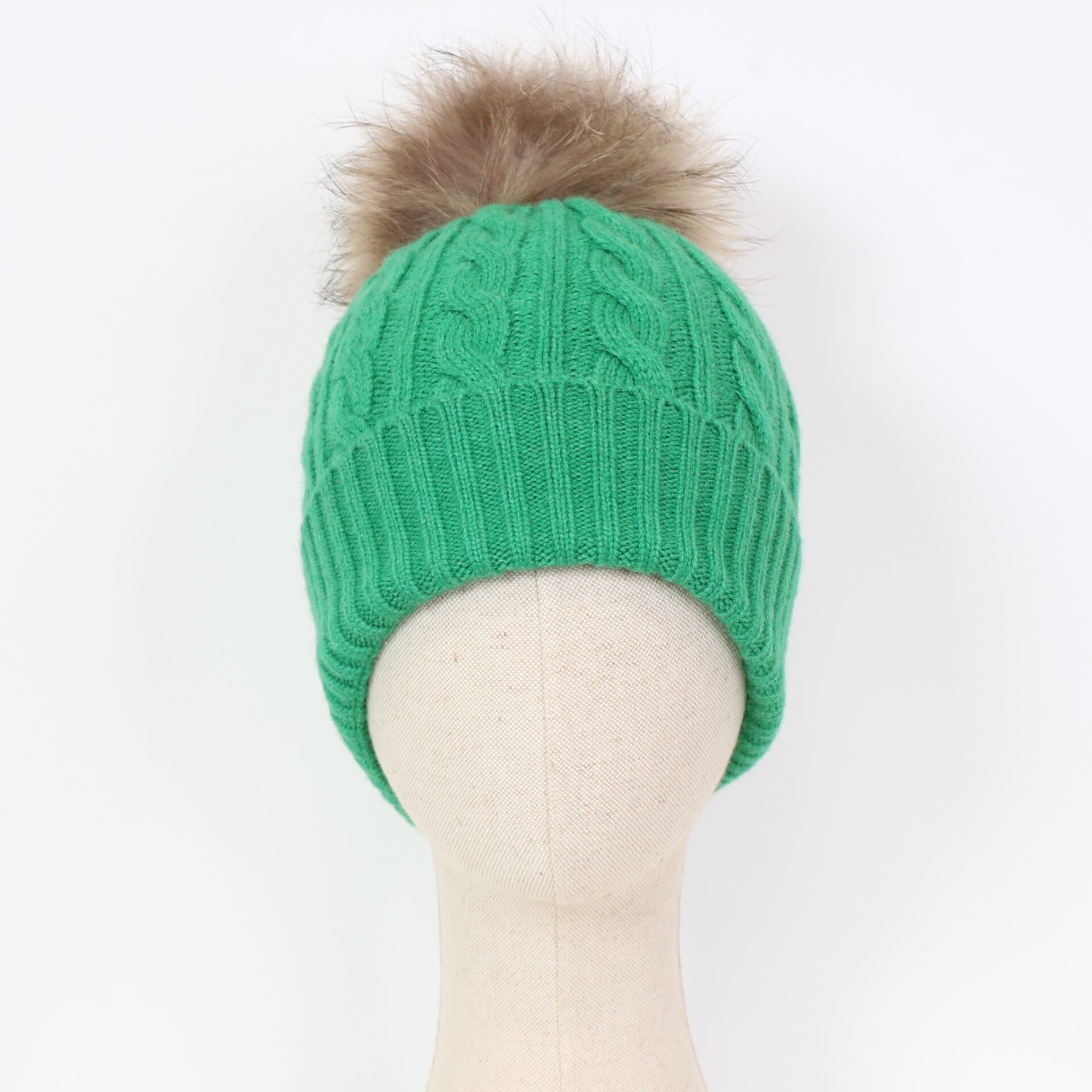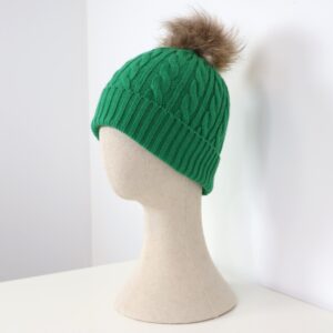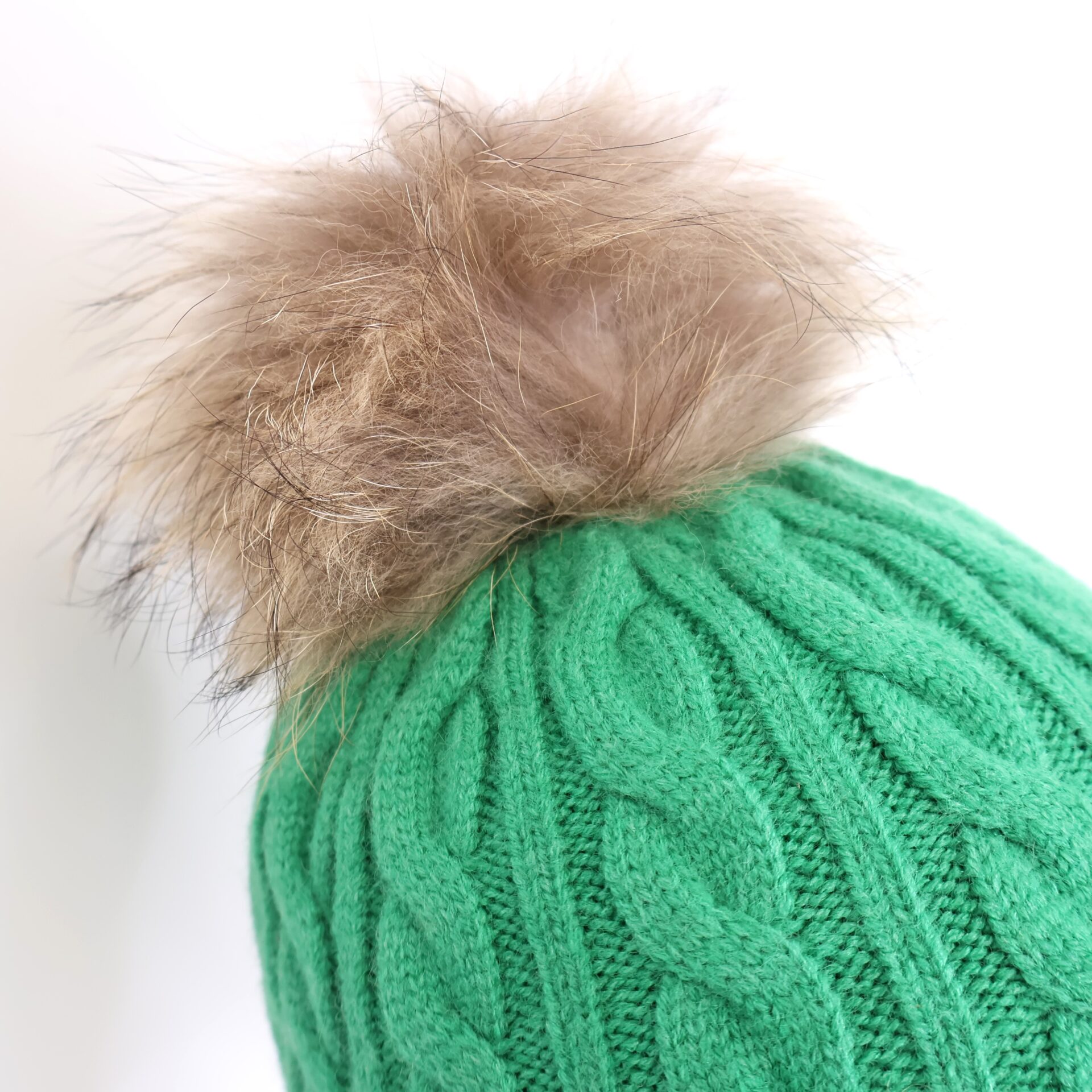 Gorro confeccionado en tejido de punto con líneas verticales y pequeñas listas de ochos trenzados decorativas. Pompón de pelo natural desmontable.