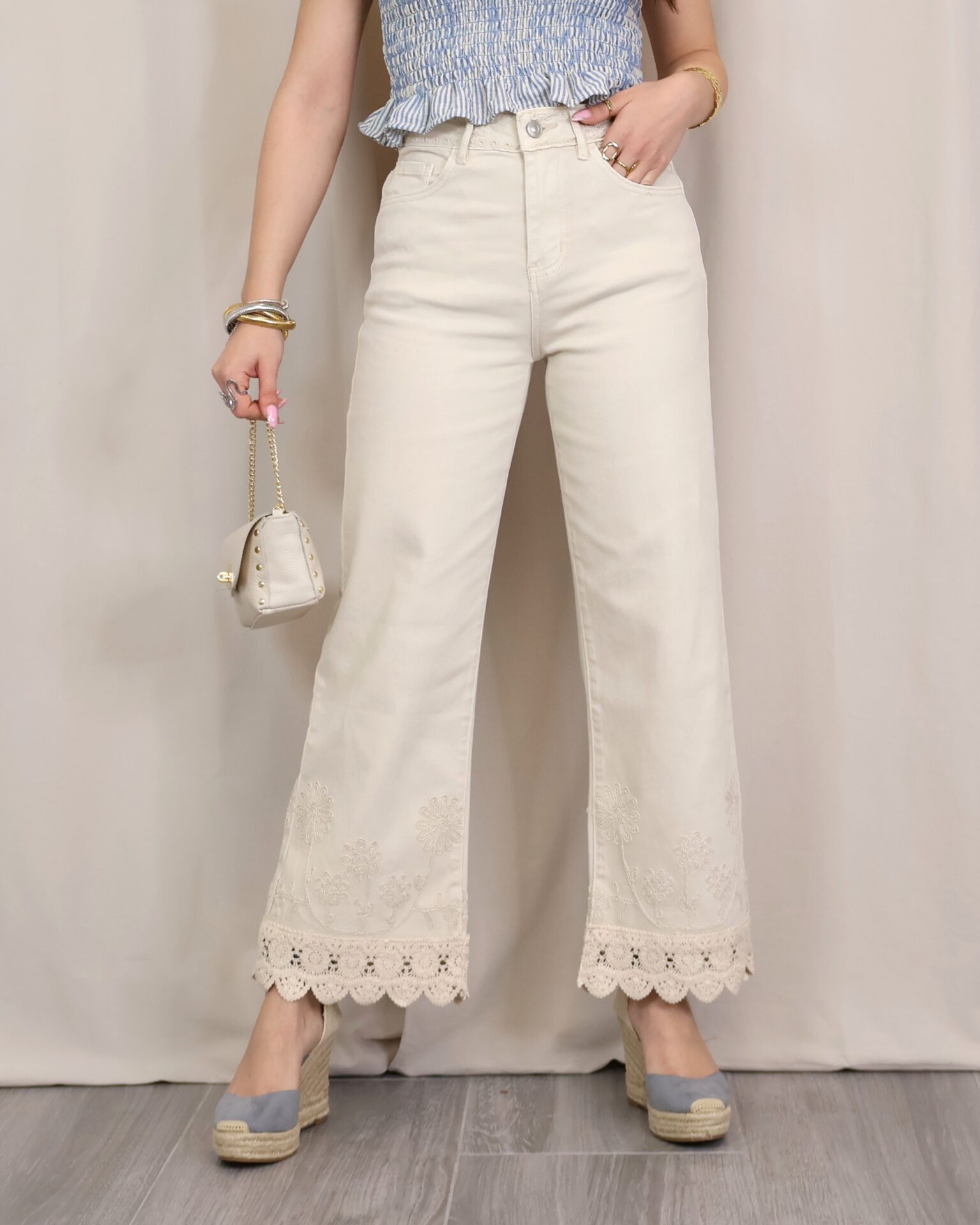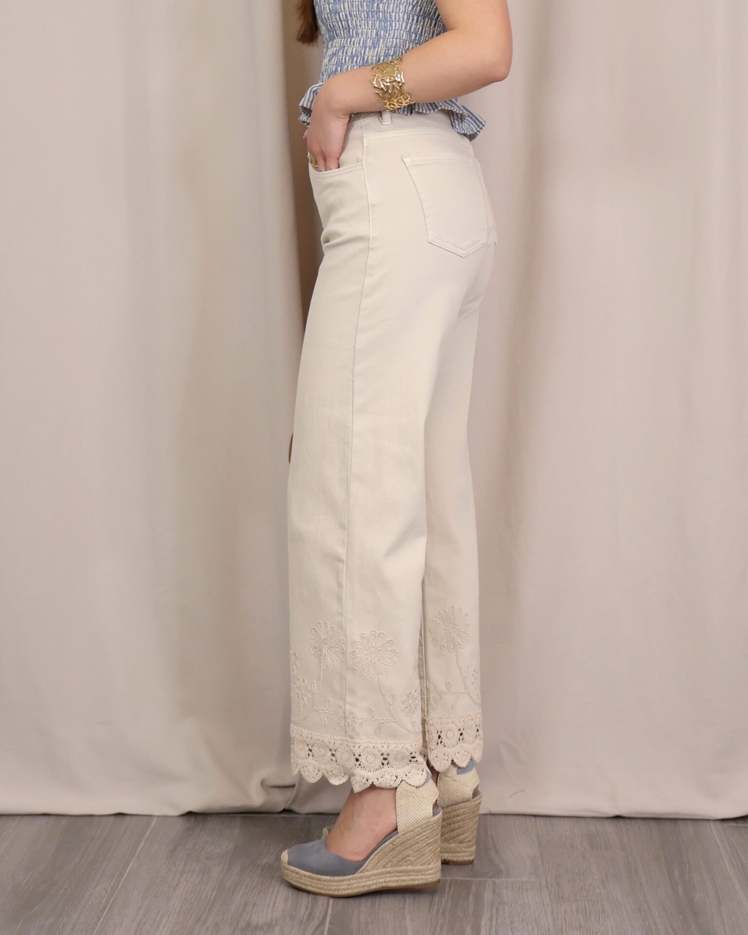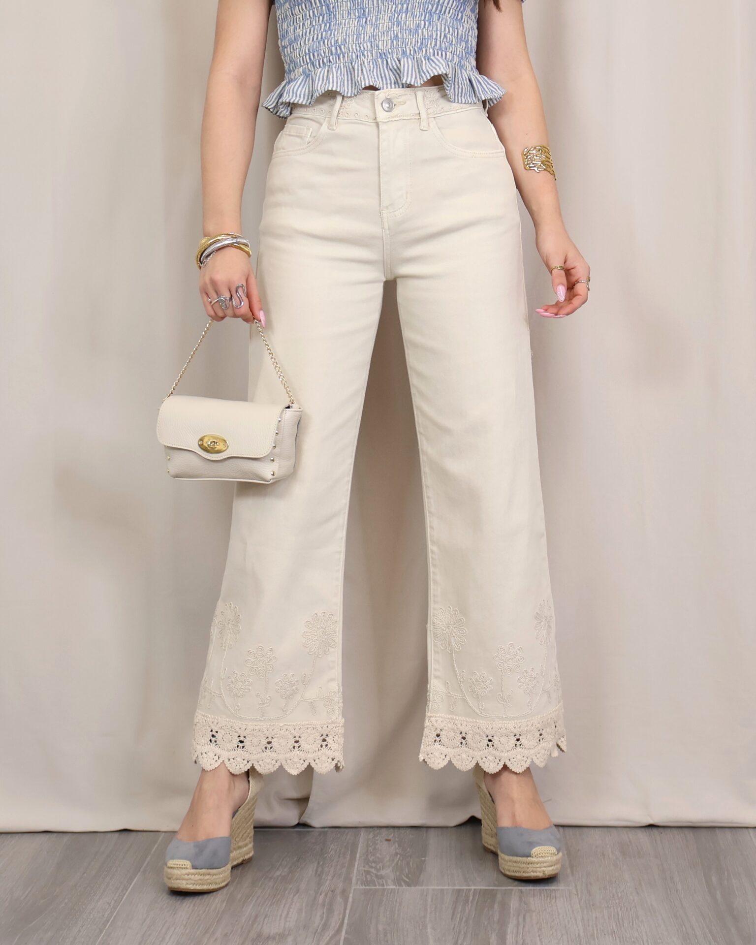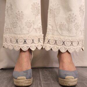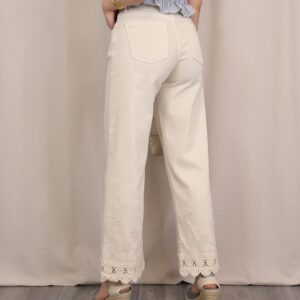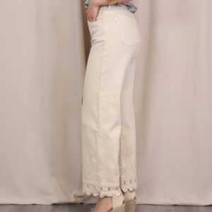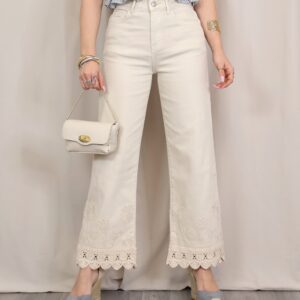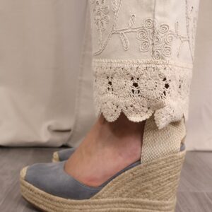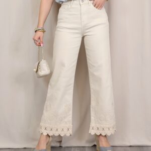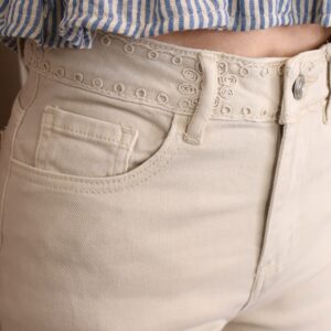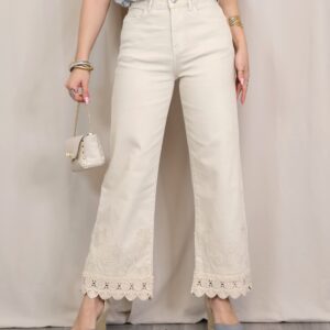 Pantalón de corte recto y tiro alto en color beige claro. Destaca por su bordado decorativo tanto en la zona de la cintura como en el bajo, donde se completa con un delicado acabado en puntilla que aporta un aire sofisticado y diferencial. Cuenta con cinco bolsillos, combinando funcionalidad y estilo.