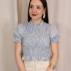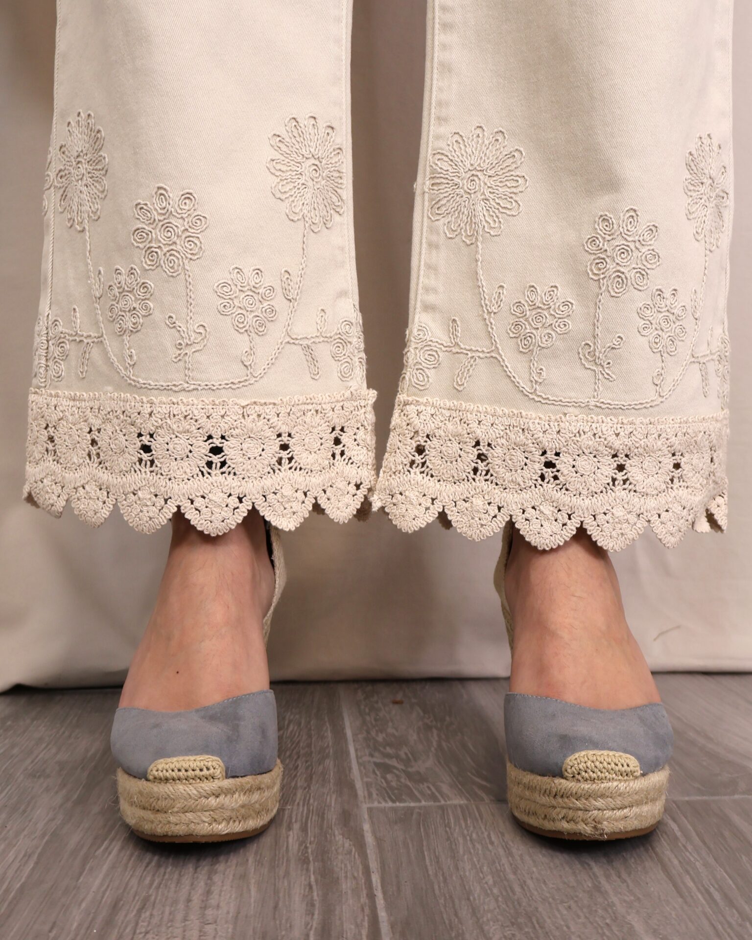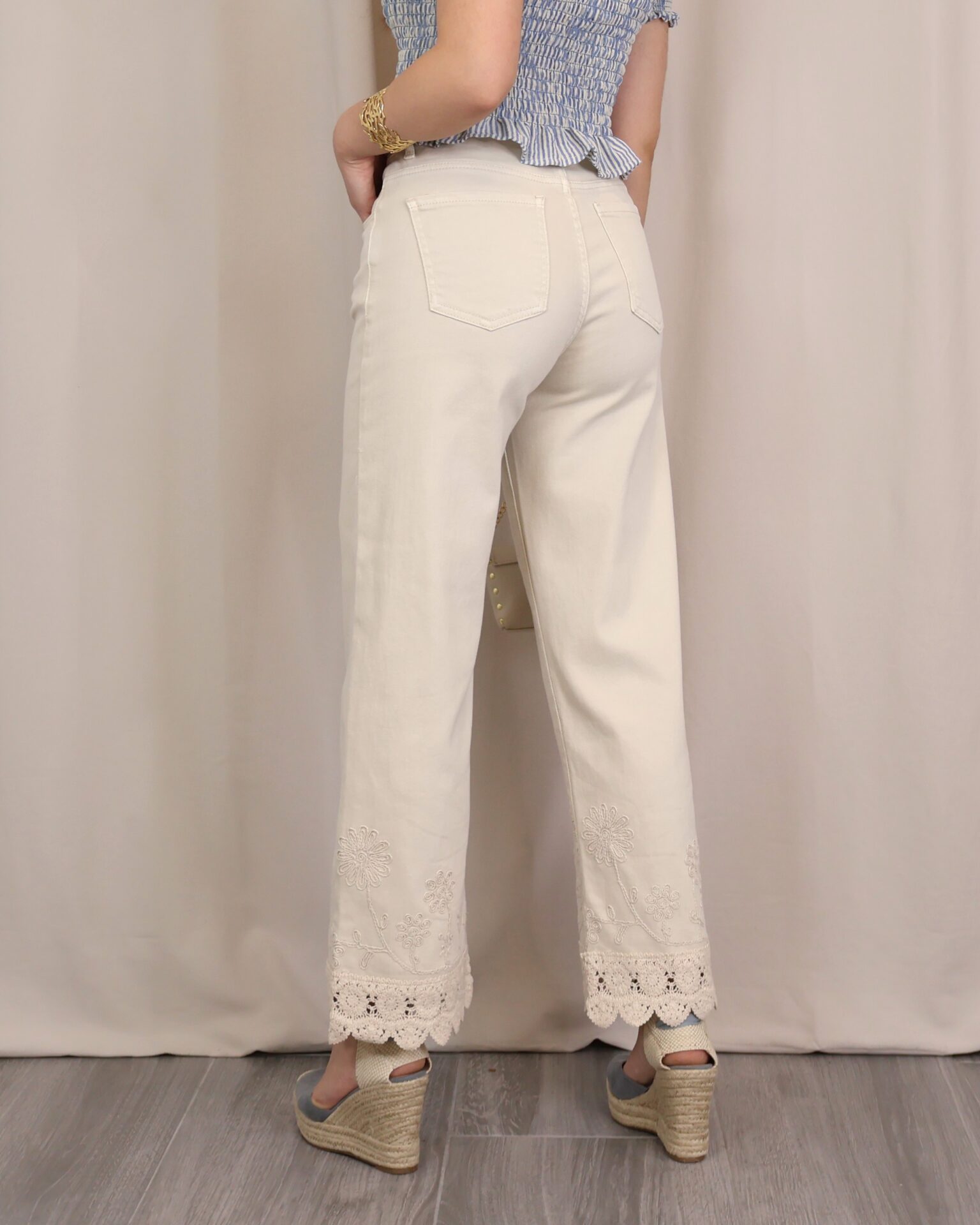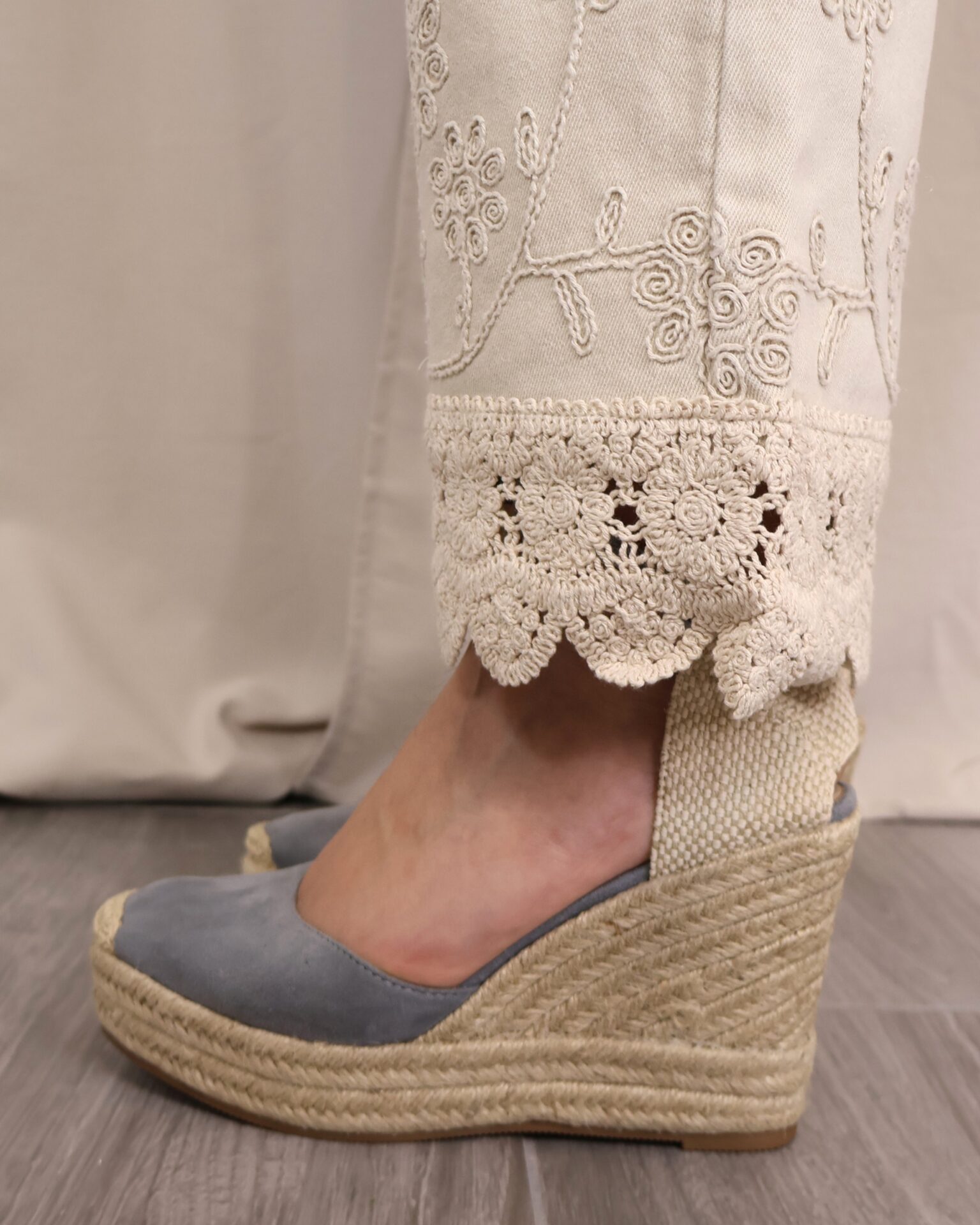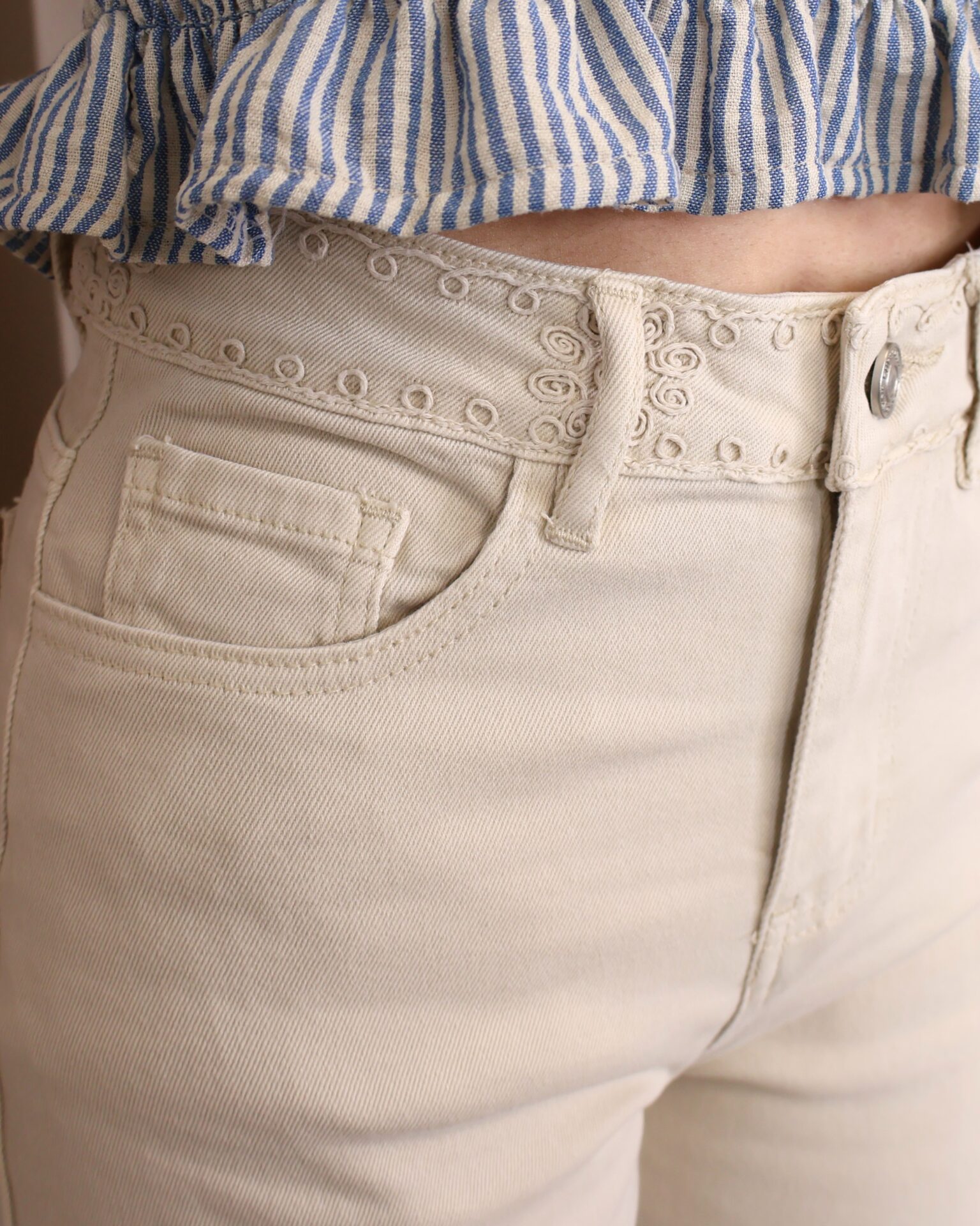 Pantalón de corte recto y tiro alto en color beige claro. Destaca por su bordado decorativo tanto en la zona de la cintura como en el bajo, donde se completa con un delicado acabado en puntilla que aporta un aire sofisticado y diferencial. Cuenta con cinco bolsillos, combinando funcionalidad y estilo.