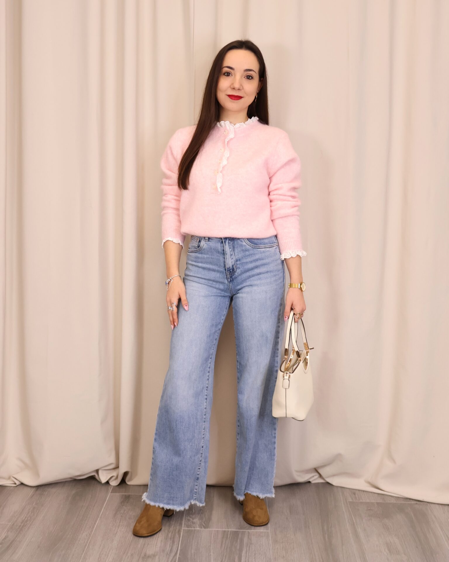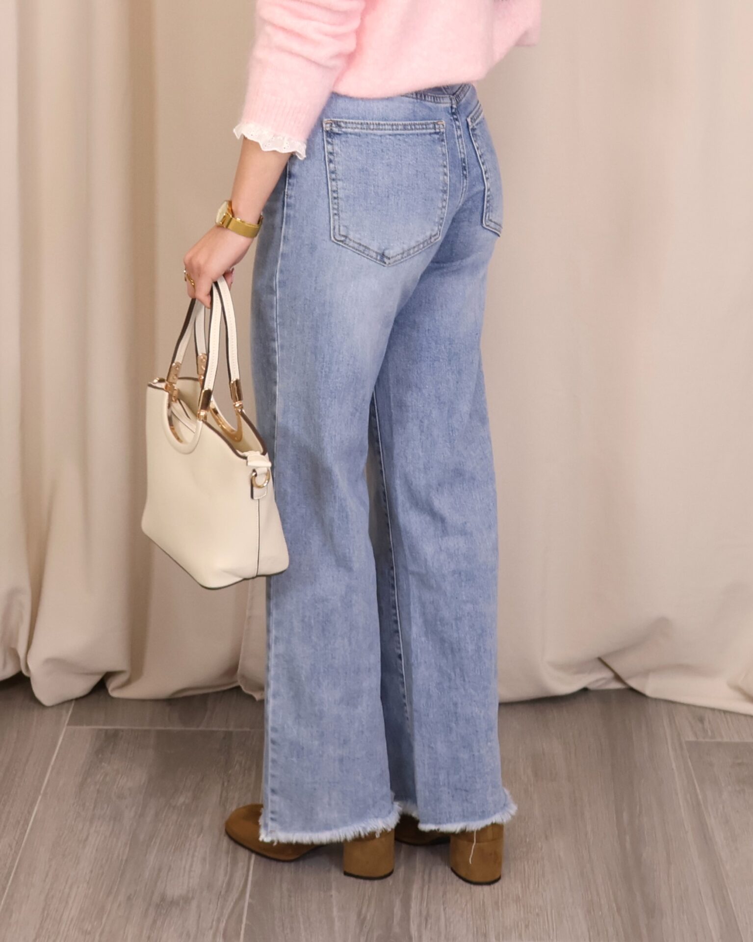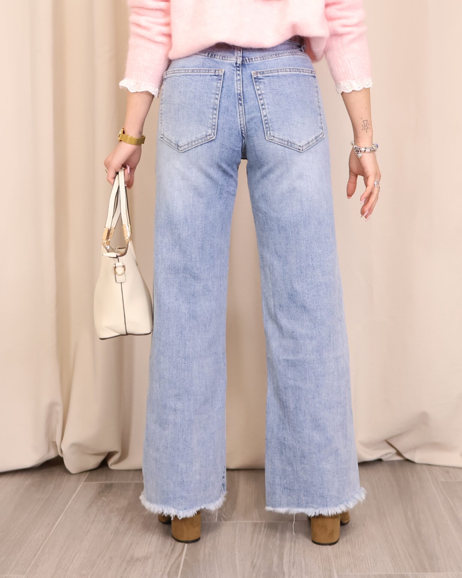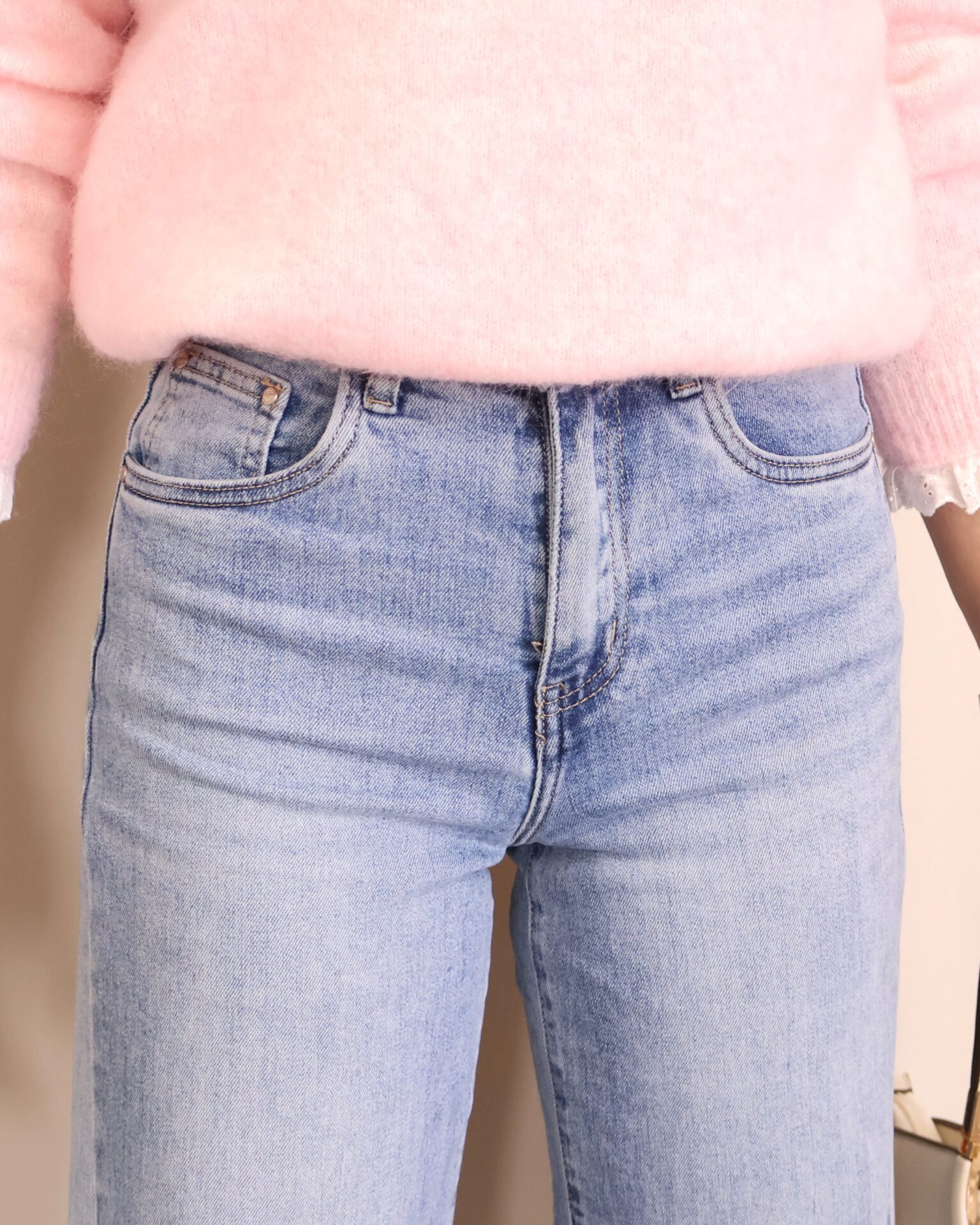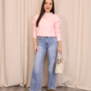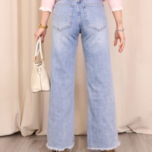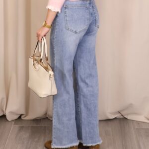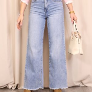 Pantalón vaquero de color denim claro, con corte ancho y cropped que aporta un estilo moderno y desenfadado. Confeccionado en tejido vaquero resistente y cómodo. Dispone de 5 bolsillos y cierre frontal mediante cremallera y botón para un ajuste clásico. El bajo desflecado añade un toque actual y casual, ideal para looks urbanos y de entretiempo.