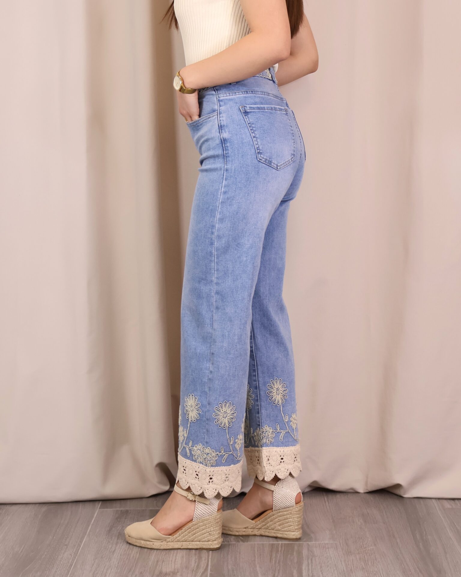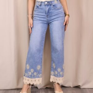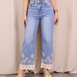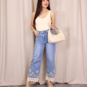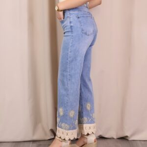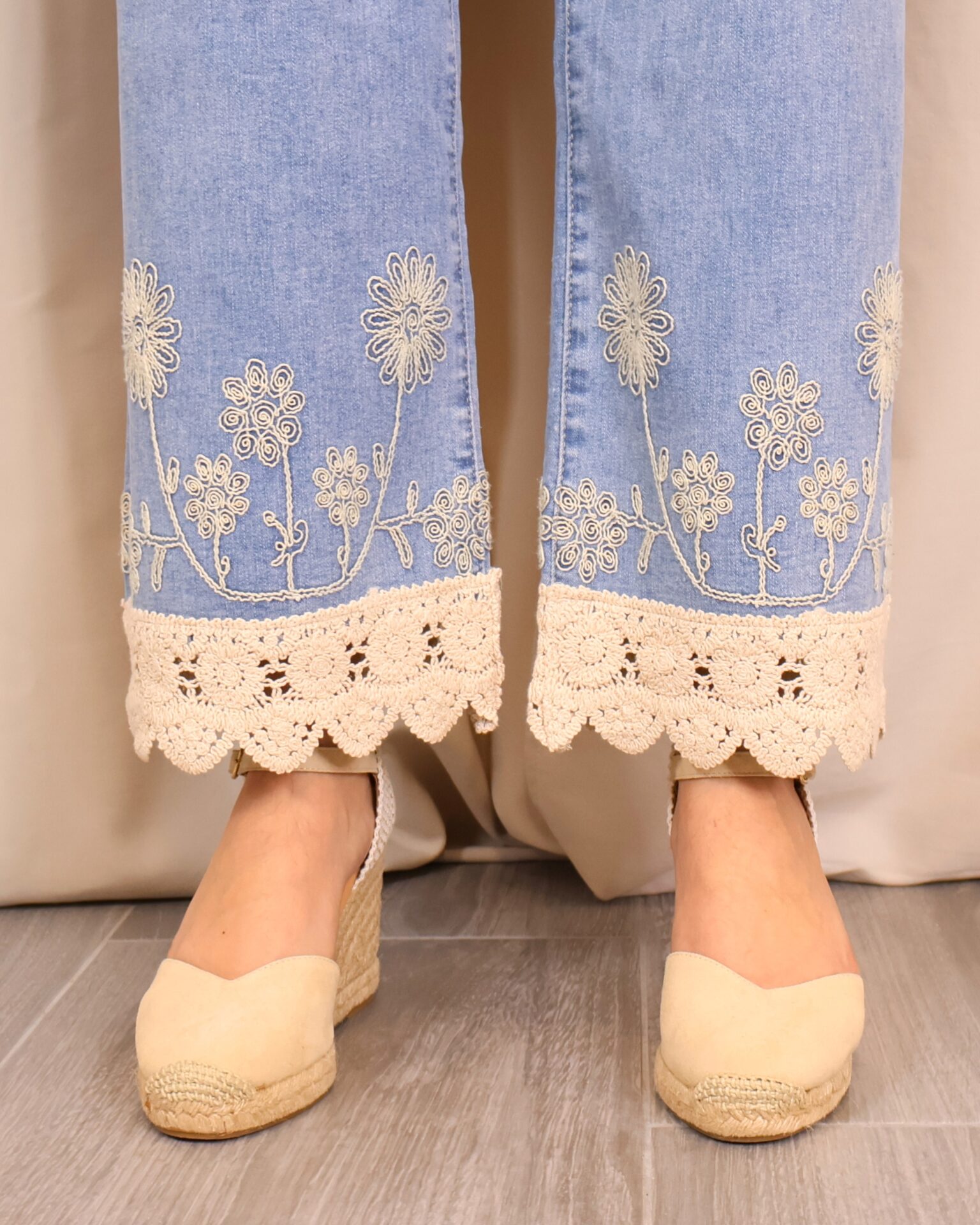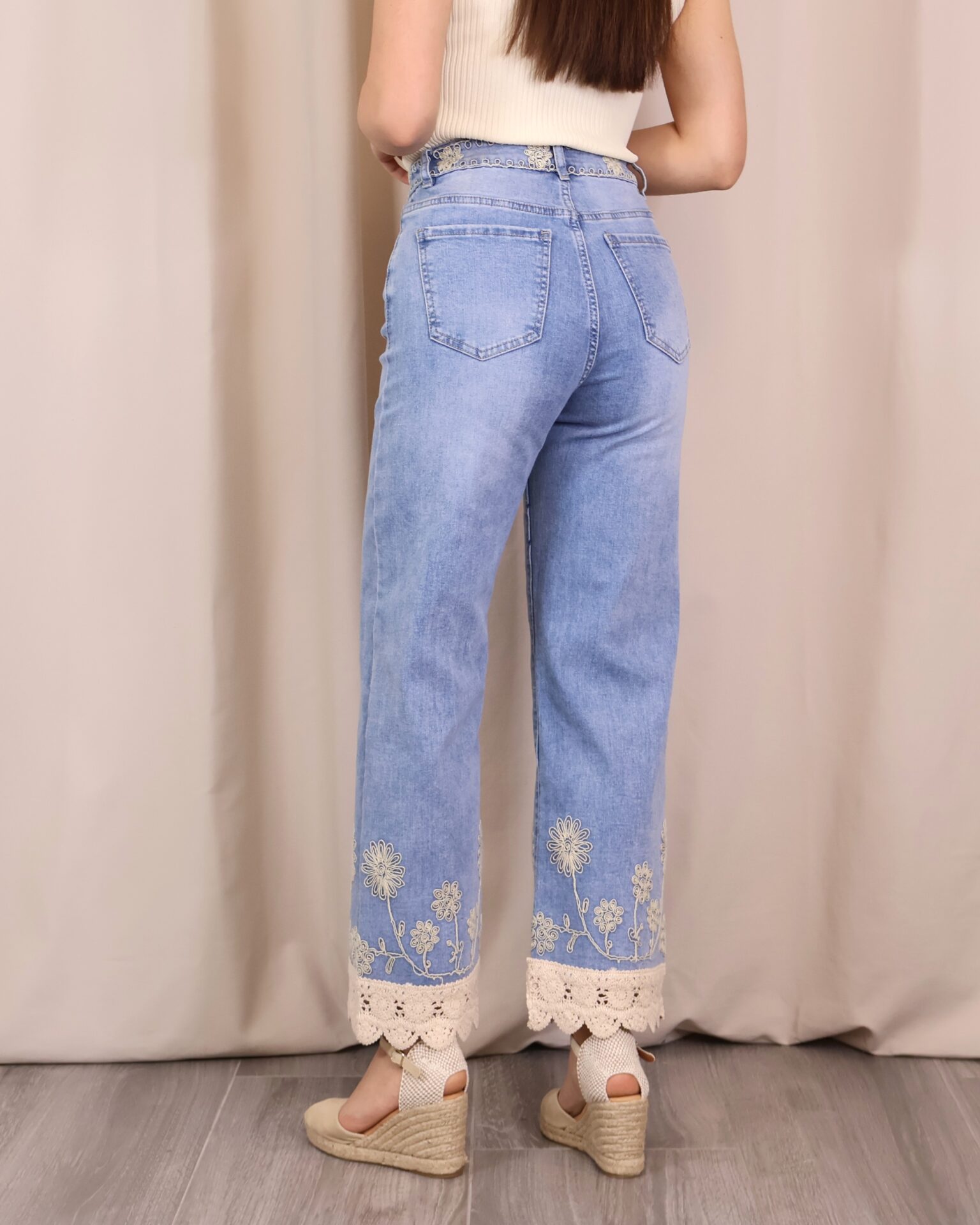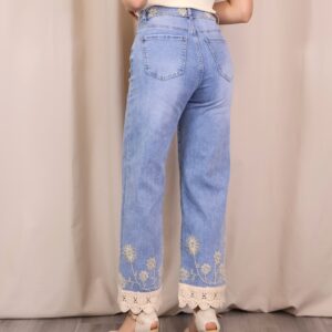 Pantalón de corte recto y tiro alto en color denim claro. Destaca por su bordado decorativo a contraste en beige tanto en la zona de la cintura como en el bajo, donde se completa con un delicado acabado en puntilla que aporta un aire sofisticado y diferencial. Cuenta con cinco bolsillos, combinando funcionalidad y estilo.