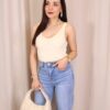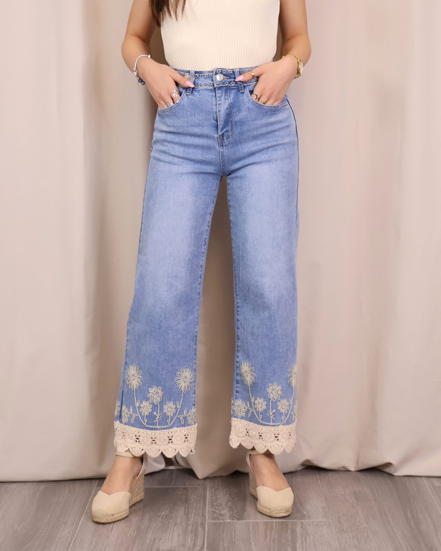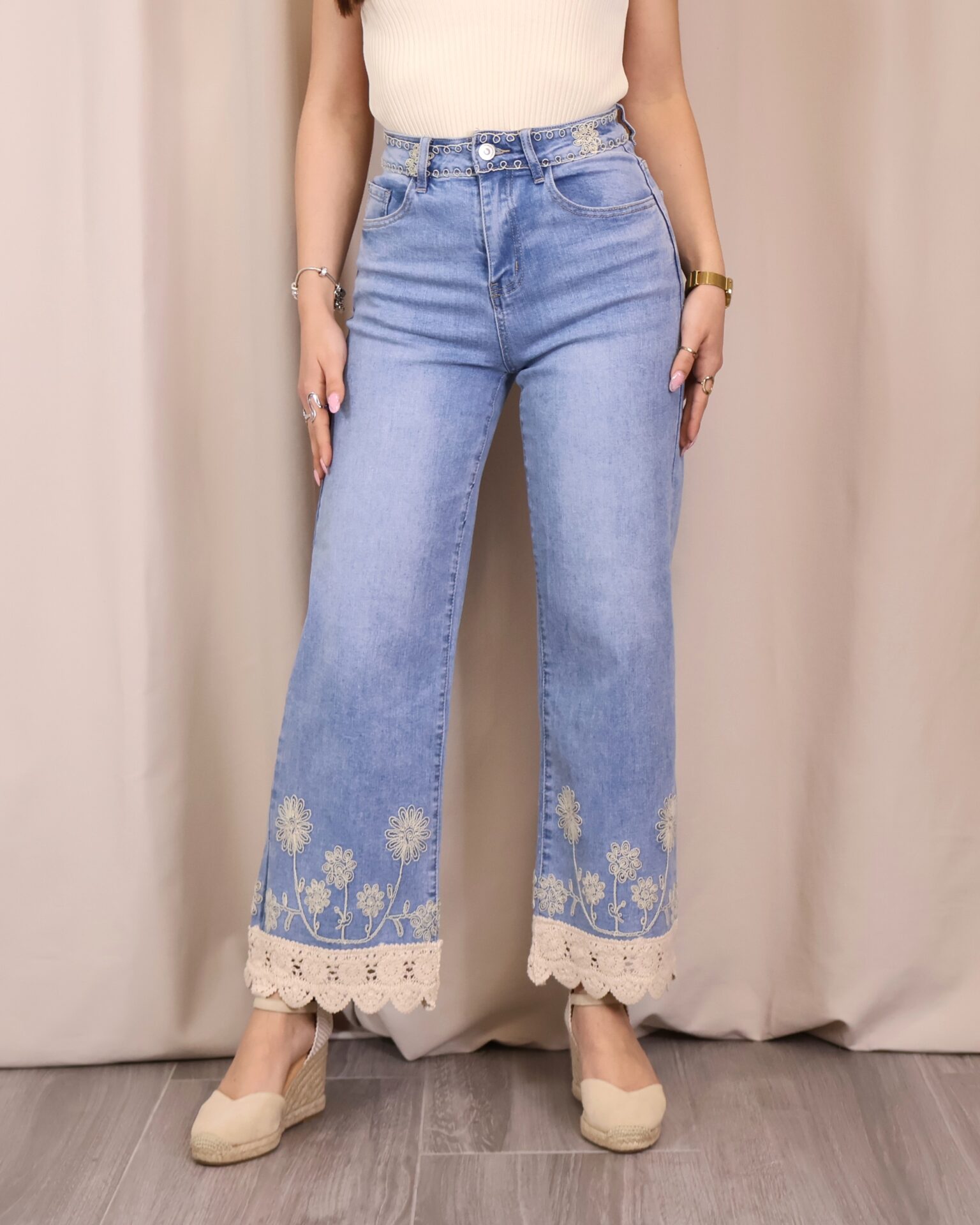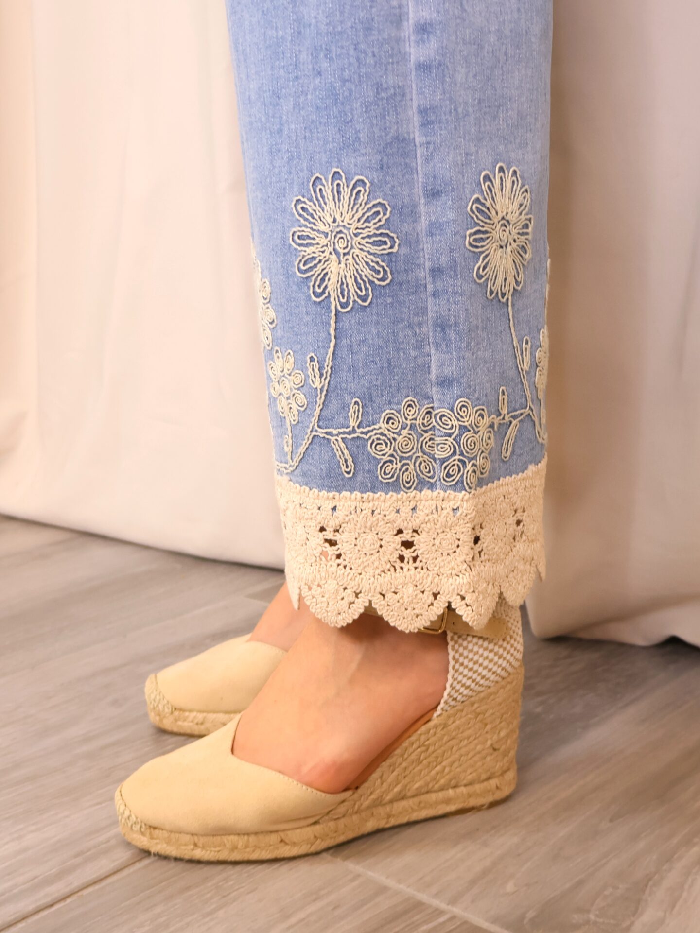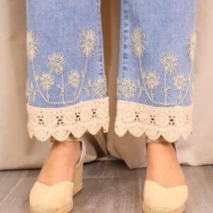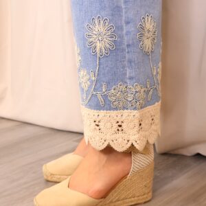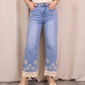 Pantalón de corte recto y tiro alto en color denim claro. Destaca por su bordado decorativo a contraste en beige tanto en la zona de la cintura como en el bajo, donde se completa con un delicado acabado en puntilla que aporta un aire sofisticado y diferencial. Cuenta con cinco bolsillos, combinando funcionalidad y estilo.