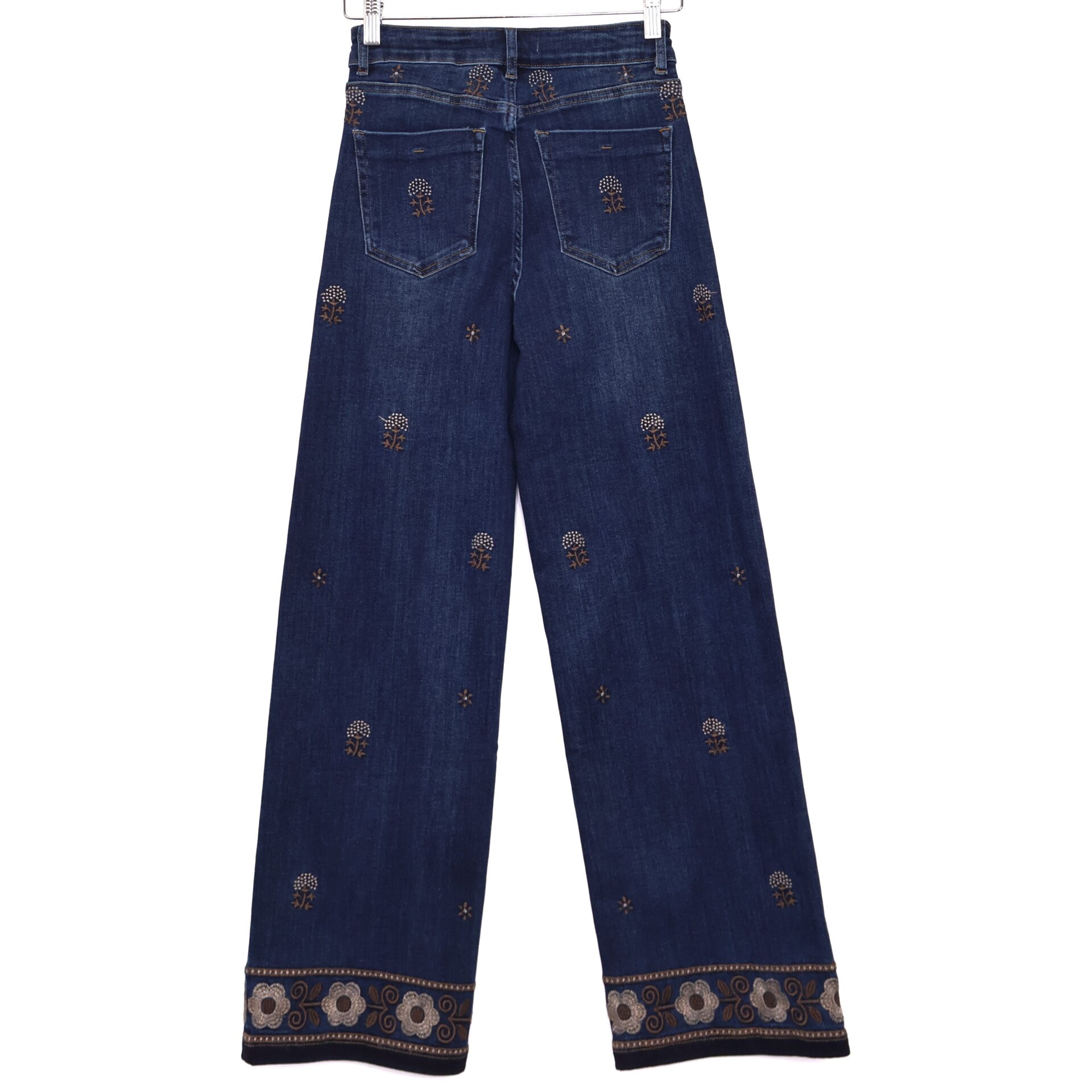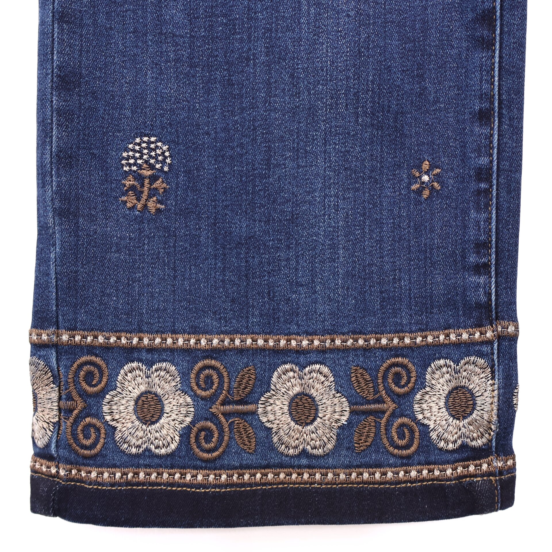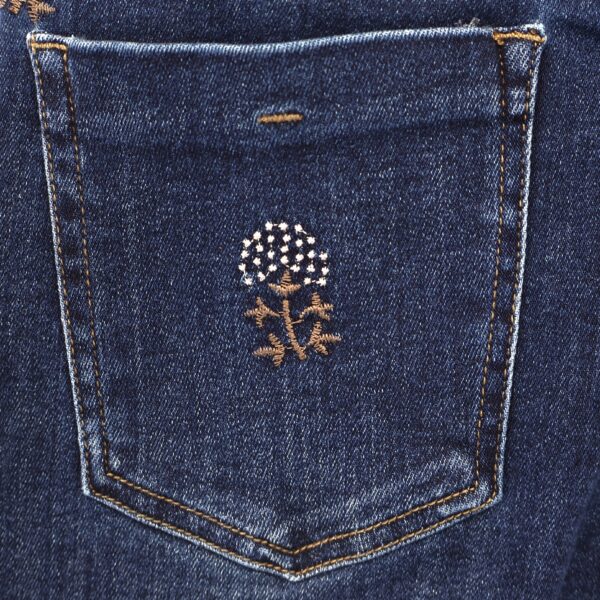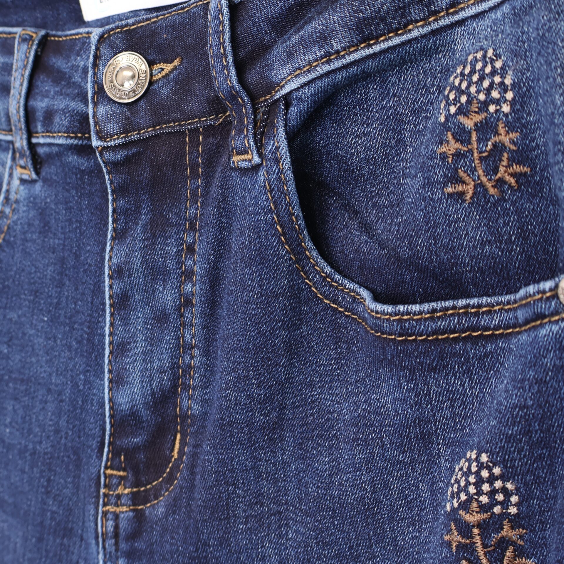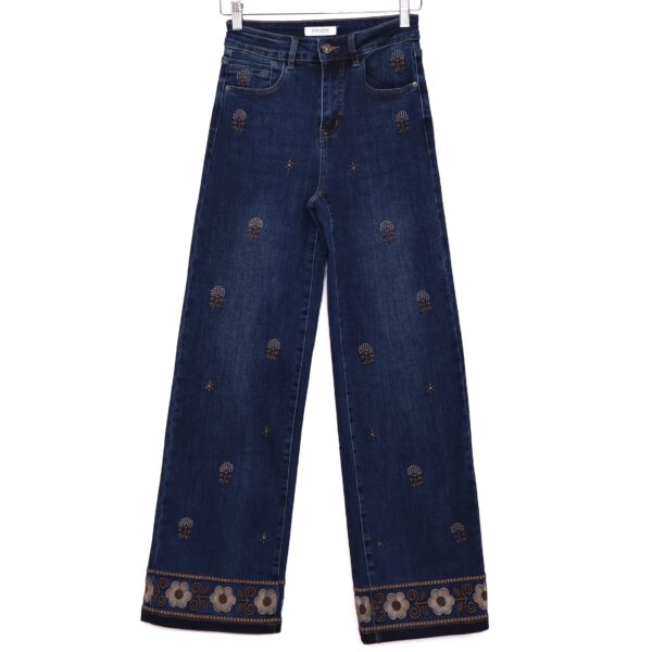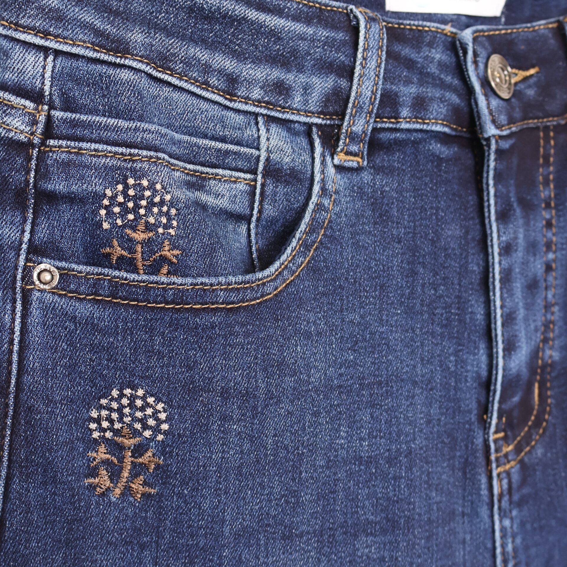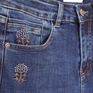 Jeans denim con bordado de flores a contraste en camel. Corte cropped y tiro alto. 5 Bolsillos. Cierre frontal con cremallera y botón. Detalle de bajo bordado.