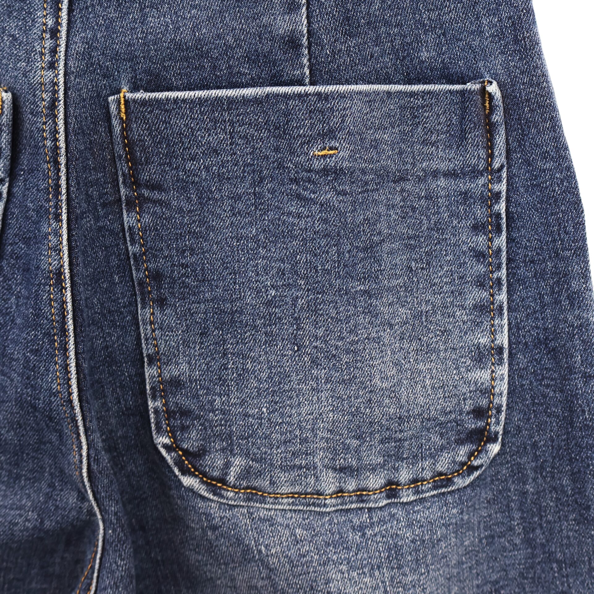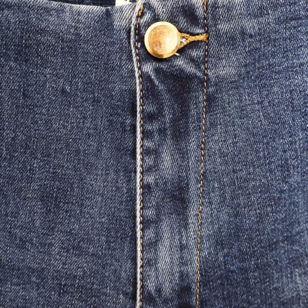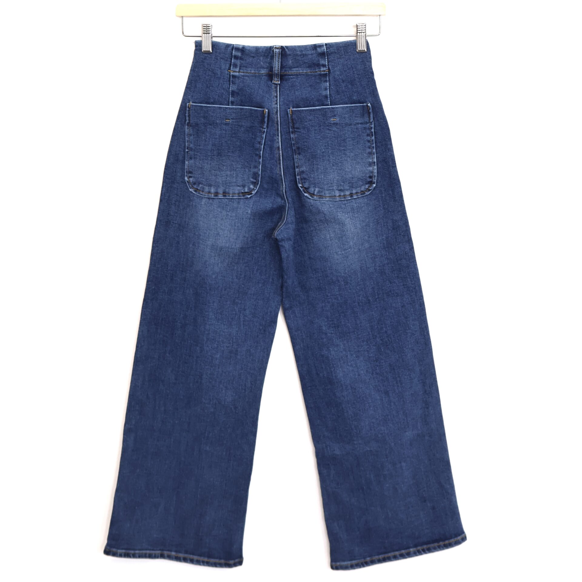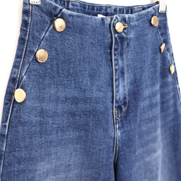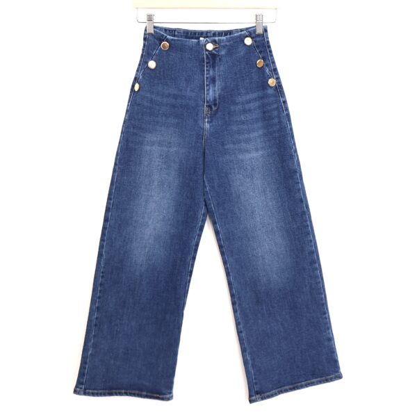 Jeans cropped de tiro alto color denim. Detalle botones dorados. 2 Bolsillos traseros. Cierre frontal con cremallera y botón metálico.