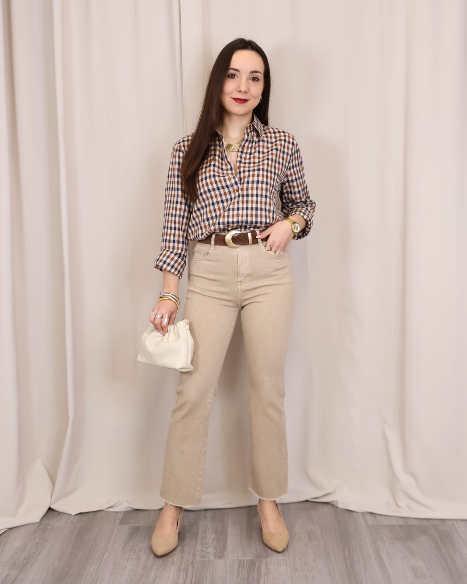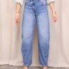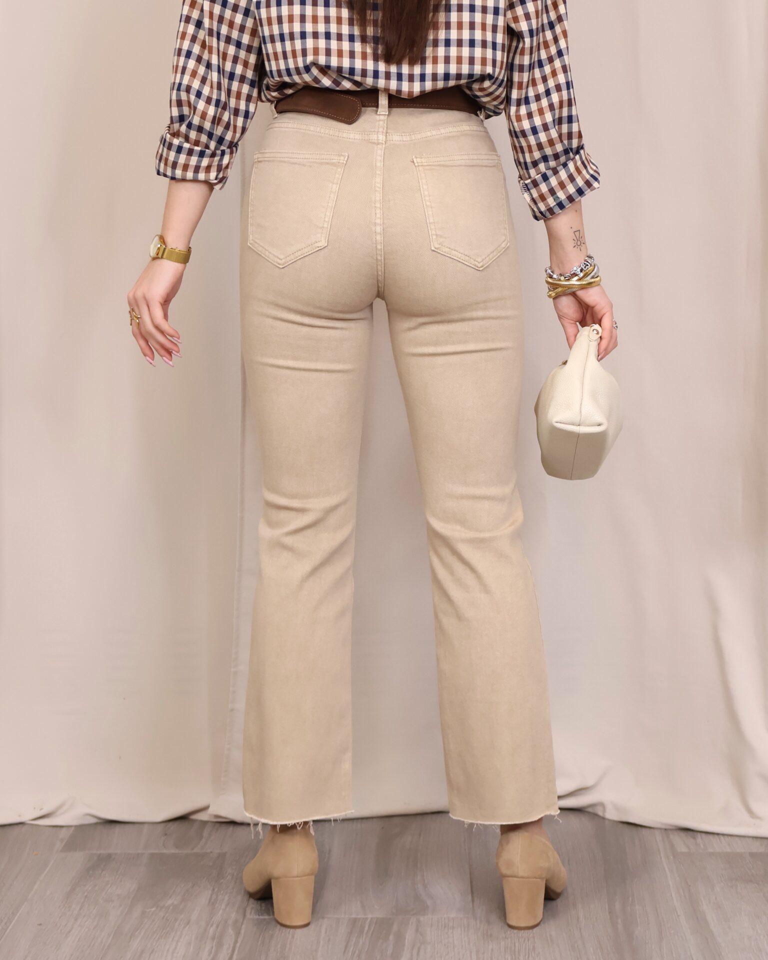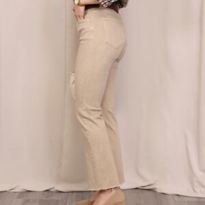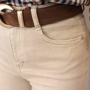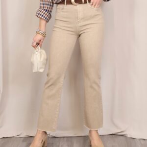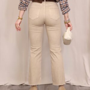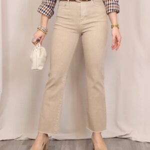 Jeans camel de tiro medio – alto con corte flared que estiliza la silueta y aporta un aire retro muy actual. Confeccionado en tejido cómodo y resistente, cuenta con cinco bolsillos funcionales y un bajo desflecado que le da ese toque desenfadado y moderno que marca la diferencia.
