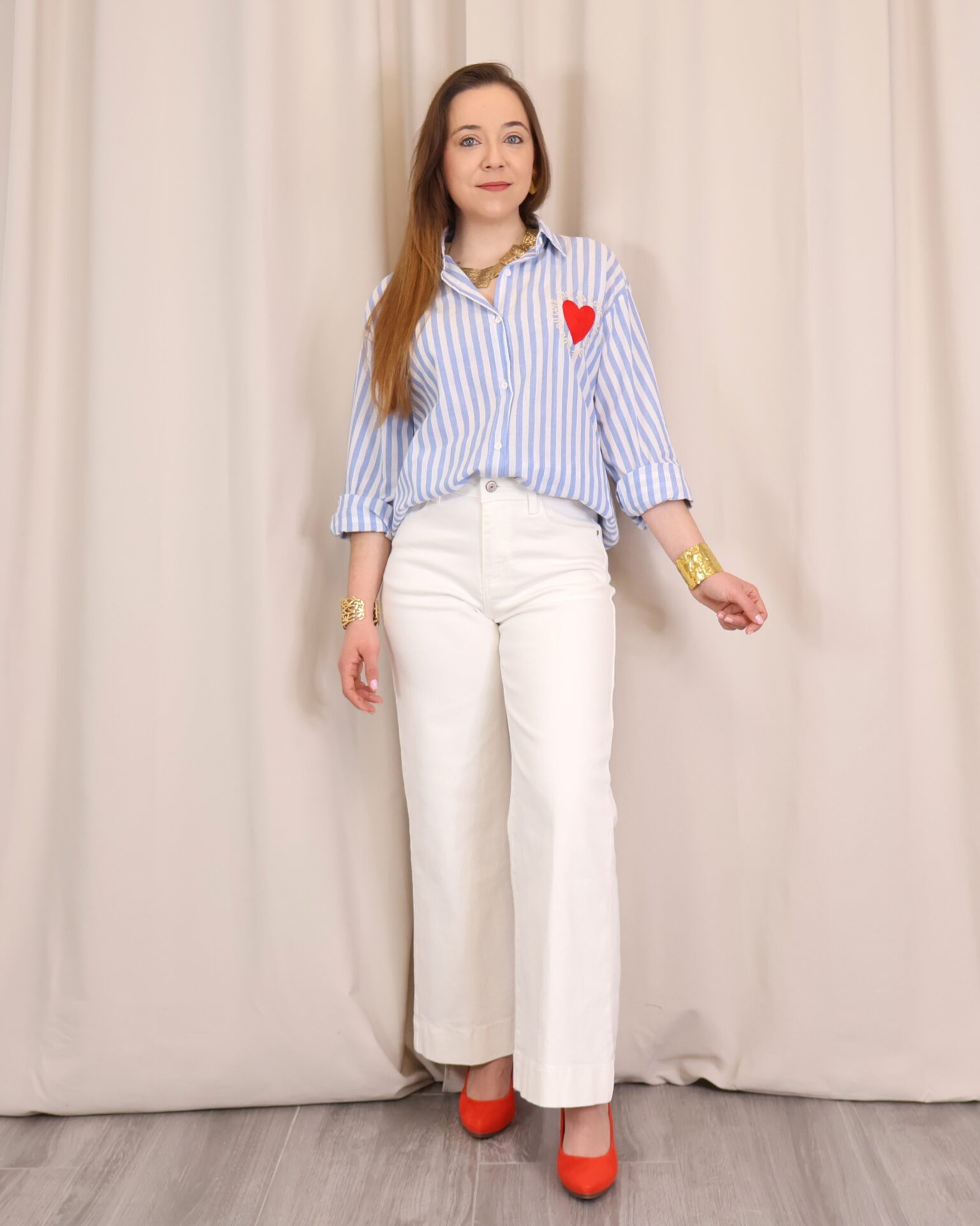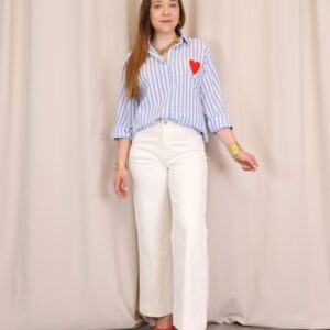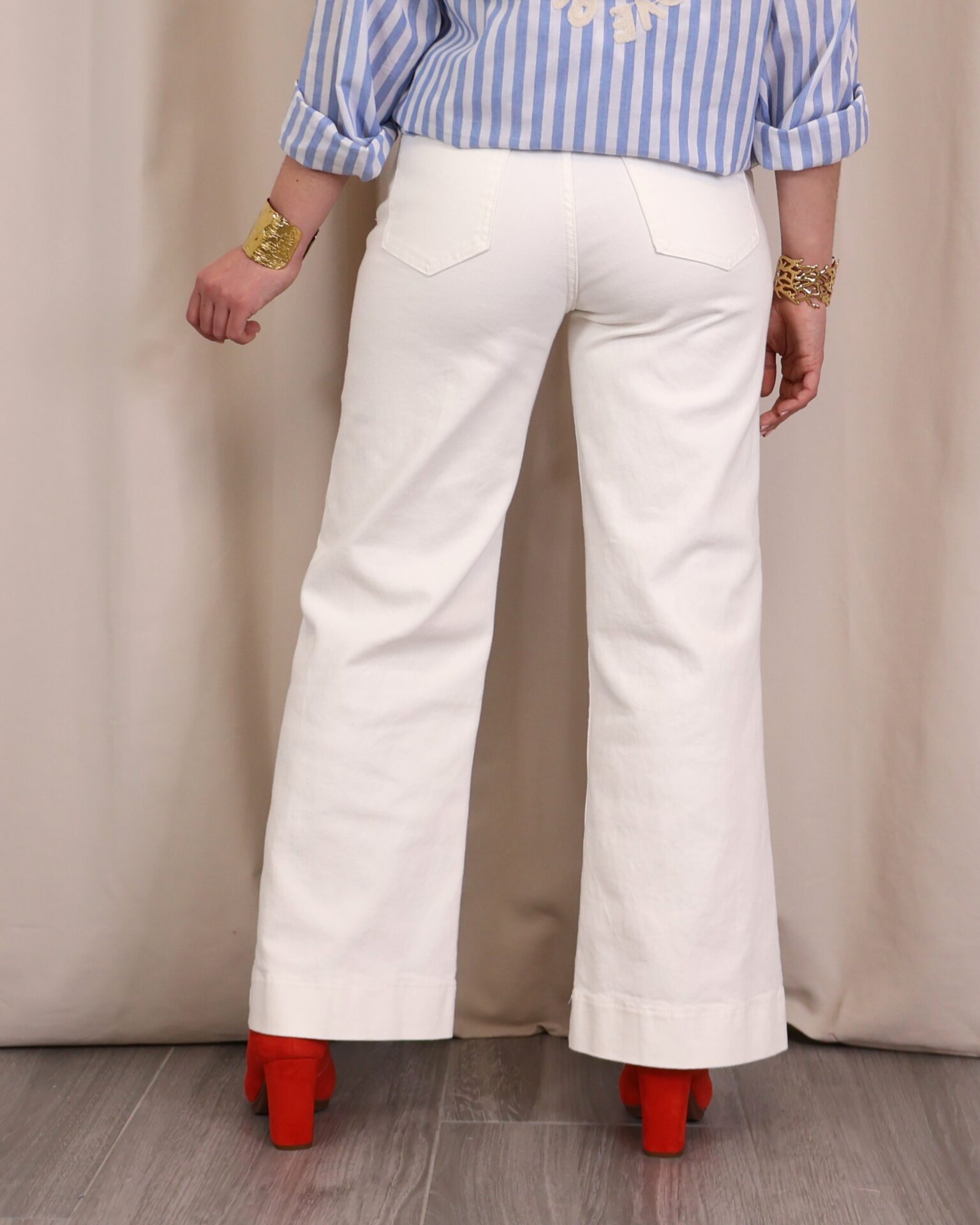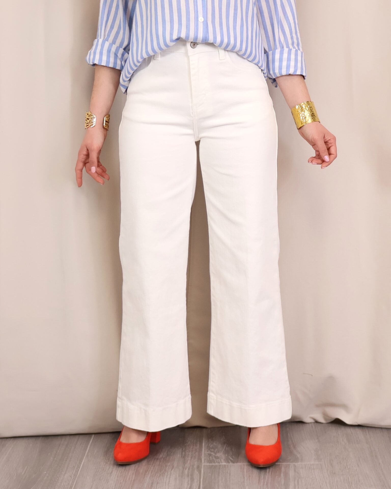 Jeans de corte recto y cropped en color blanco, perfectos para un estilo actual y versátil. Su diseño de tiro alto realza la silueta y aporta comodidad durante todo el día.