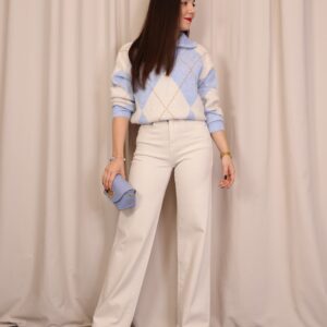 Jeans en color beige con corte ancho estilo wide leg y tiro alto, diseñados para estilizar la silueta y aportar comodidad. Cuenta con cinco bolsillos y cierre frontal con cremallera y botón, ofreciendo un diseño clásico y funcional.