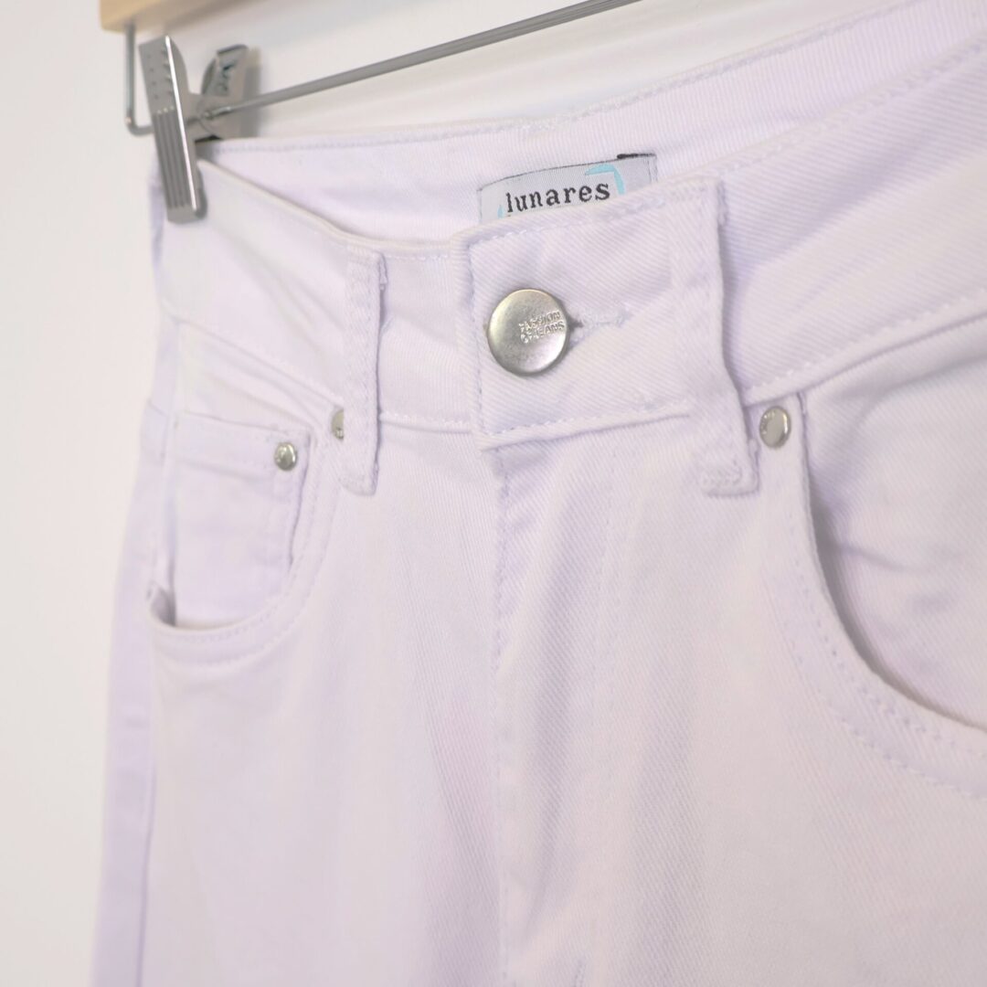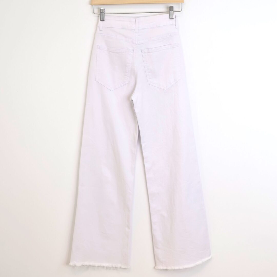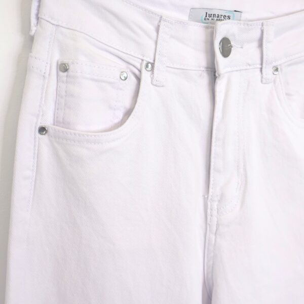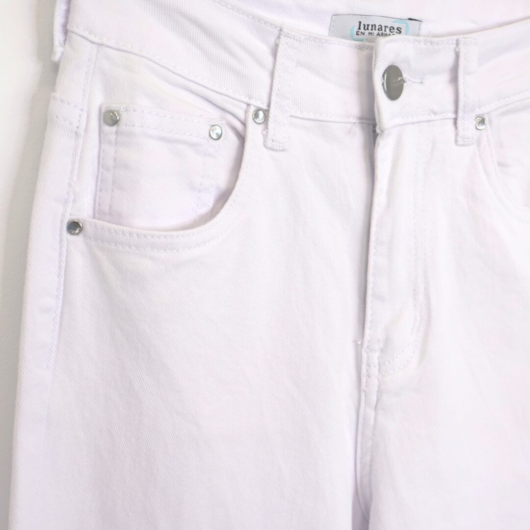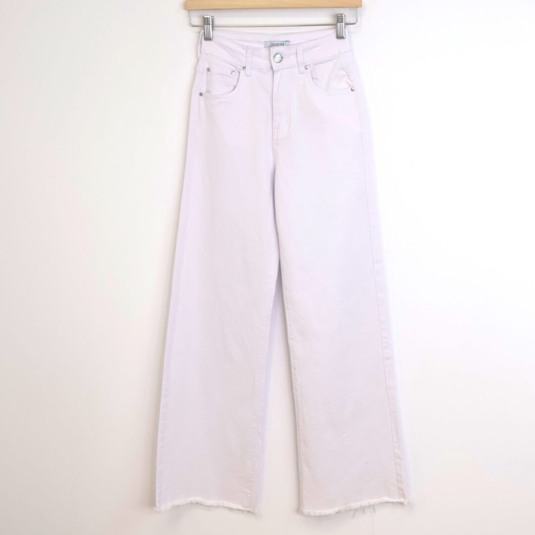 Jeans blancos con corte ancho (wide leg) y tiro alto. 5 Bolsillos. Cierre frontal con cremallera y botón. Detalle de bajo y desflecado.