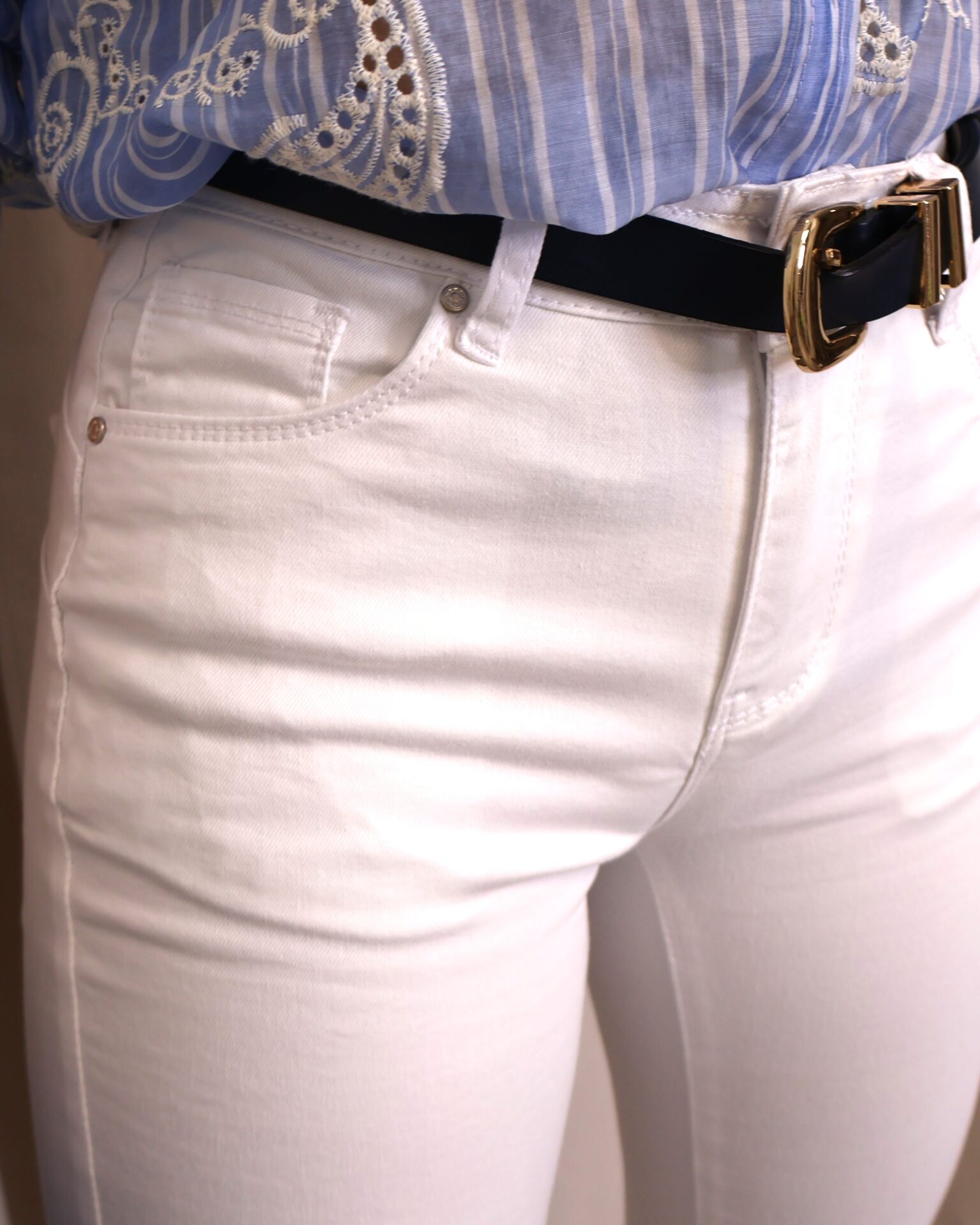 Jeans blancos de tiro alto y corte acampanado tipo bootcut, diseñados para realzar la figura y alargar visualmente la silueta. Su efecto push up ayuda a moldear y definir, creando un ajuste favorecedor y cómodo. Incorpora el clásico diseño de cinco bolsillos y cierre frontal con cremallera y botón, combinando funcionalidad con un estilo atemporal.