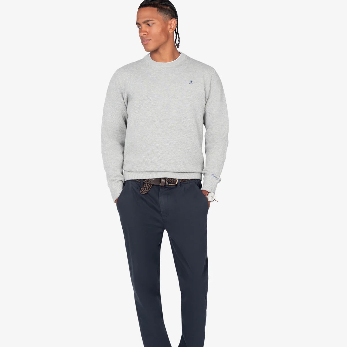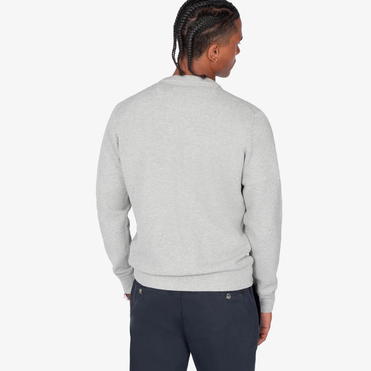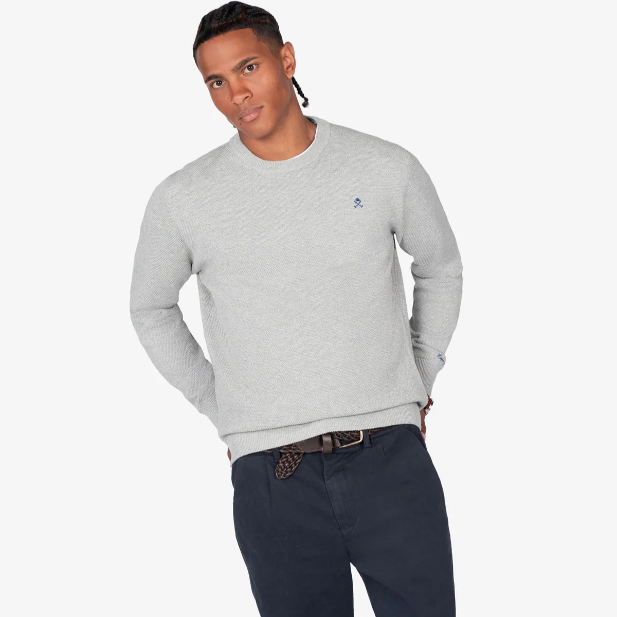 Jersey de cuello redondo confeccionado en 100% algodón con textura piqué, aportando un toque sofisticado. Cuenta con terminaciones acanaladas en cuello, puños y bajo, y el logo bordado en el pecho como detalle icónico.