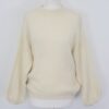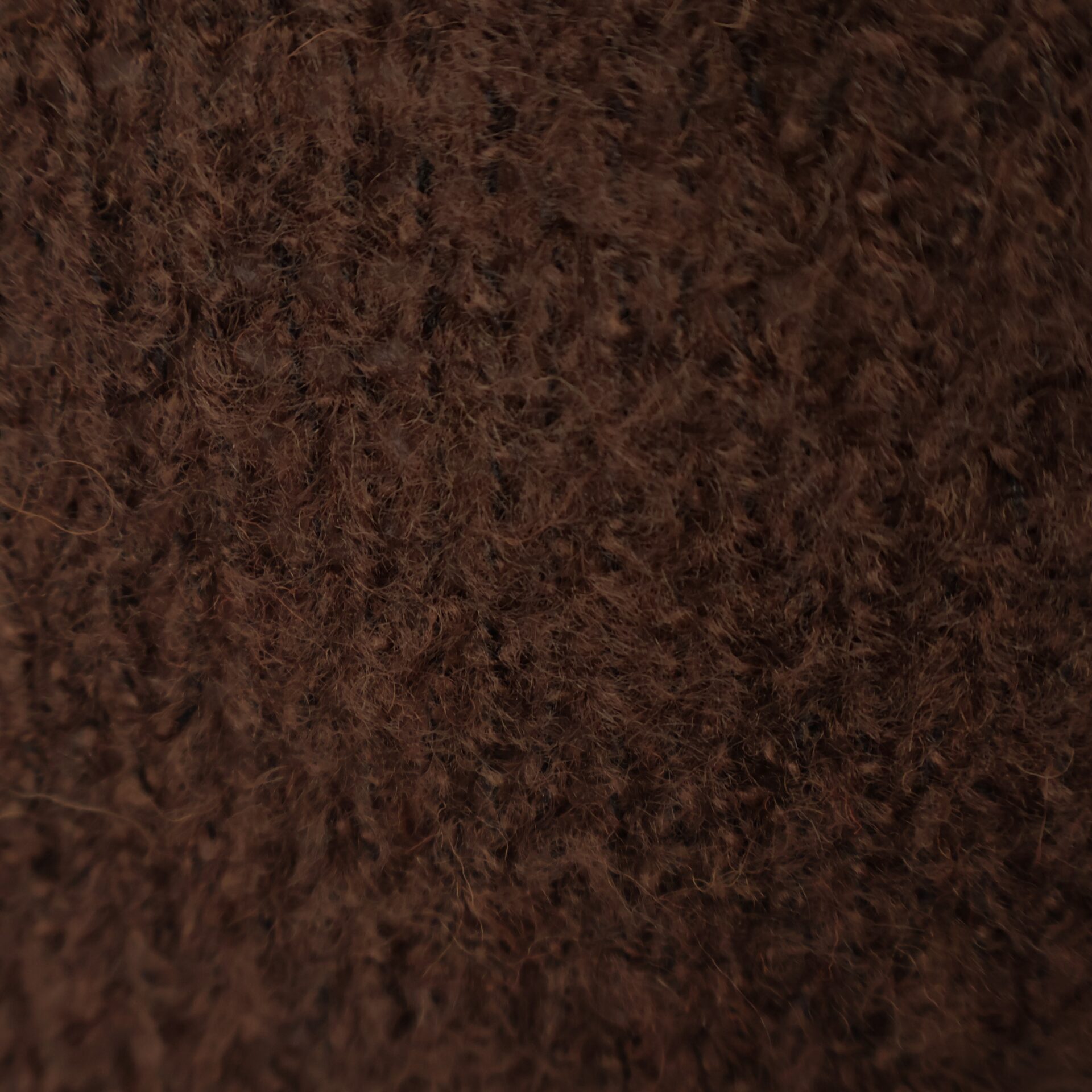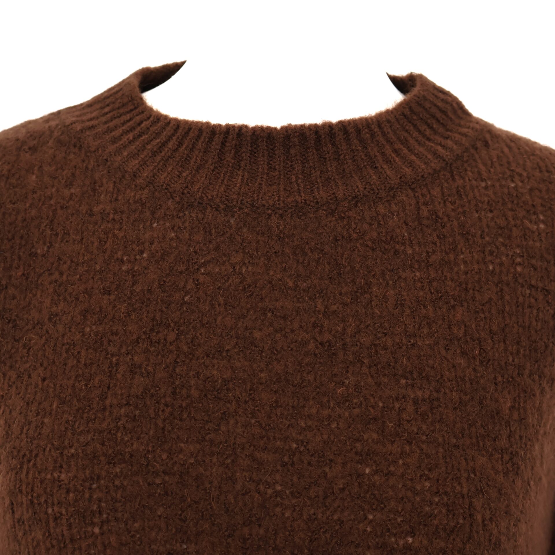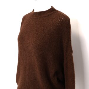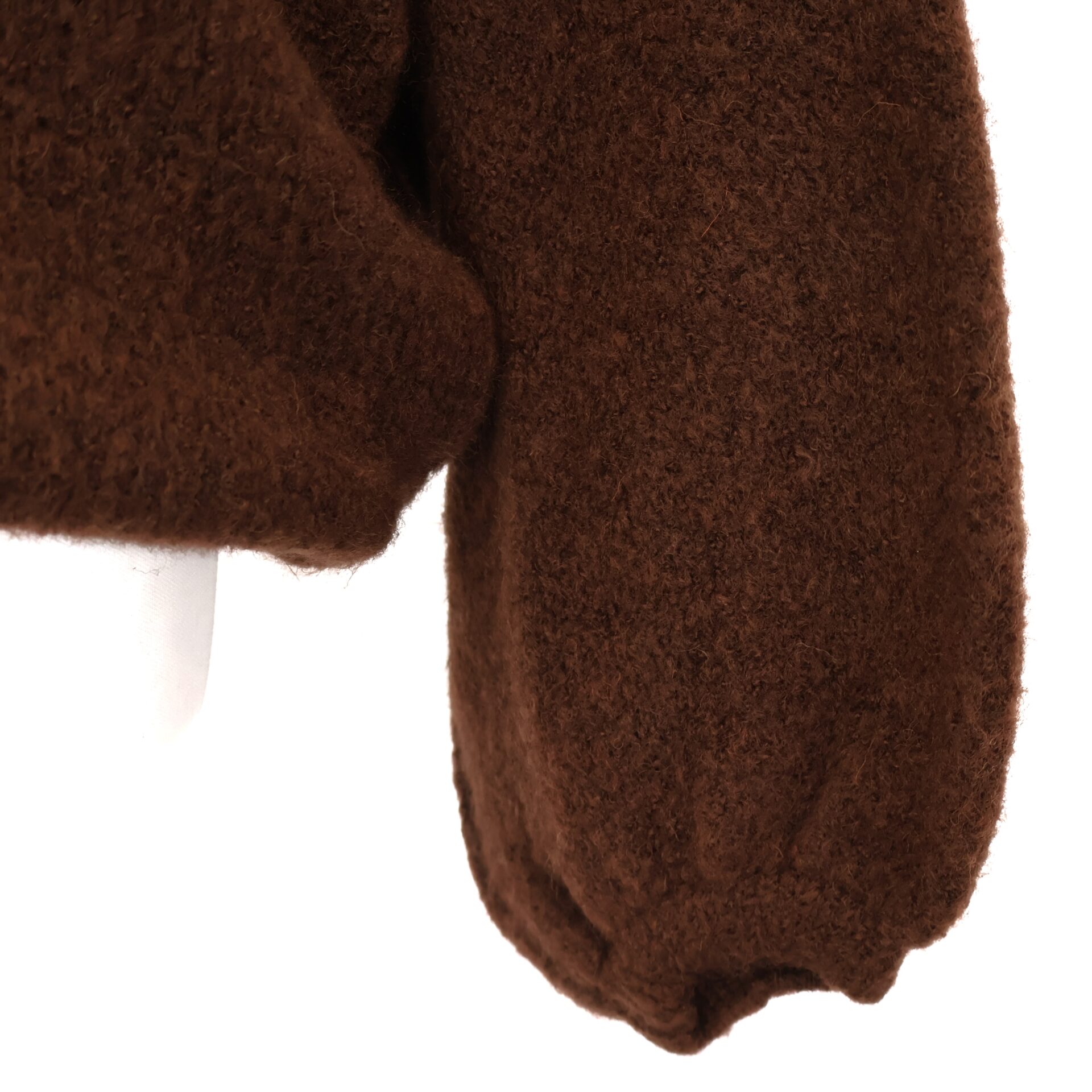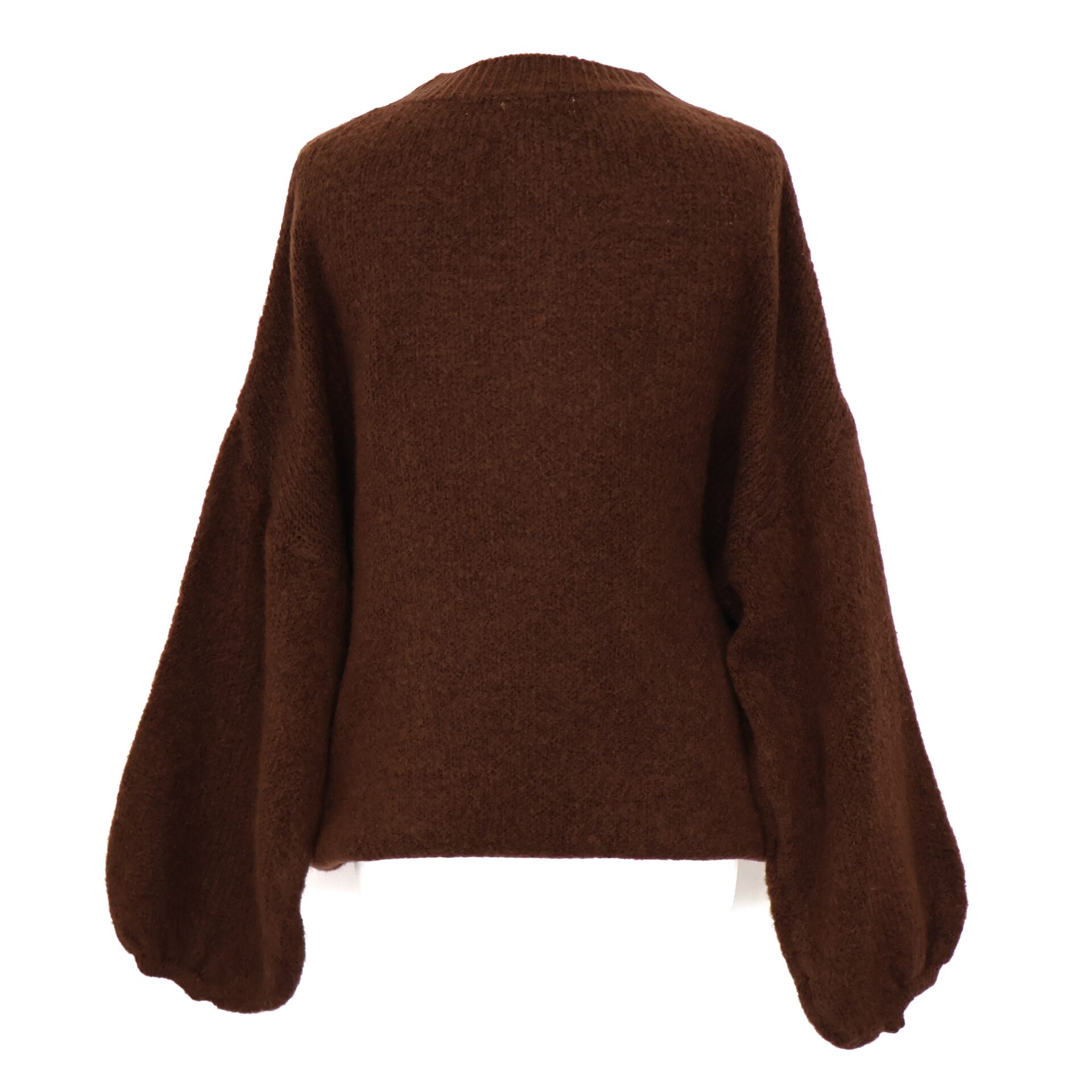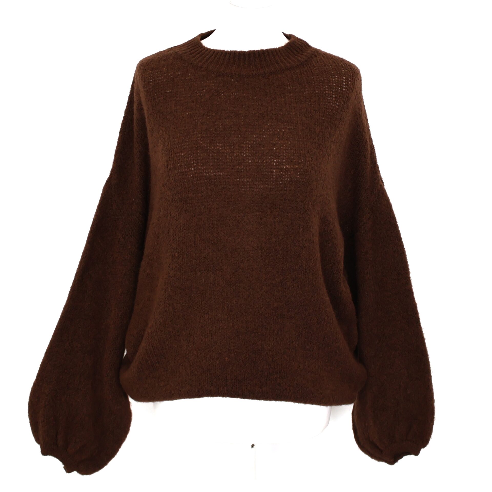 Jersey de cuello redondo confeccionado en tejido punto elástico en color marrón chocolate. Corte oversize con manga caída y abullonada con goma en los puños.