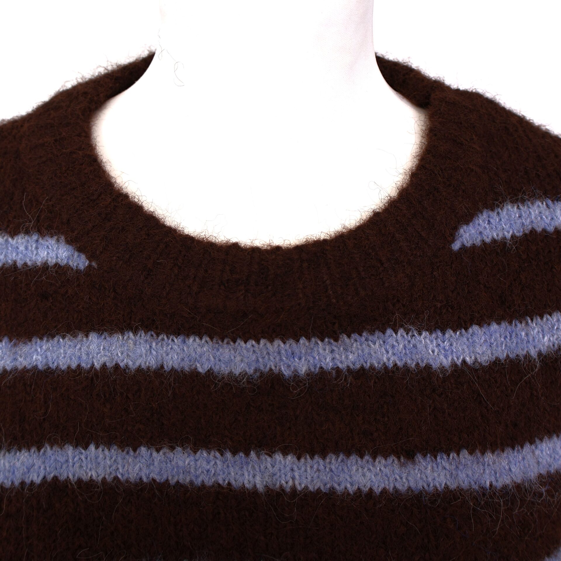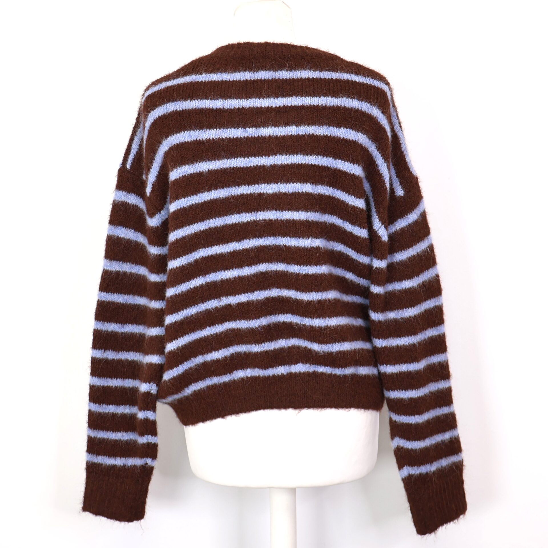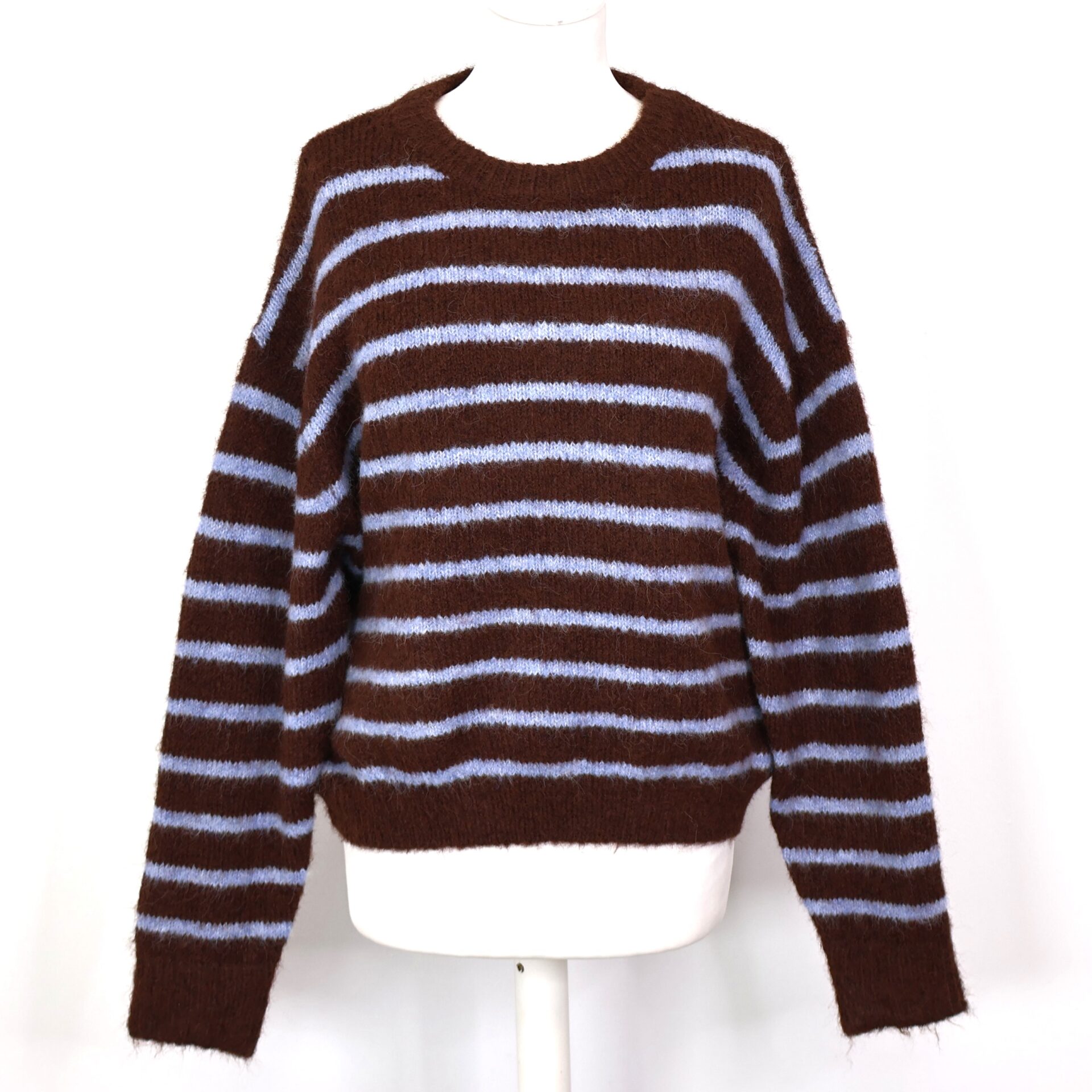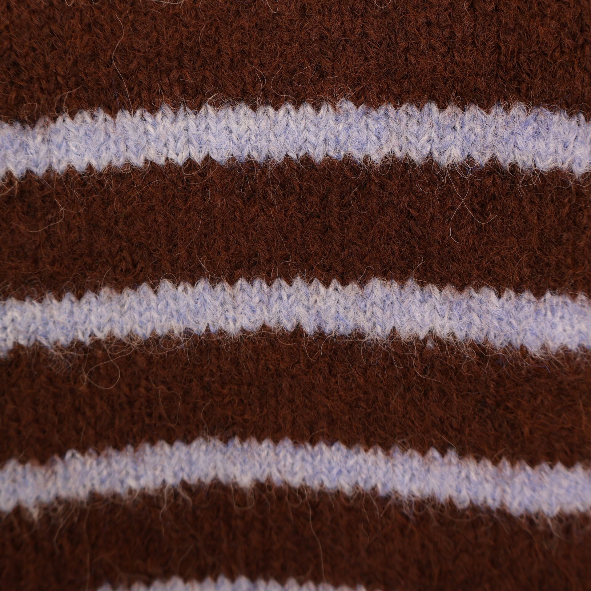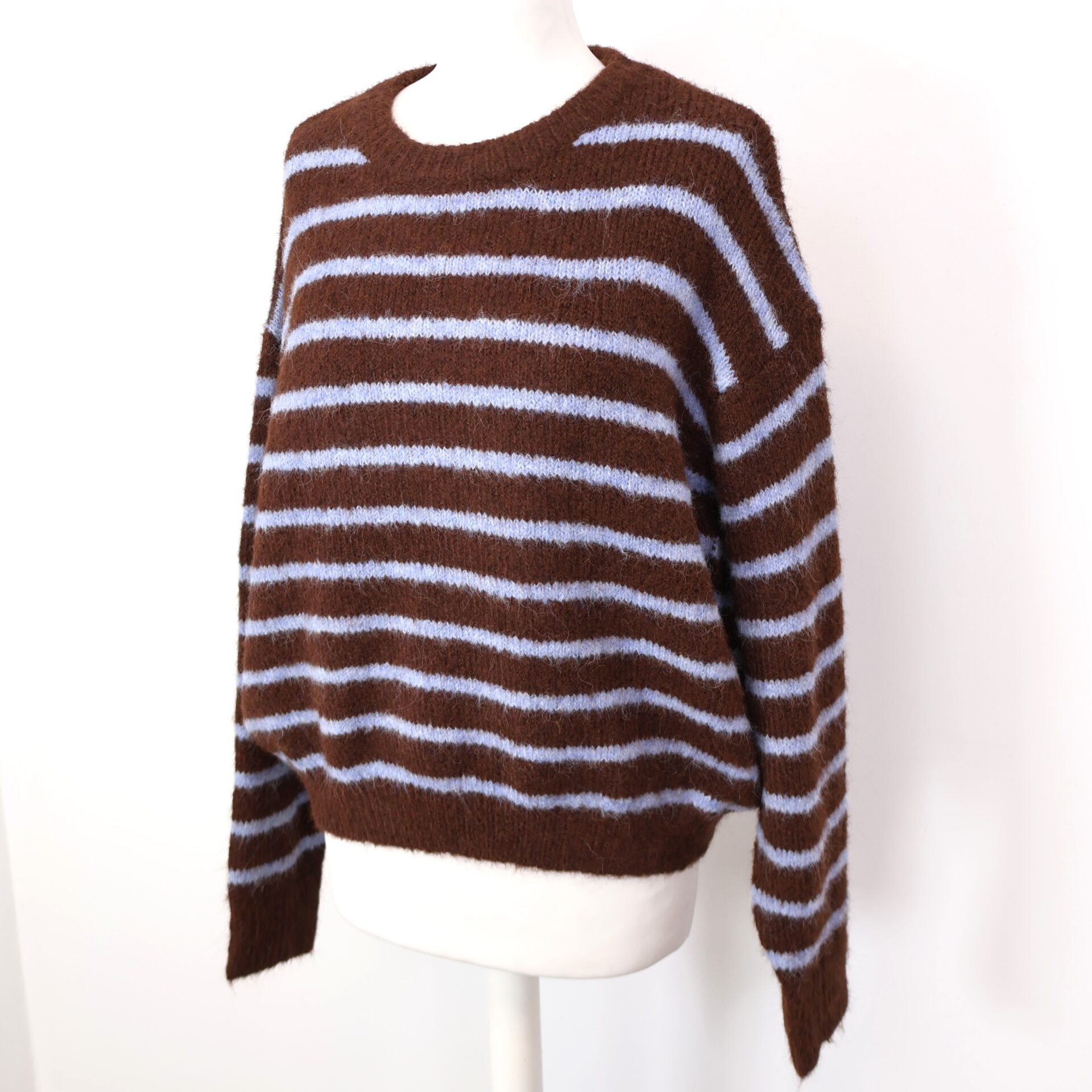 Jersey de cuello redondo confeccionado en punto de color marrón chocolate con estampado de rayas horizontales a contraste en color azul. Tejido elástico y corte oversize con manga larga caída.