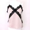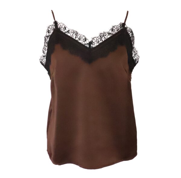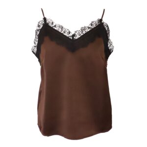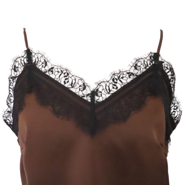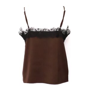 Lencera satinada chocolate con puntilla en el borde del escote en color negro. Tirantes ajustables.