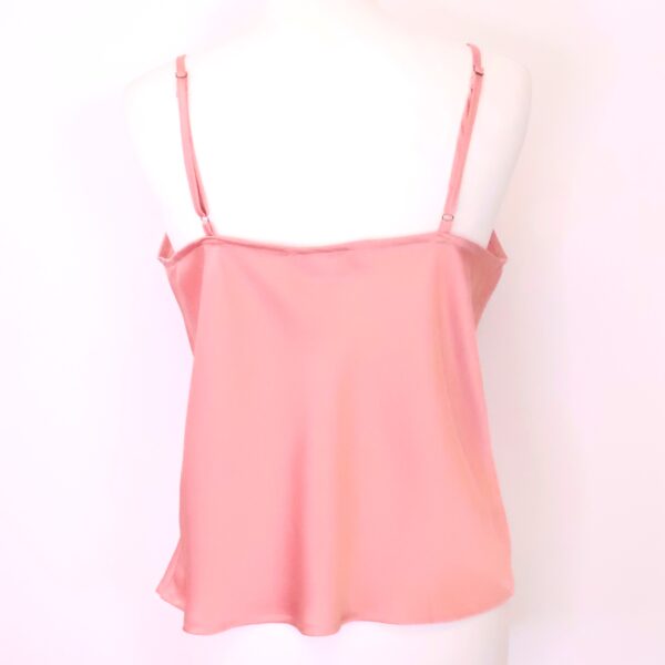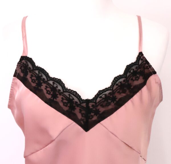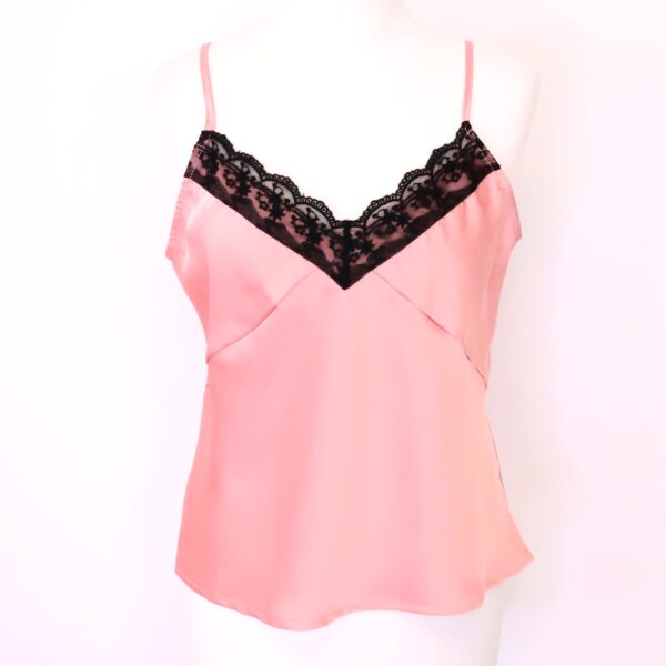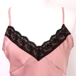 Lencera satinada rosa con puntilla en el borde del escote en color negro. Tirantes ajustables.