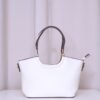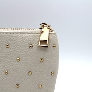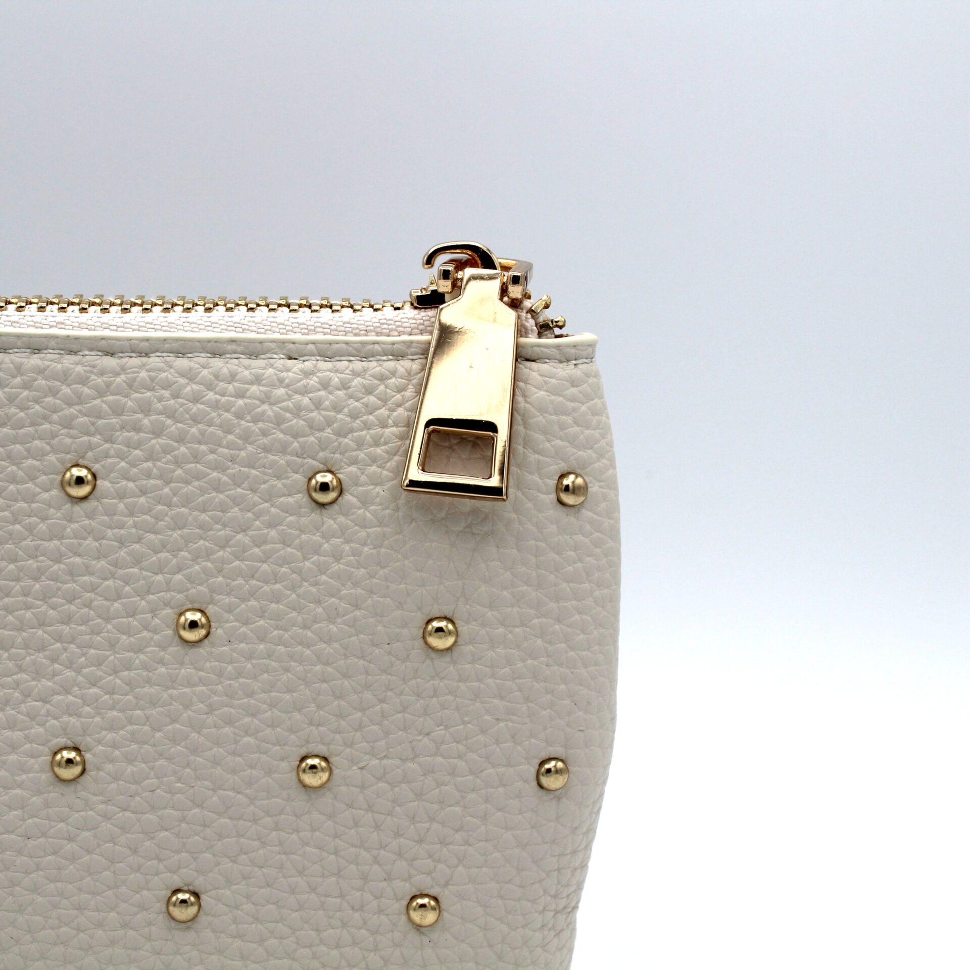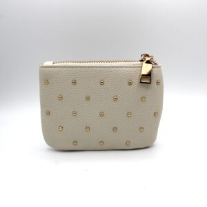 Monedero de piel en tono crudo. Decoración con tachuelas. Cremallera dorada en la parte superior.